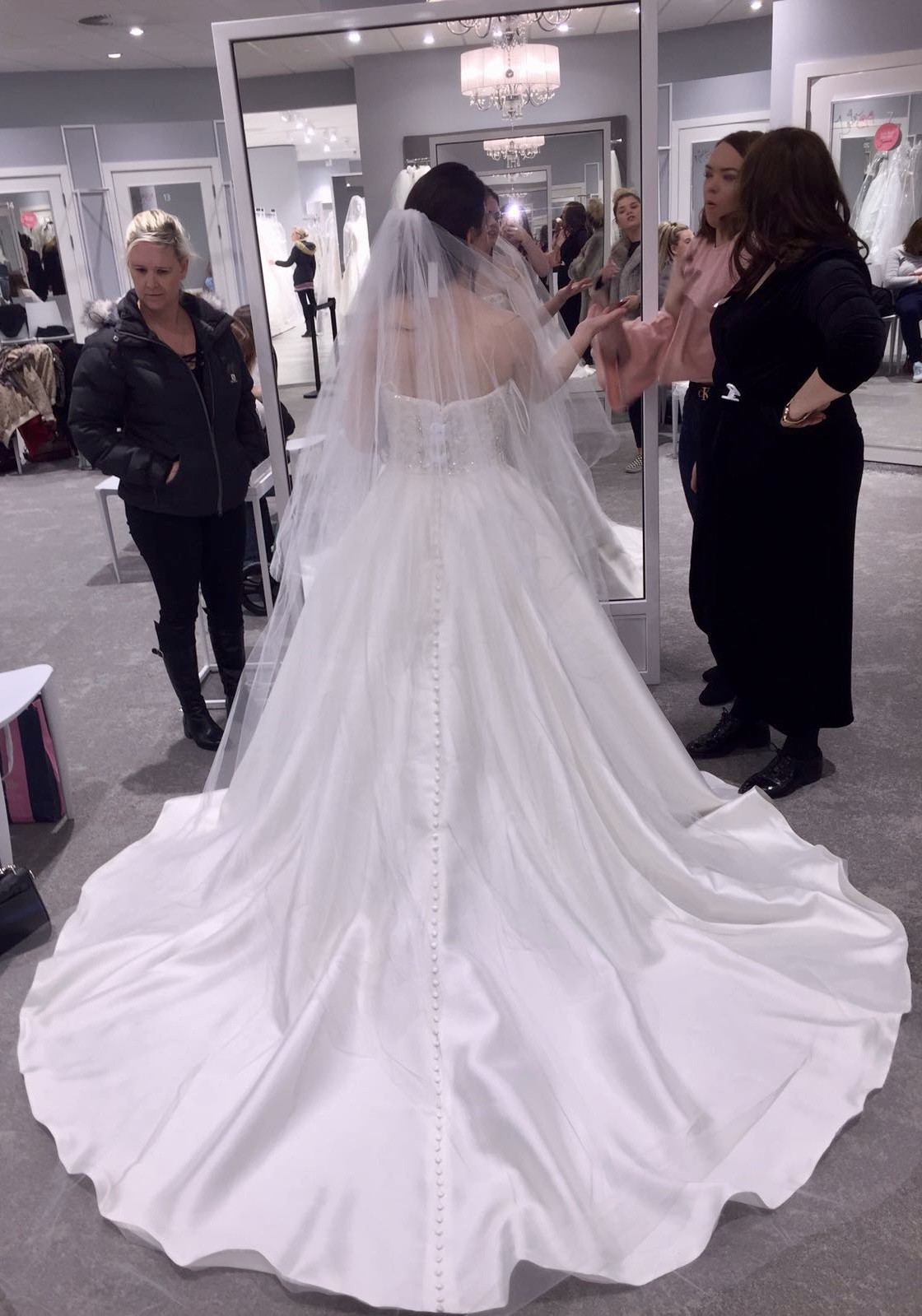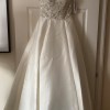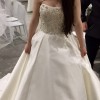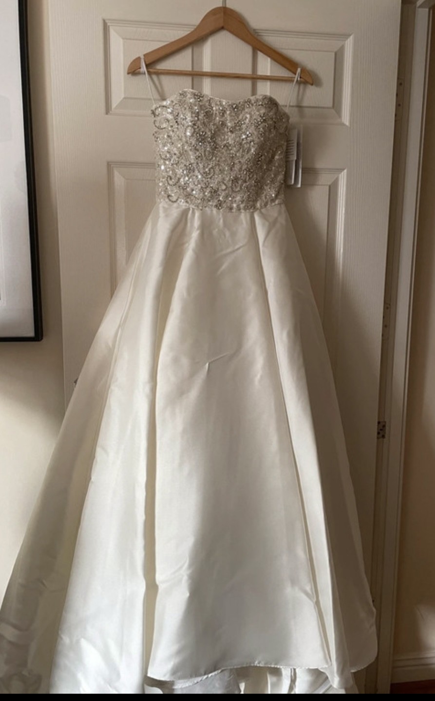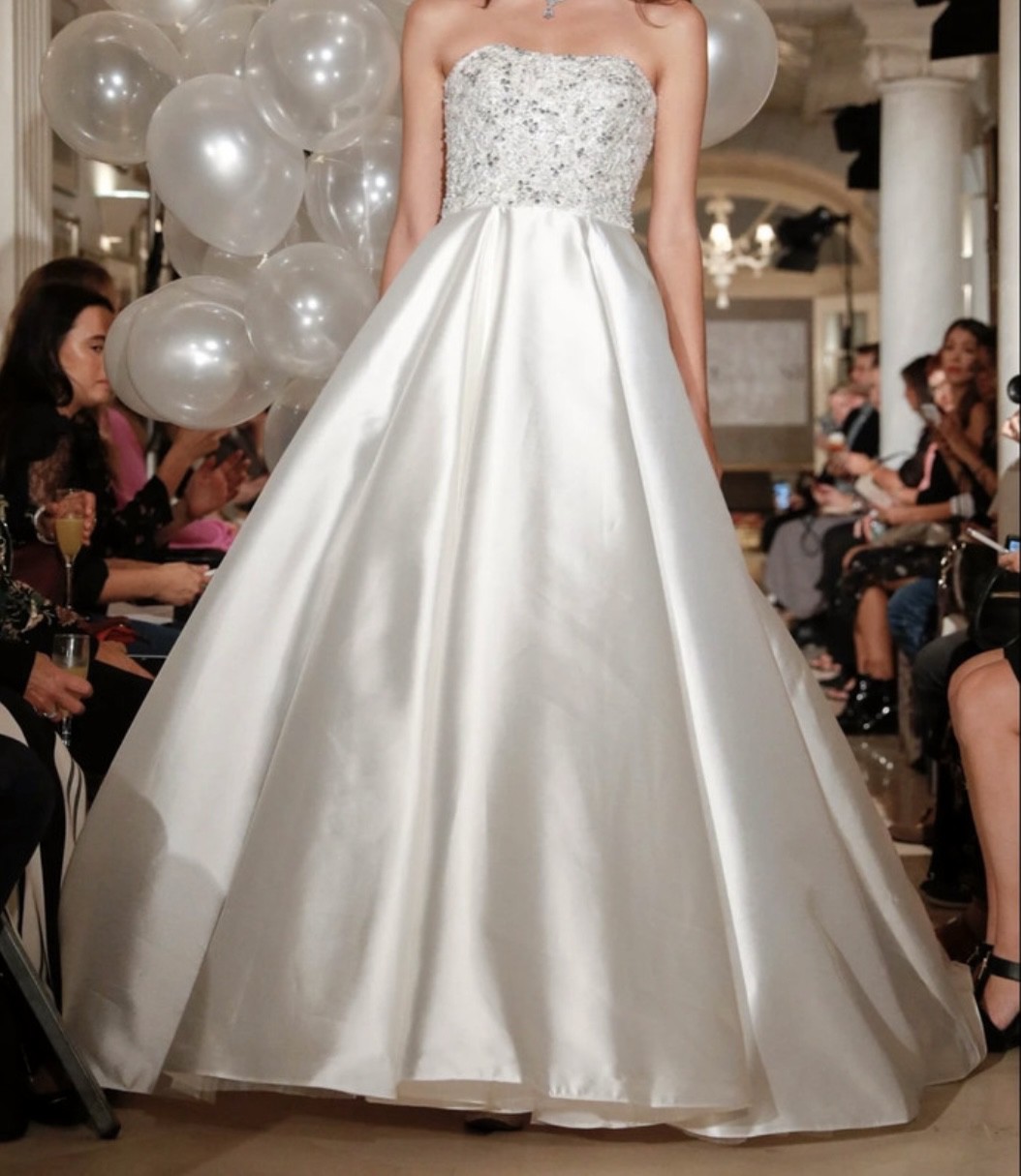 This enchanting Oleg Cassini wedding dress is a perfect choice for the modern bride seeking a timeless yet glamorous look. With its stunning ballgown silhouette, this dress effortlessly accentuates your waist while providing a flattering shape that enhances your natural beauty. The strapless design and elegant curved neckline draw attention to your collarbones, creating an ethereal yet sophisticated vibe.