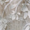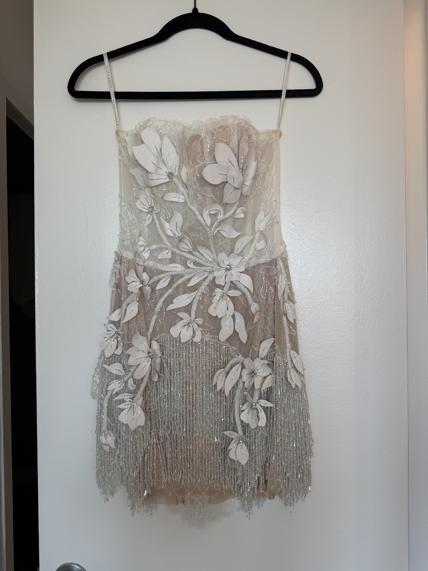 A chic strapless mini dress embellished with white floral appliqués and silver sequin details on the bodice, cascading down to a playful fringe hemline, blending tactile textures with sparkling accents for a contemporary yet elegant style.