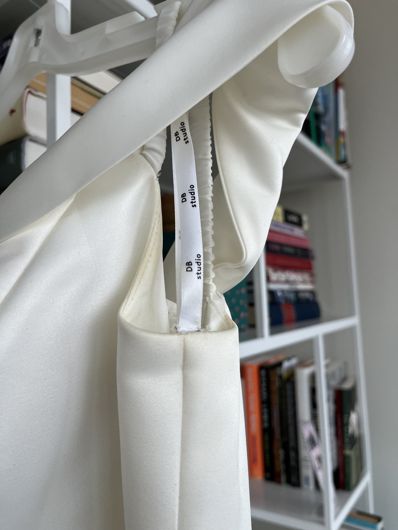 A modesty panel was added to give security at the neckline -- you can lean over to greet guests without worrying about your neckline.