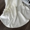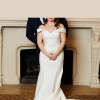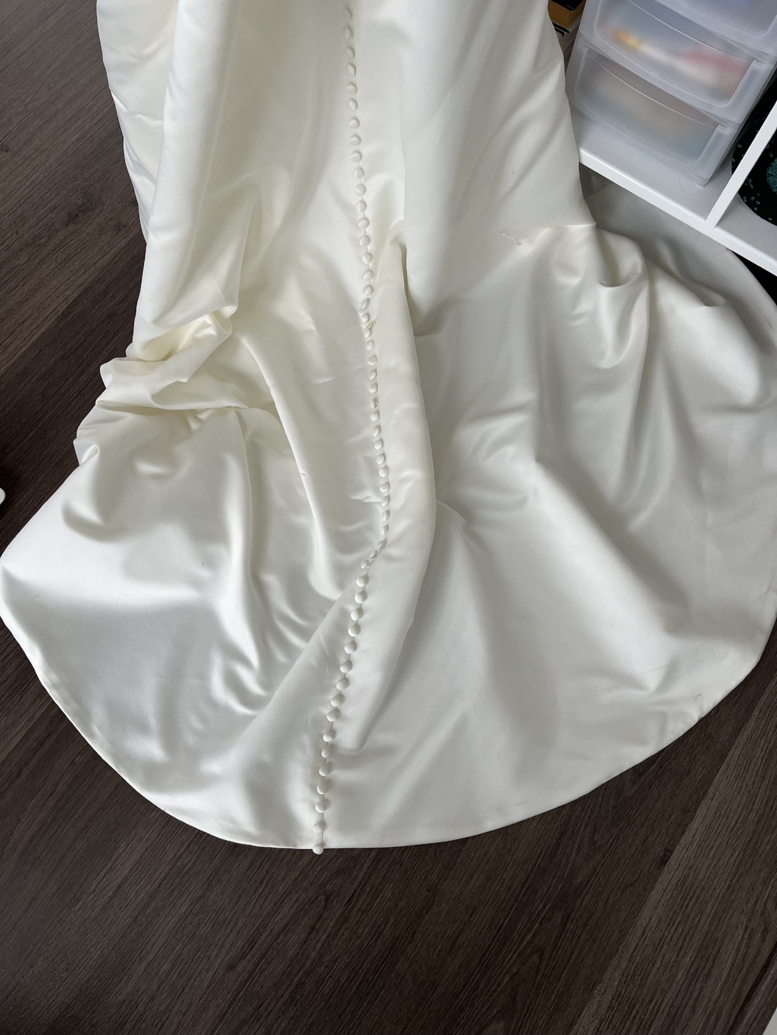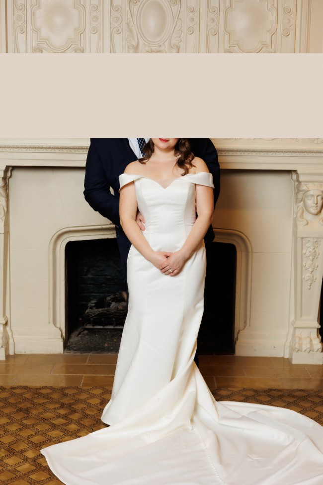 Gorgeous off-shoulder satin mermaid wedding dress. Overturned sleeves form a delicate neckline. Button detail runs the full length of the back, down through the chapel train.