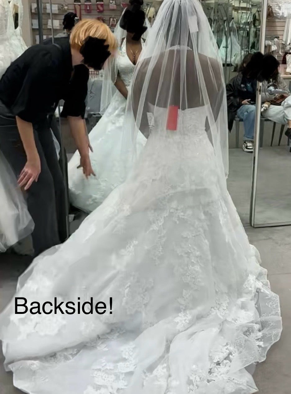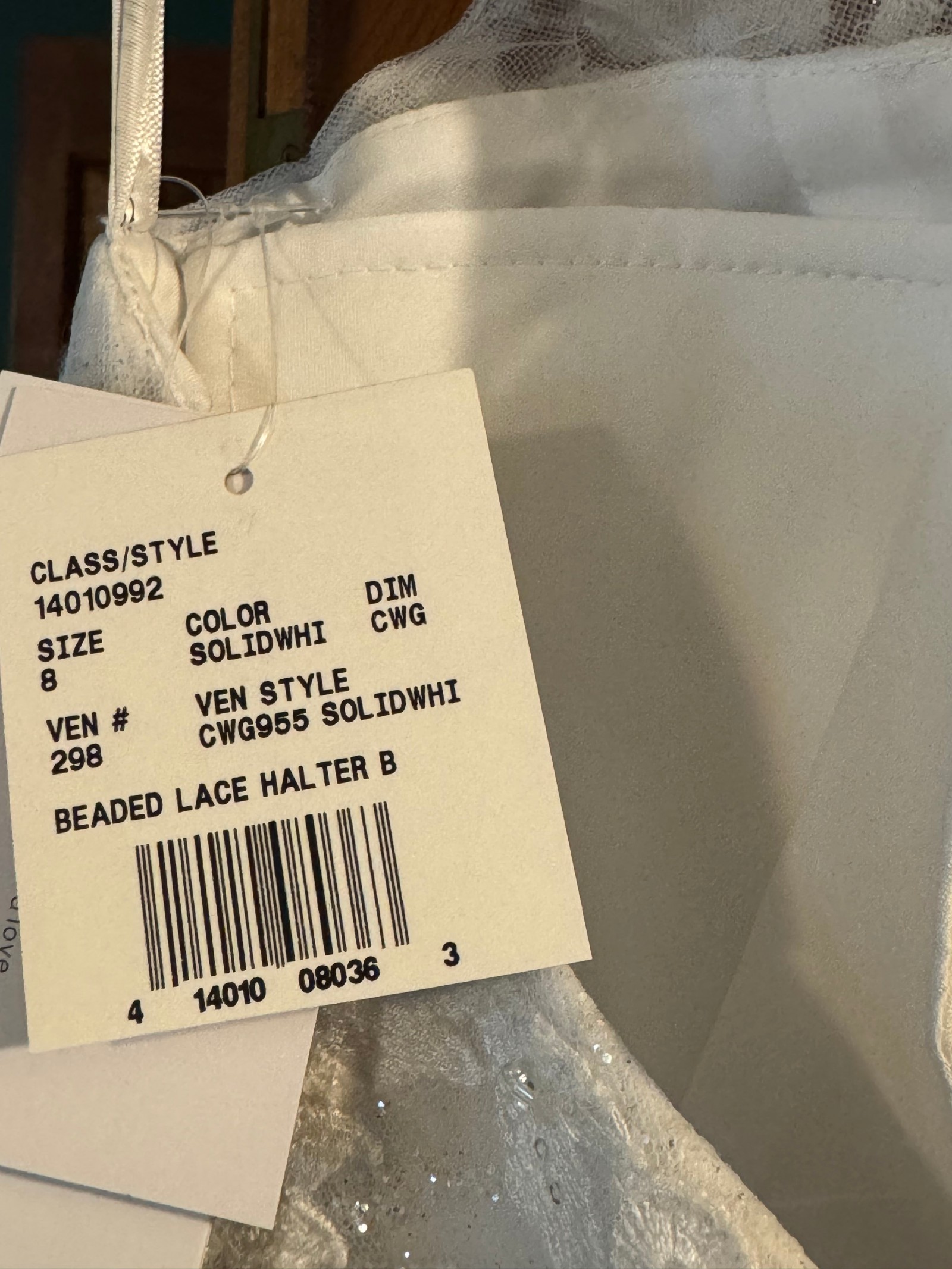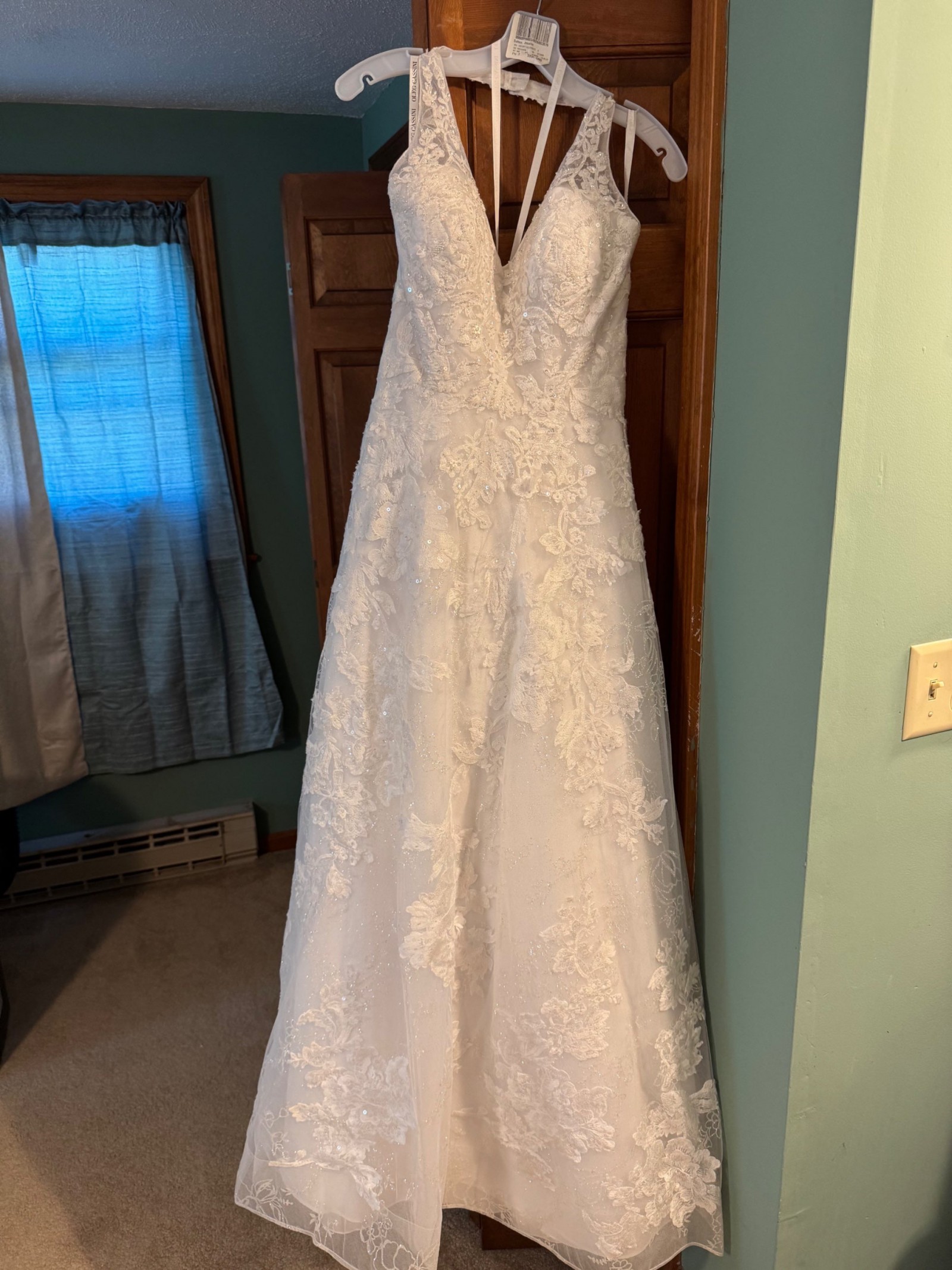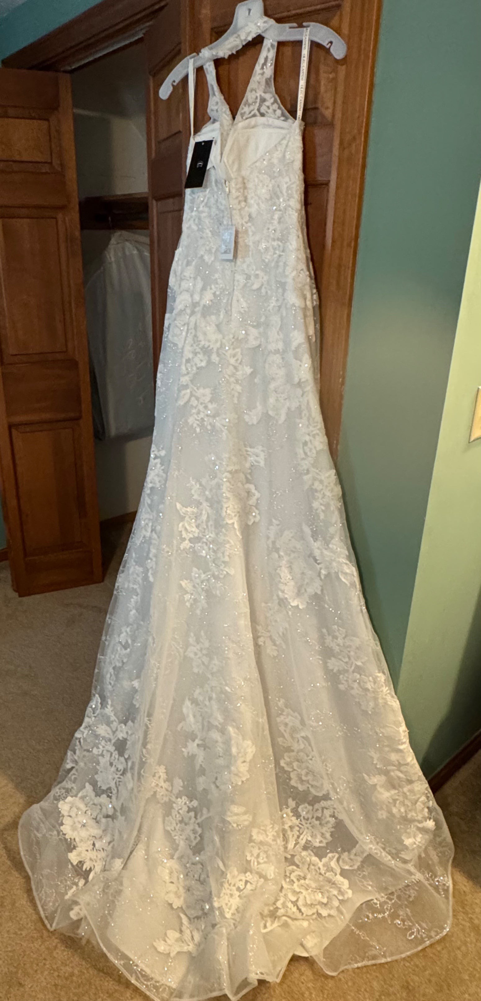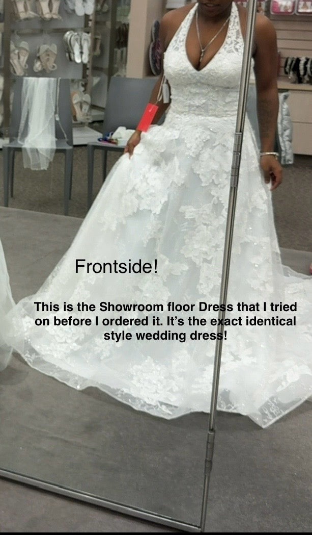 This wedding dress is the Class/Style 14010992 Beaded Lace Halter B style with "side pockets" by Oleg Cassini. I bought this dress in 2025. It has not been professionally cleaned and all items are new never been worn/unaltered. I would describe it as a wedding dress featuring , a silhouette, and a neckline.
