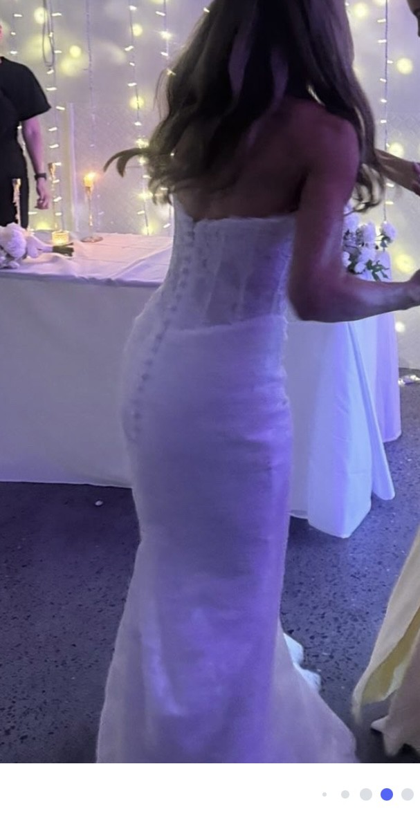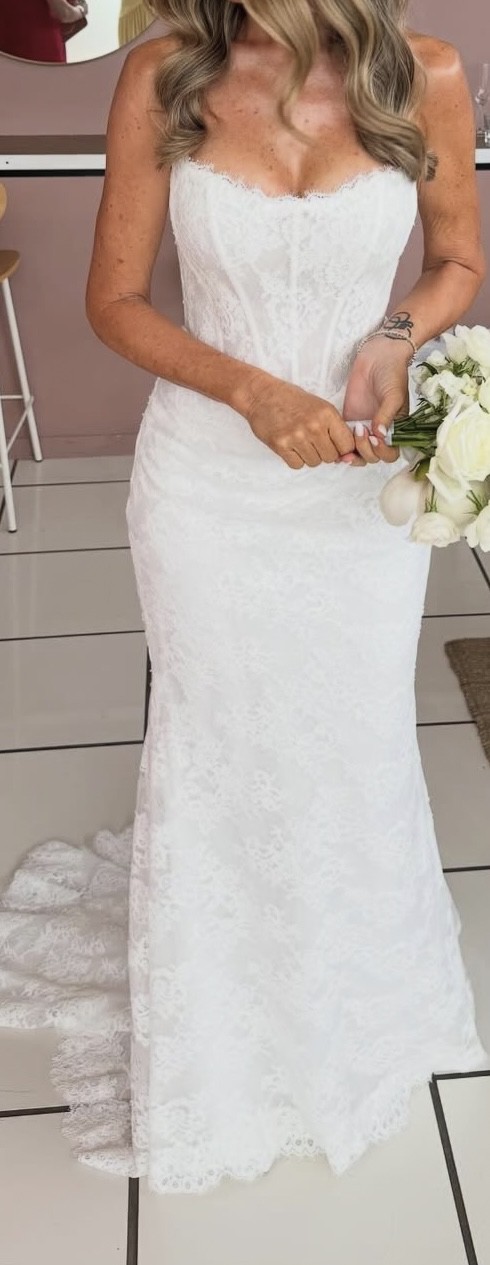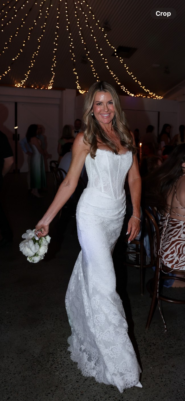 This was a modified MWL Romy design . The train has been shortened from original . Dress is being dry cleaned and is available from December 1st 2025 .