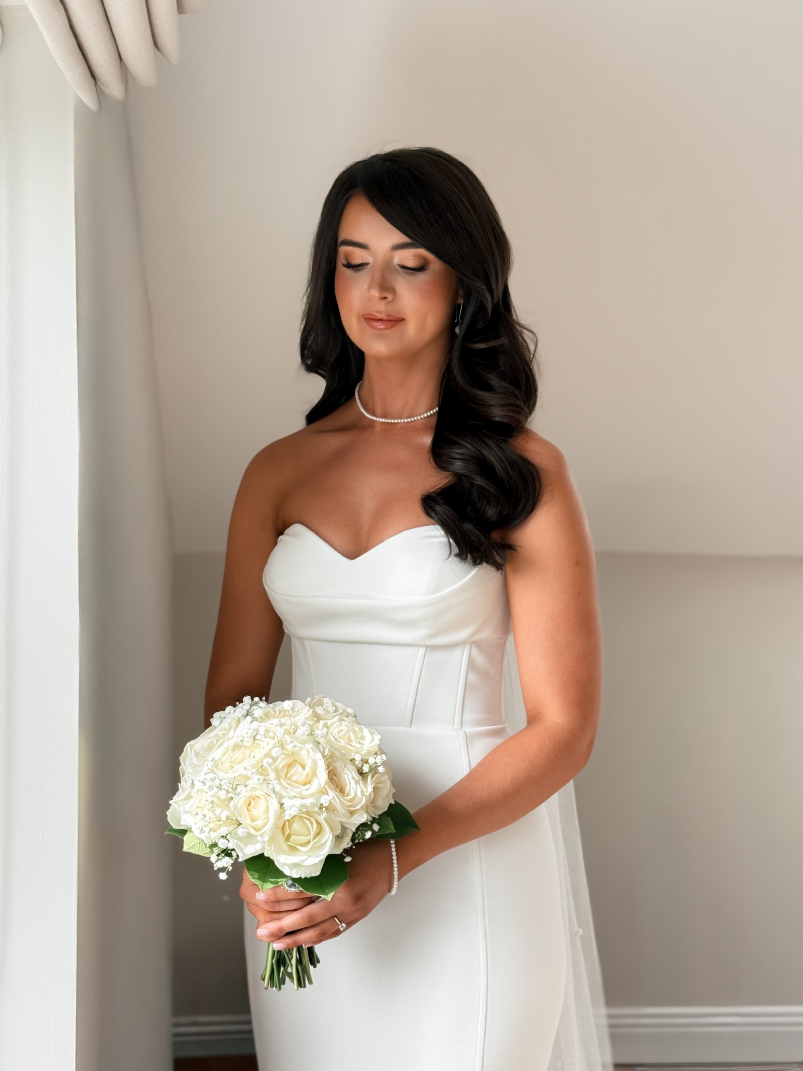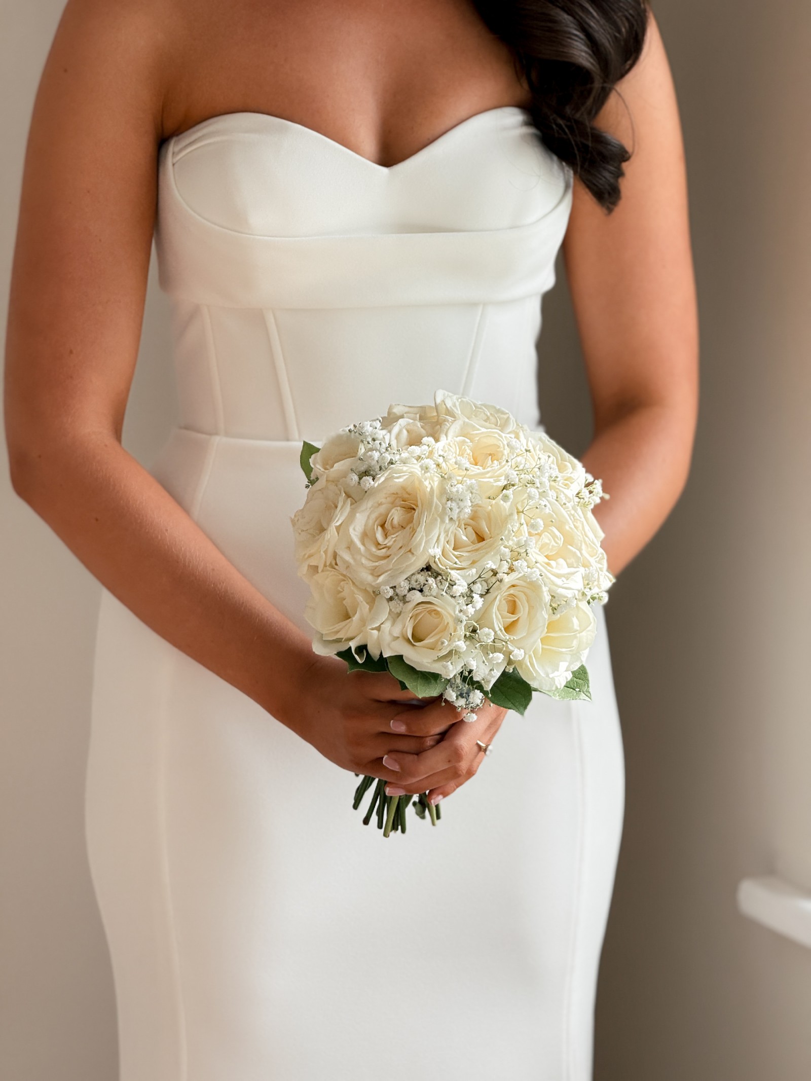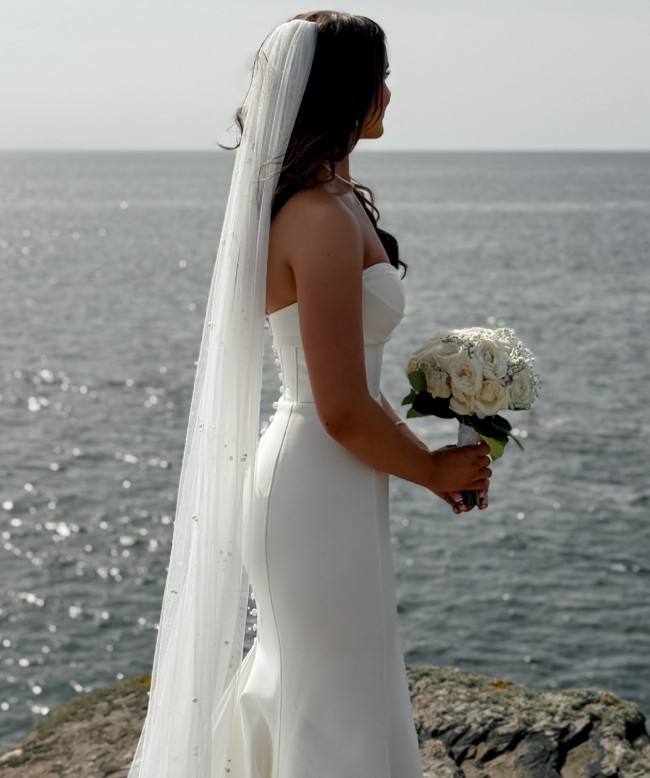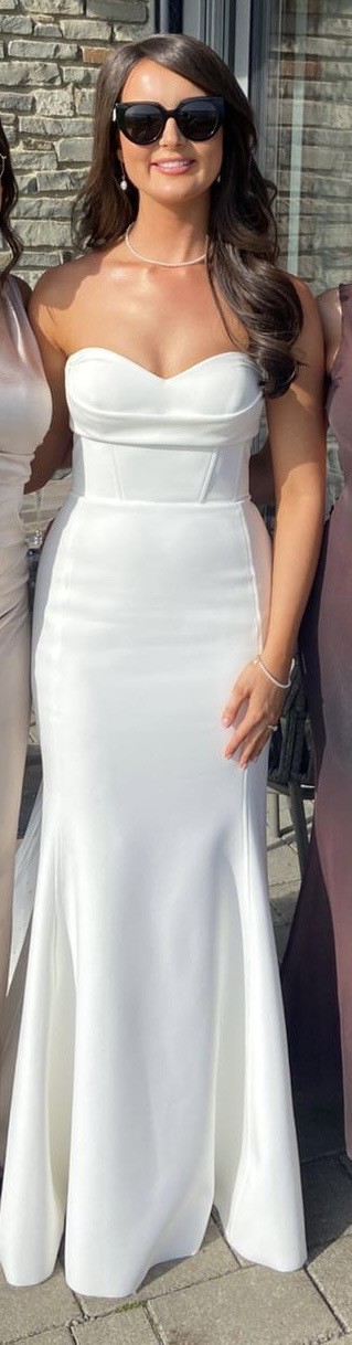 Stunning Jane Hill Fairmont gown featuring a sweetheart neckline, structured corset bodice and flattering fit-and-flare silhouette. Minimal waistband enhances the waist, and the back is finished with gorgeous button detailing all the way to under the bum. This is a heavy weighted stretch bonded crepe fabric. Includes an extra button and a hidden fabric hook to bustle the train for dancing. Worn once and professionally dry-cleaned with no visible marks or tears. Slightly altered at the waist and taken up at the length. Design features include: panelled design, waistband, buttons on zipper, sweetheart neckline, underbody detailing, fit & flare style.