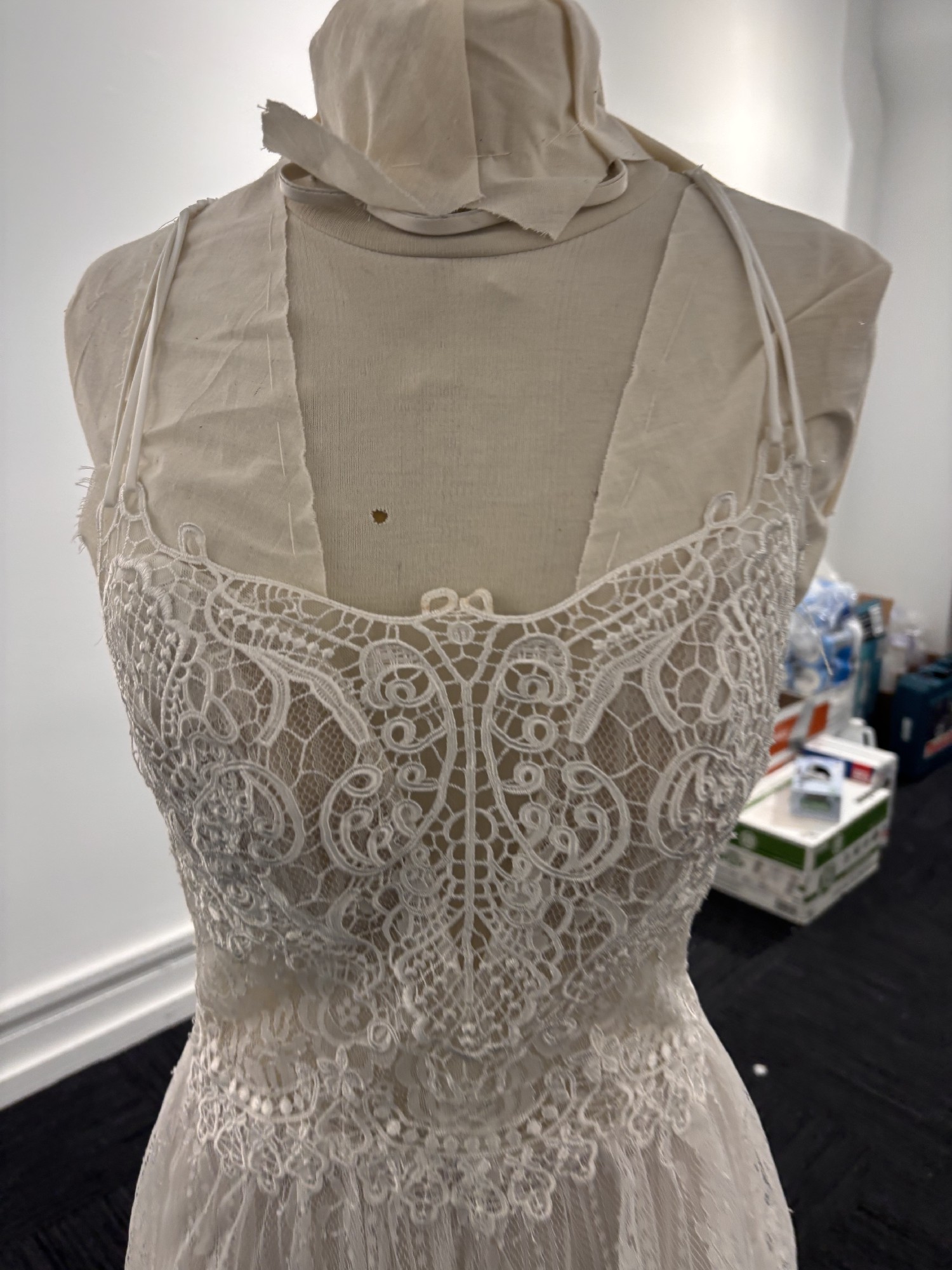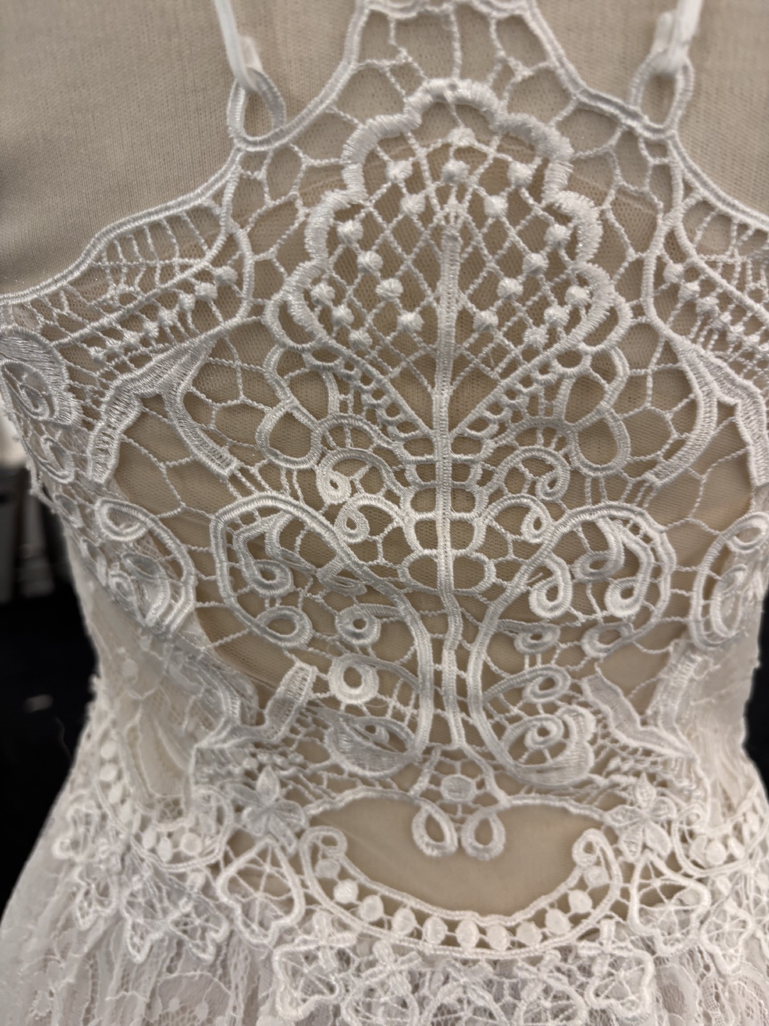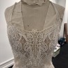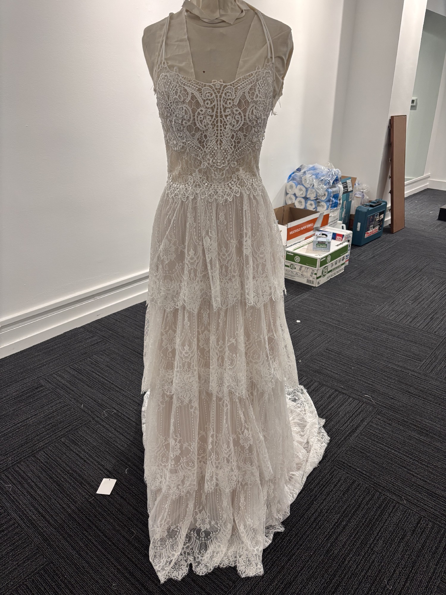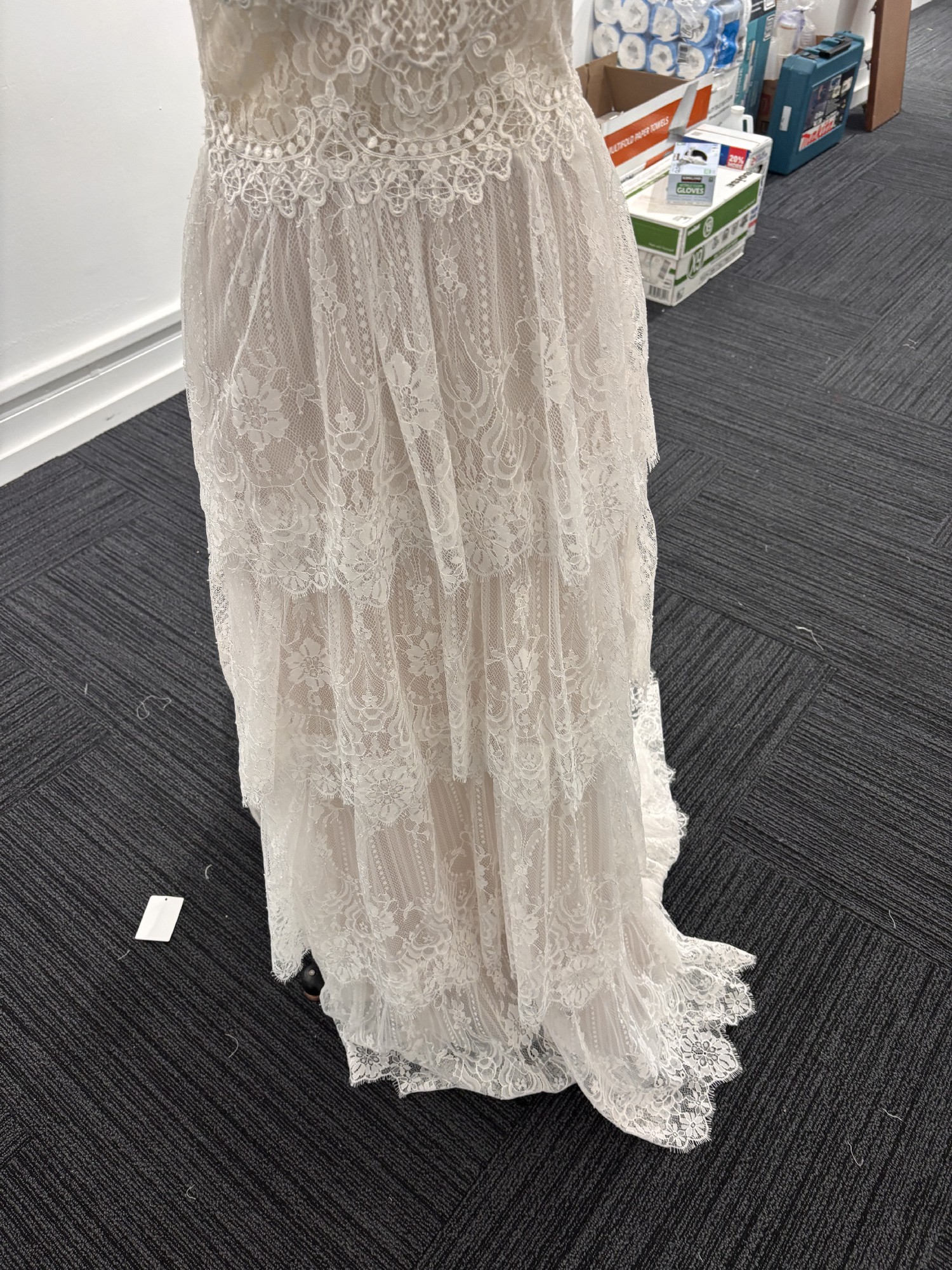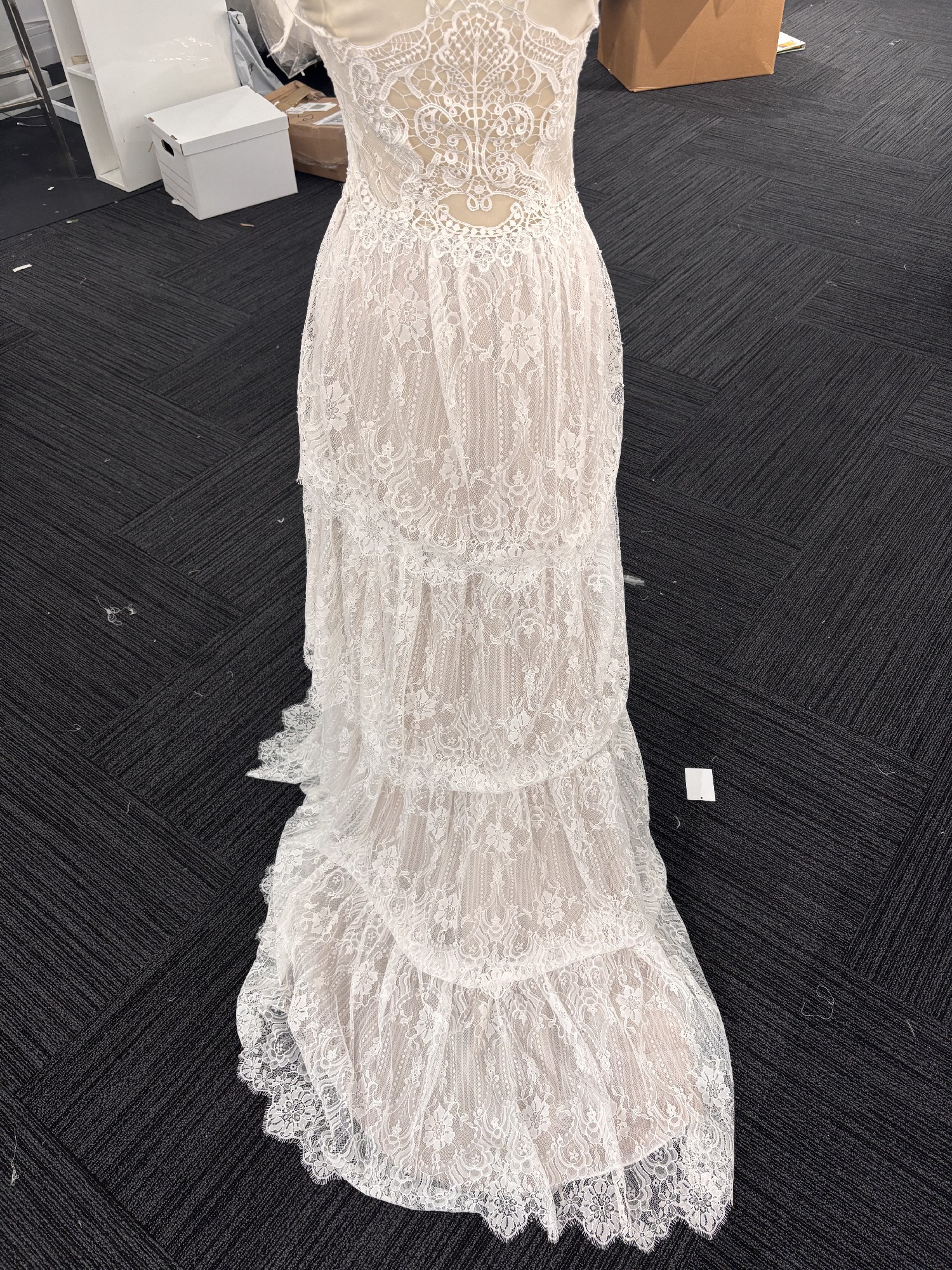 This brand-new Pronovias Grahame gown was custom ordered by a bride who never picked it up and has never been worn or tried on (only placed on a mannequin). It has a slight nude undertone with ivory lace, and is a bridal size 0 with the standard Pronovias hollow-to-hem length, offering a classic floor-length fit. The gown has been stored safely in a garment bag since its arrival, though a dry cleaning is recommended to refresh it from storage