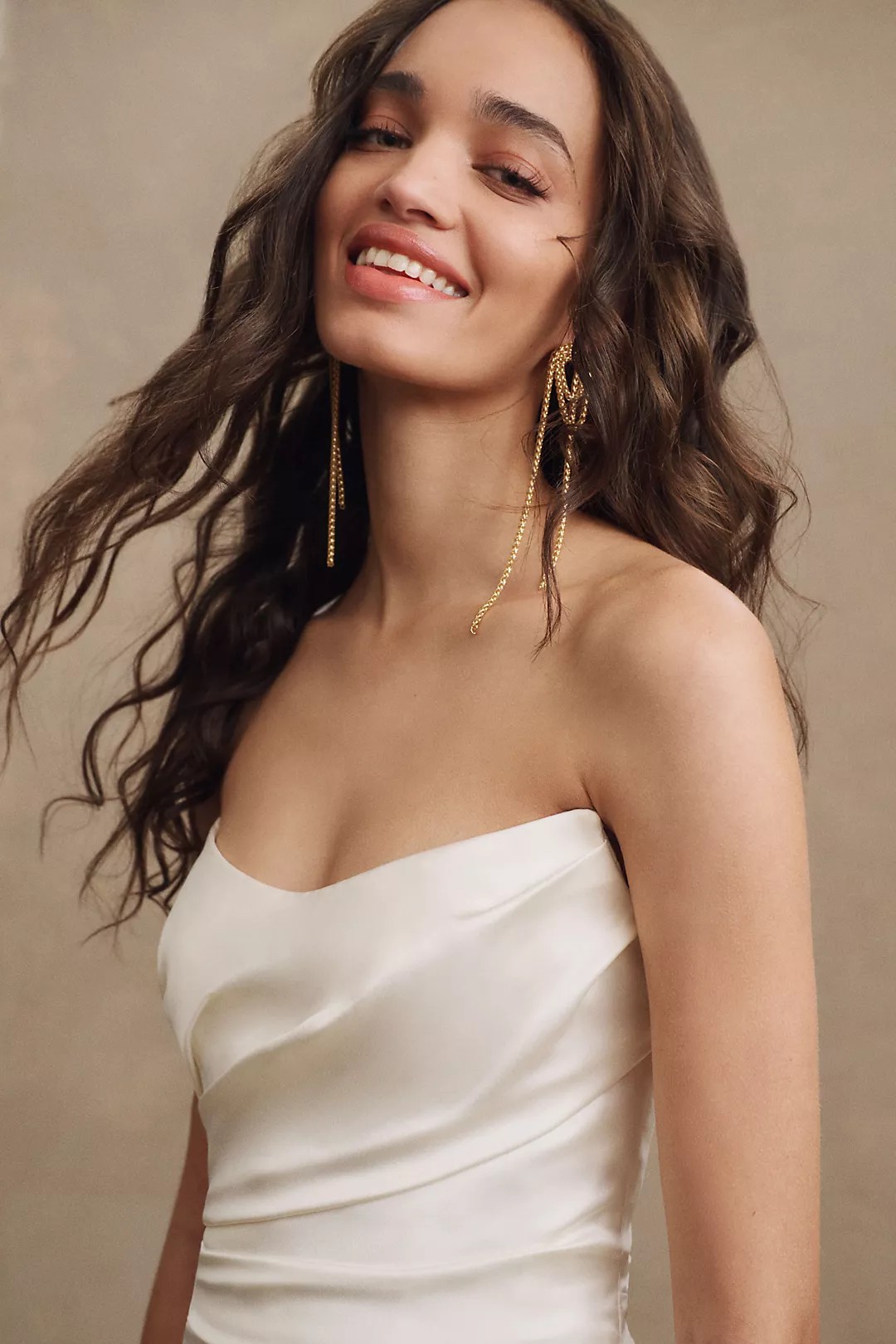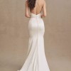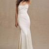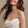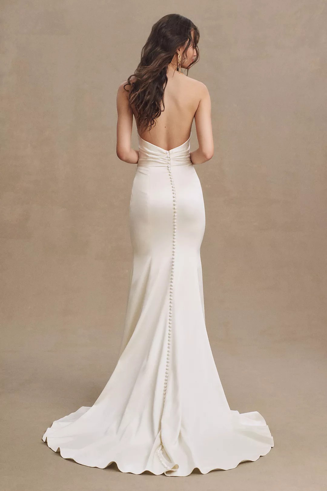 Featuring a draped, strapless bodice and finished with satin-covered buttons, the Elynor Wedding Gown stuns with a low back and elegant train.