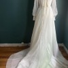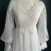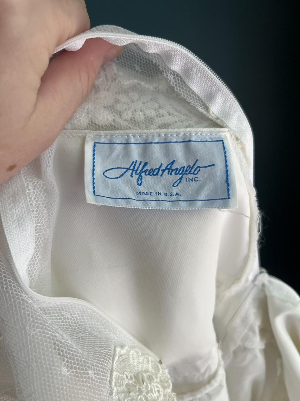 A vintage Alfred Angelo gown featuring sheer poet sleeves, a faux button up (zipper) back, a Queen Anne neckline and a fitted bodice. This dress is utterly lovely, the skirt of the dress flows very beautifully. There are really wonderful details to this dress, opalesque sequins and double layers on the sheer sleeves.