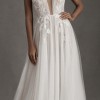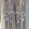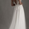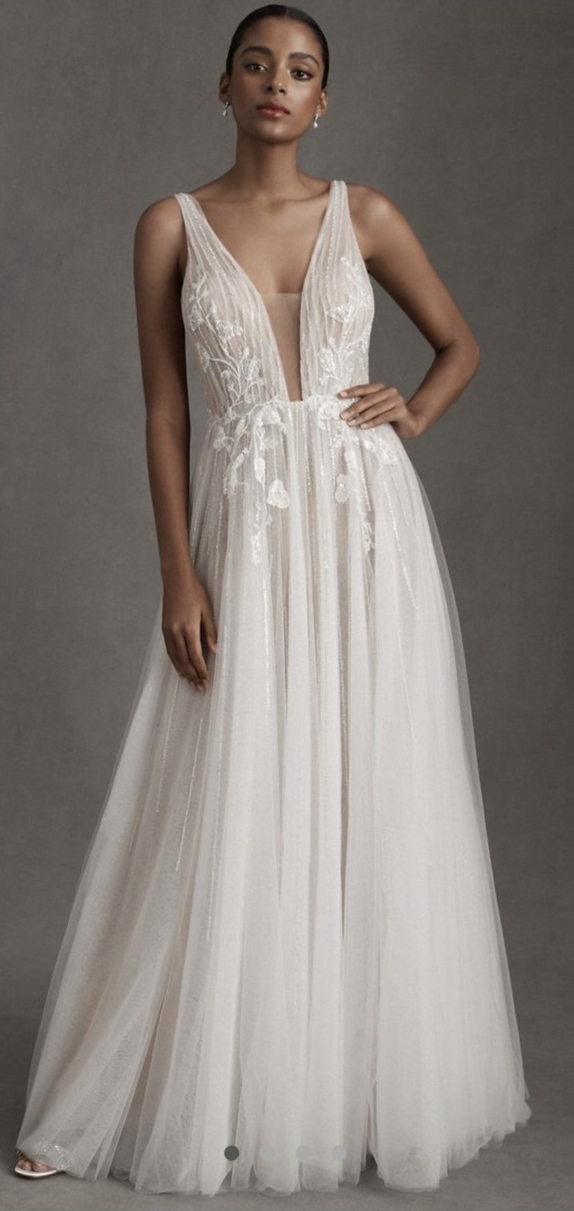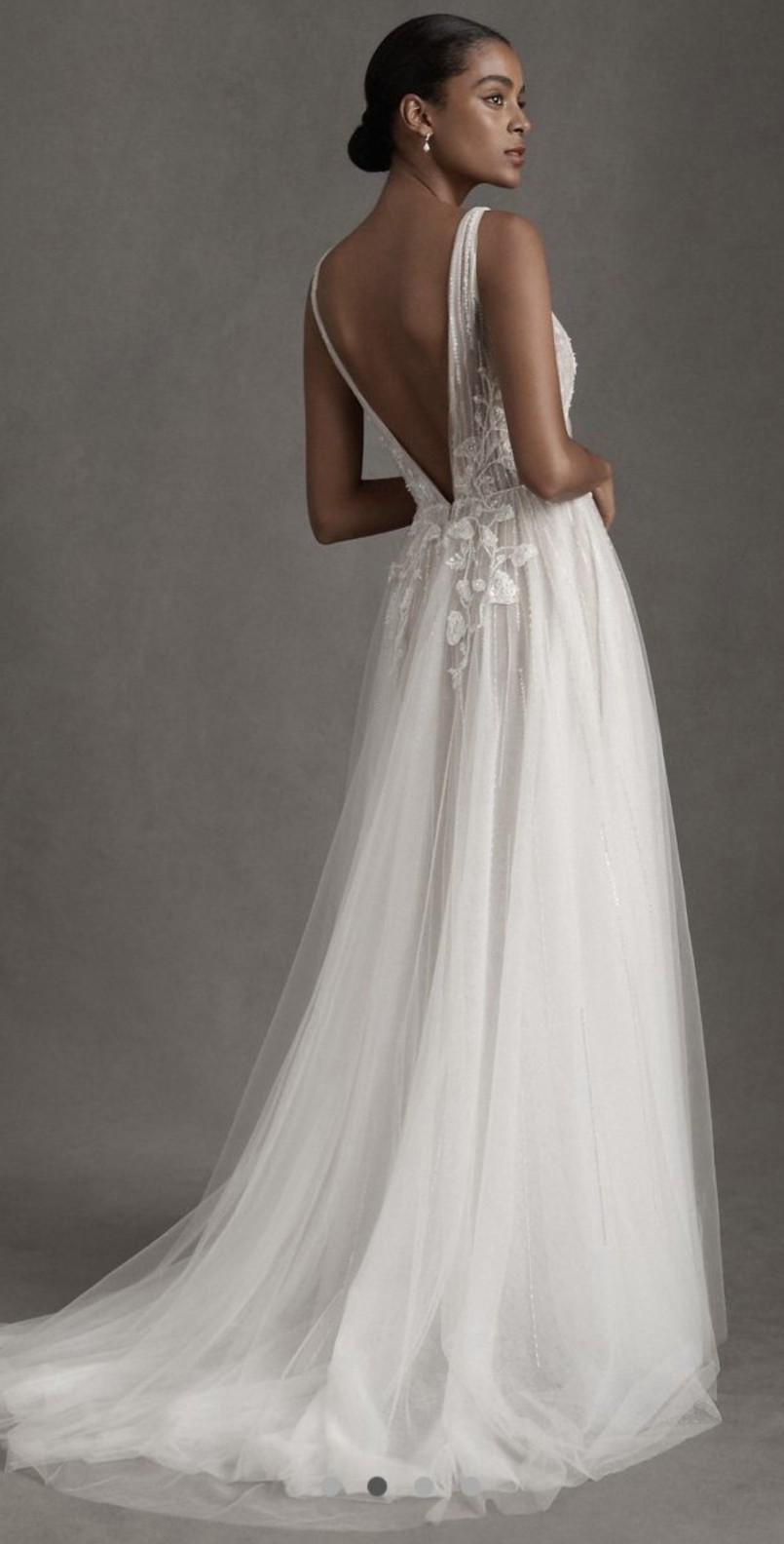 From the designer: "The Watters January Wedding Gown is a showstopper with sparkling, fairy-tale glamour. Featuring icicle beading on the bodice alongside hand-embellished flowers, it falls into a glittering tulle skirt that cascades from the natural waist. Slightly extending into a romantic tulle train, this plunging v-neck A-line evokes a princess-style charm."