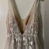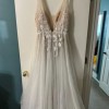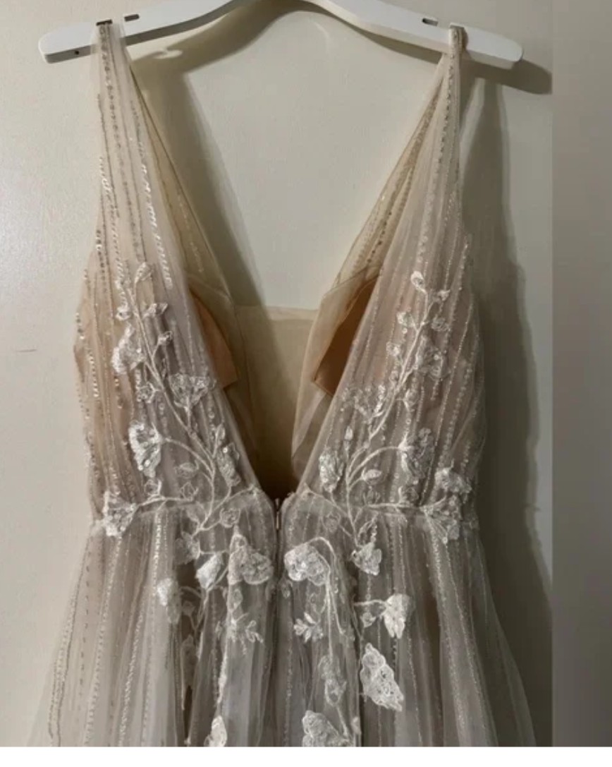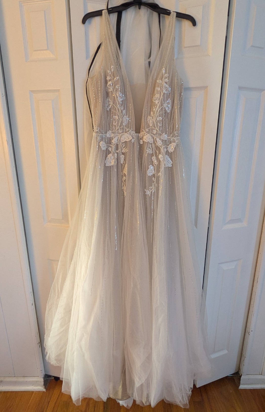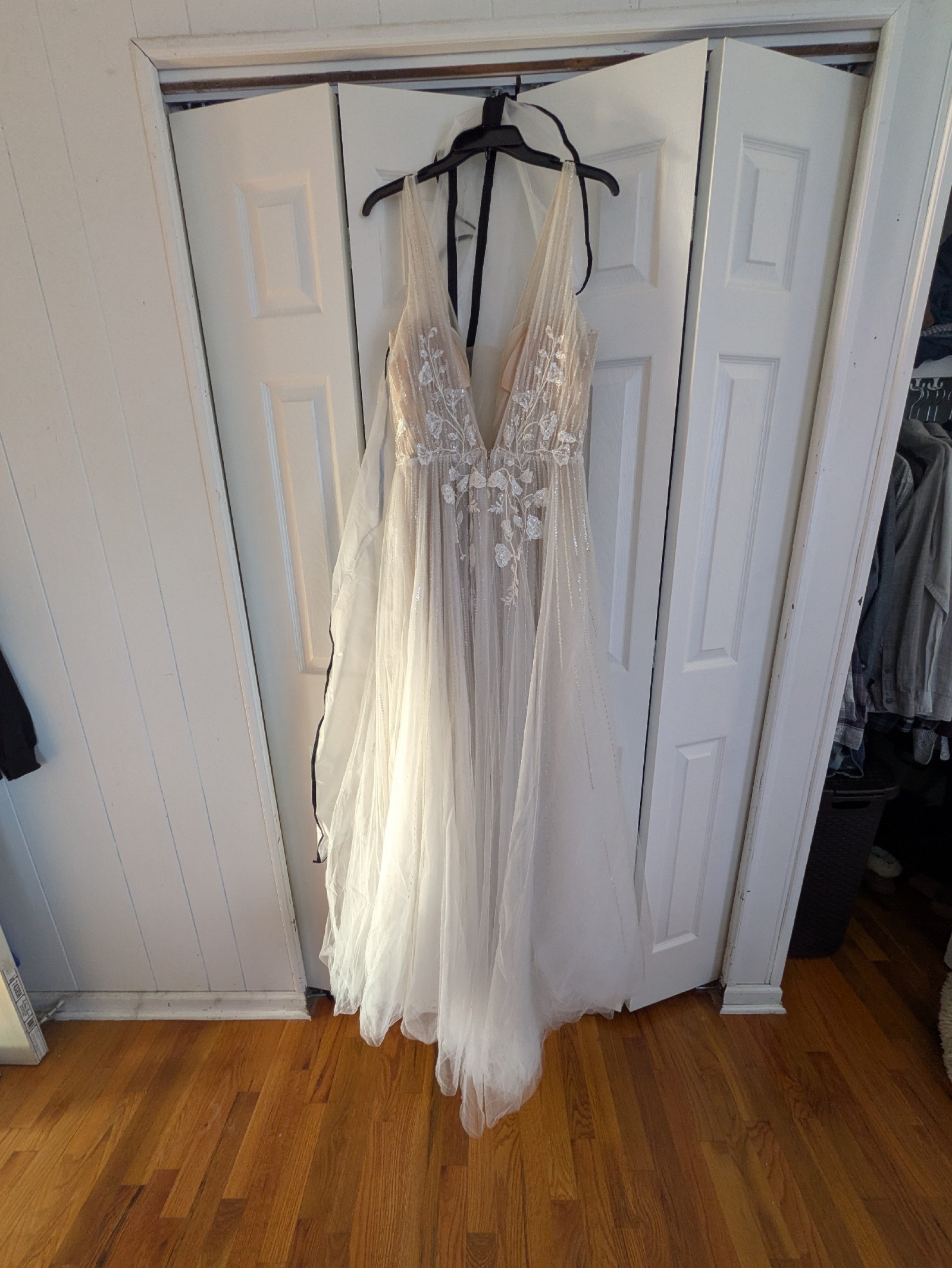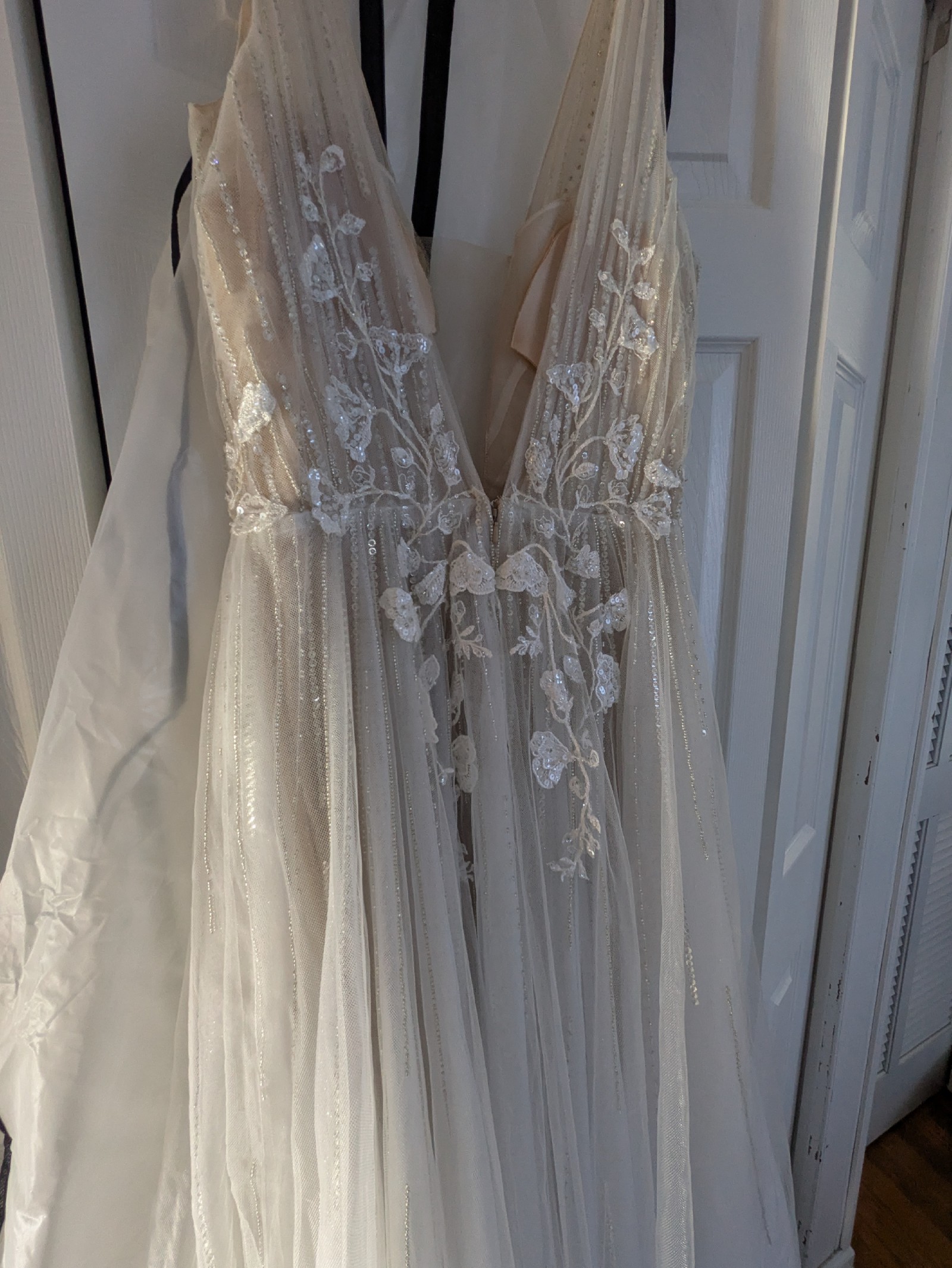 This is a gorgeous sample dress, I just wound up going with a different dress that fits better with my venue. I have only taken it out of the box to try it on originally and then for photos for this listing. I did not notice any imperfections, but as a sample dress there may be some small things. I am a street size 8 and this 10 would have needed altered for me, so it appears to be true to size. I'm happy to answer any questions and hope this finds it's way to its perfect bride!
