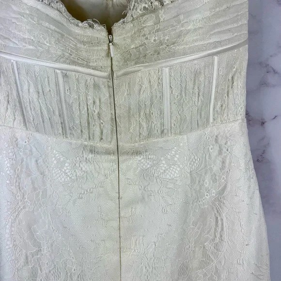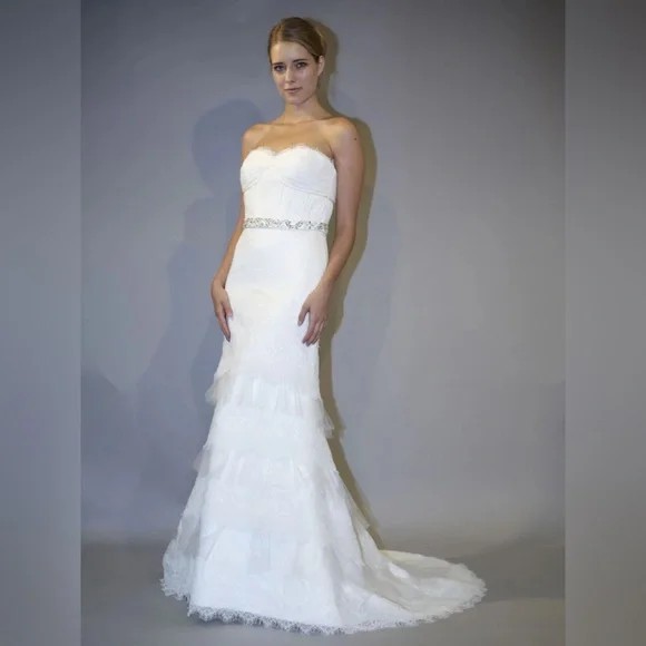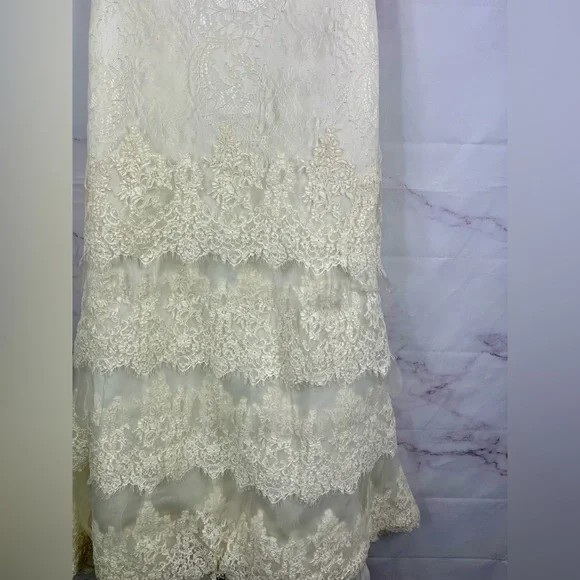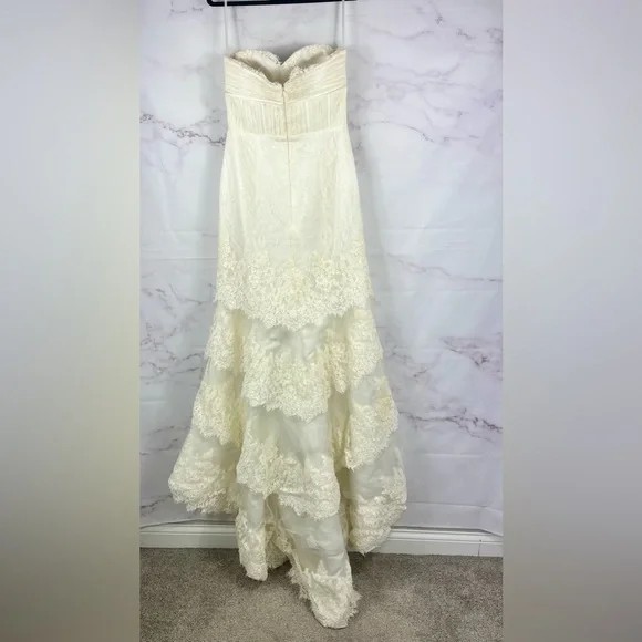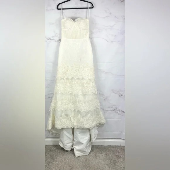 bridal, formal, strapless, lace, sweetheart, ivory, sample, a-line, mermaid-inspired, romantic, timeless, boho-classic, vintage-inspired, tiered, scallop, elegant, beaded, fitted-bodice