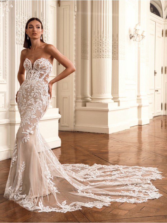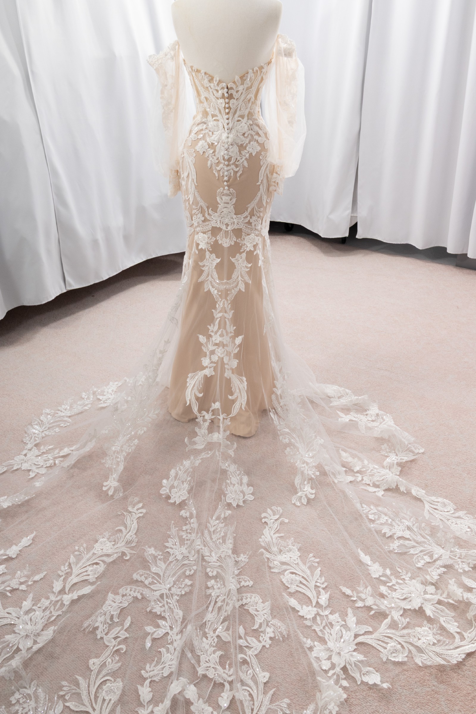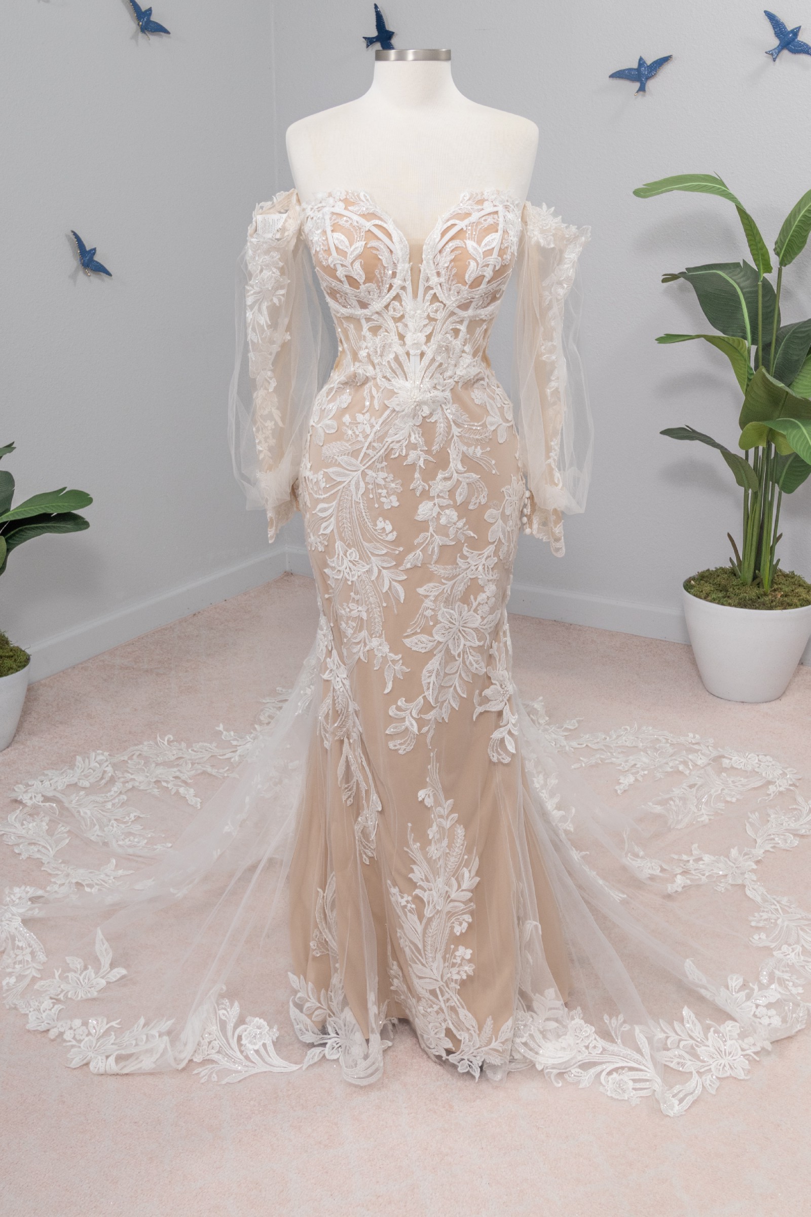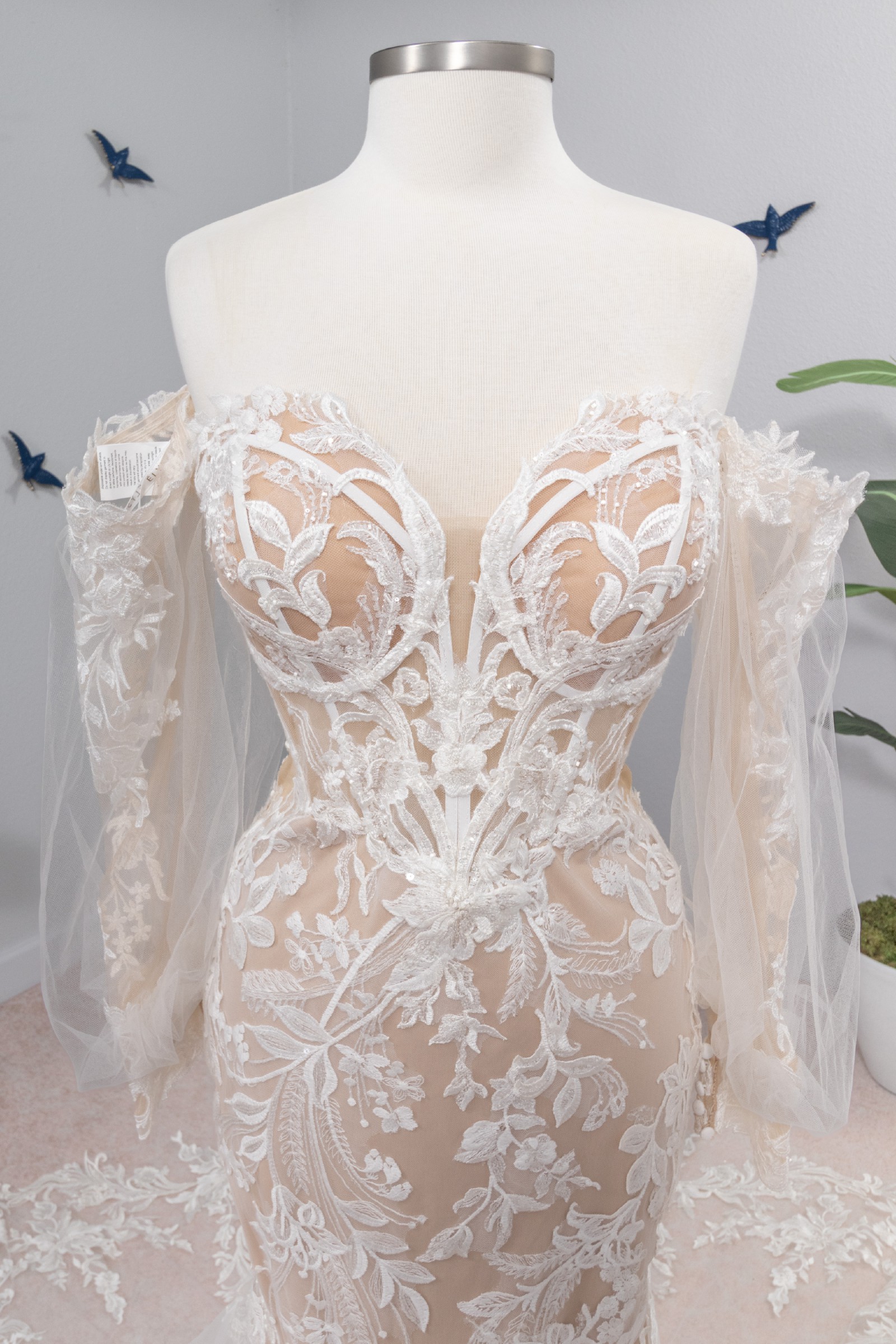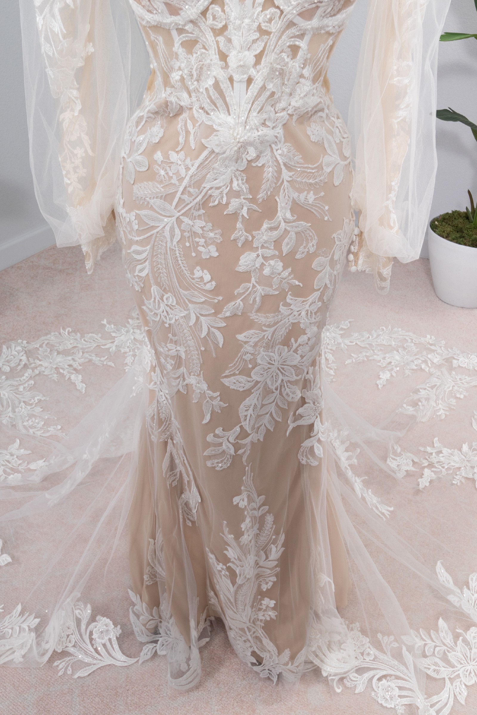 Fairy 23248 by Elysee: A breathtaking masterpiece! FAIRY brings such romantic allure with its intricate and unique botanical embroidered lace from the sexy illusion bodice all the way down to the eye-catching sculpted train. This stunner features detachable botanical lace long sleeves to create a luxurious and elegant bridal look. Your wedding guests will be sure to do a double take.