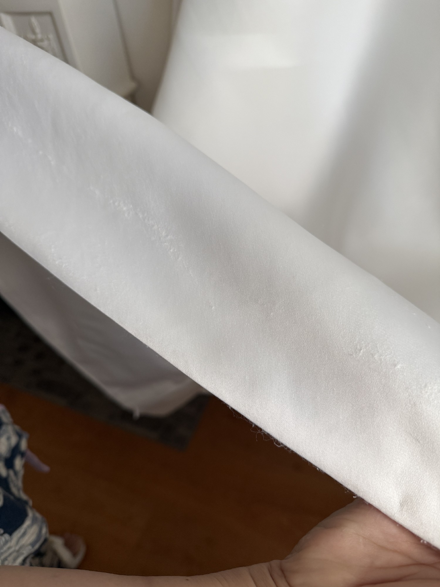 Has been professionally dry cleaned and has no marks. Only sign of wear is at the end of the train where there is some fraying as seen in the pictures.
