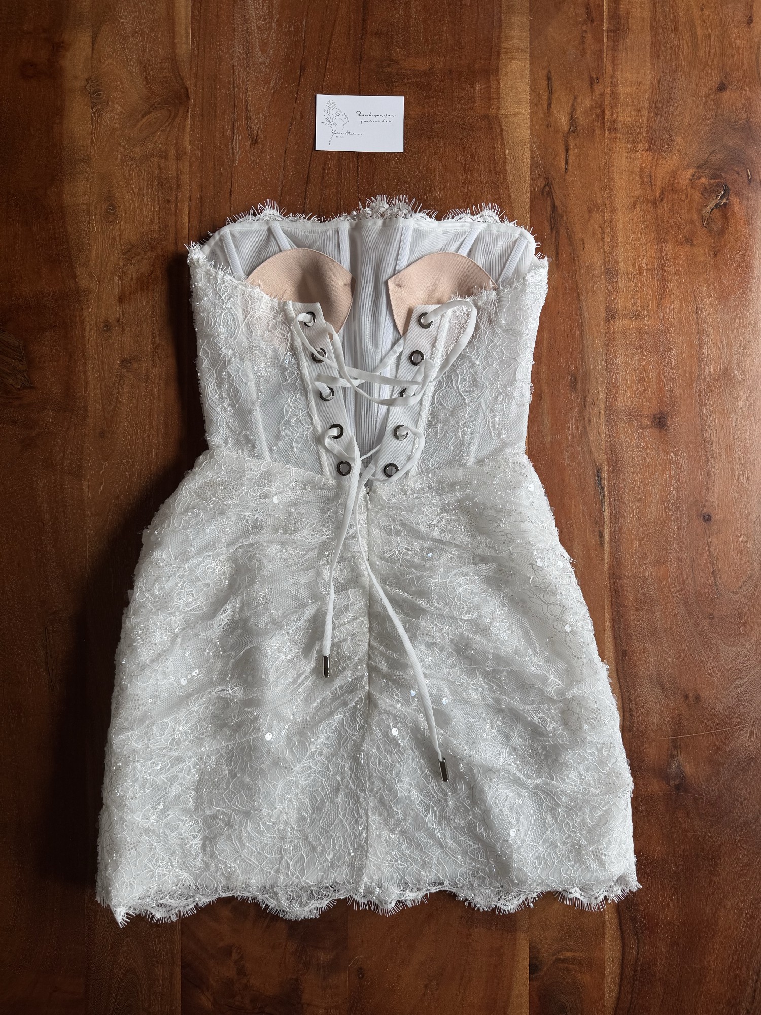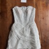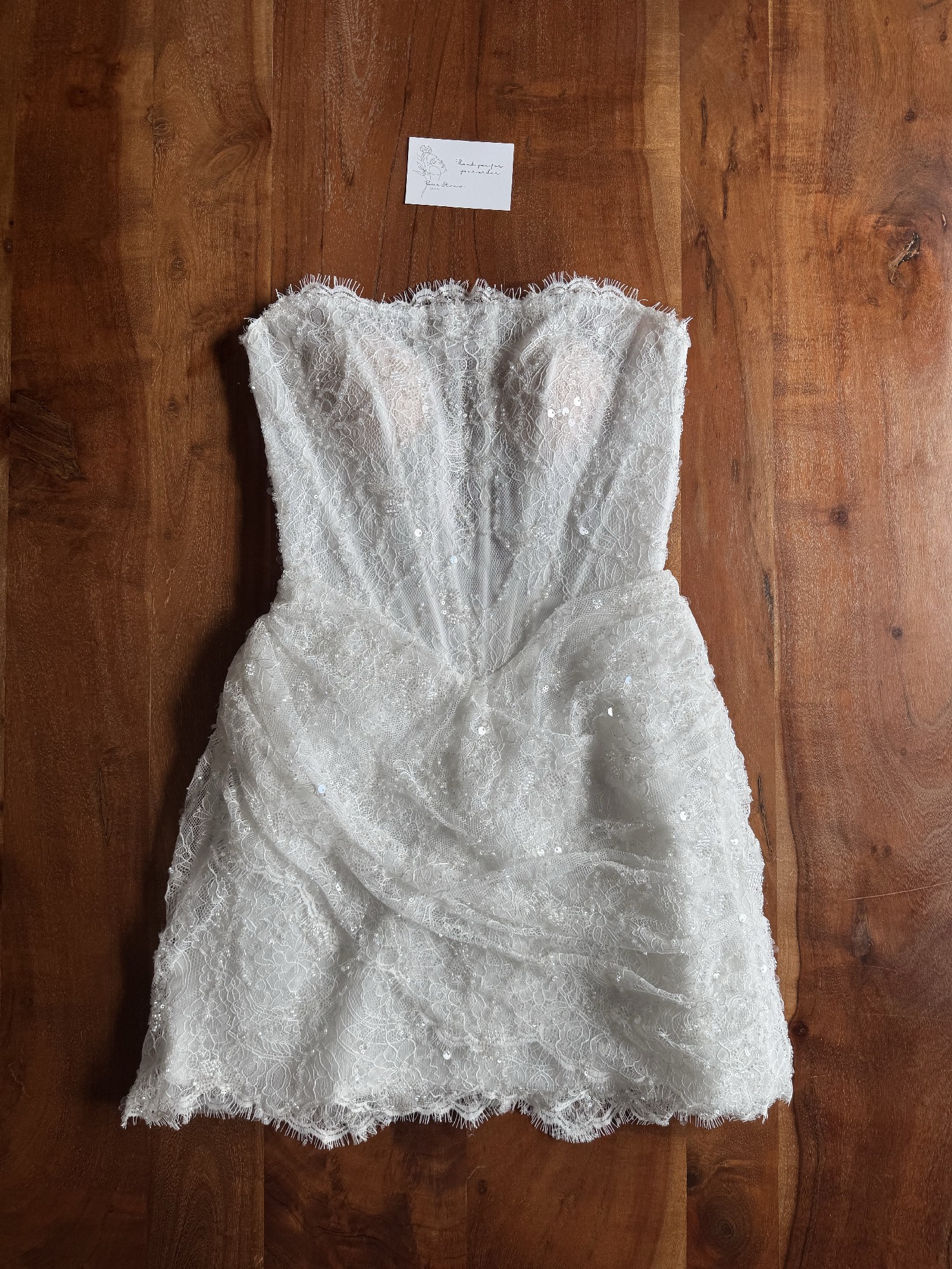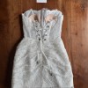 The Hope mini dress features an exquisite strapless corset bodice made from delicate French lace, showcasing precise boning that contours the figure for a flawless silhouette. The intricate lace is interwoven with shimmering beadwork, giving the gown a soft, ethereal glow. A standout feature of the Hope dress is its draped lace overlay, meticulously hand‑gathered at the waist to create a flattering, wrap‑inspired effect that adds movement and texture. The scalloped lace hem adds a romantic touch, perfect for the bride who desires a blend of modern style and timeless femininity.
