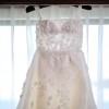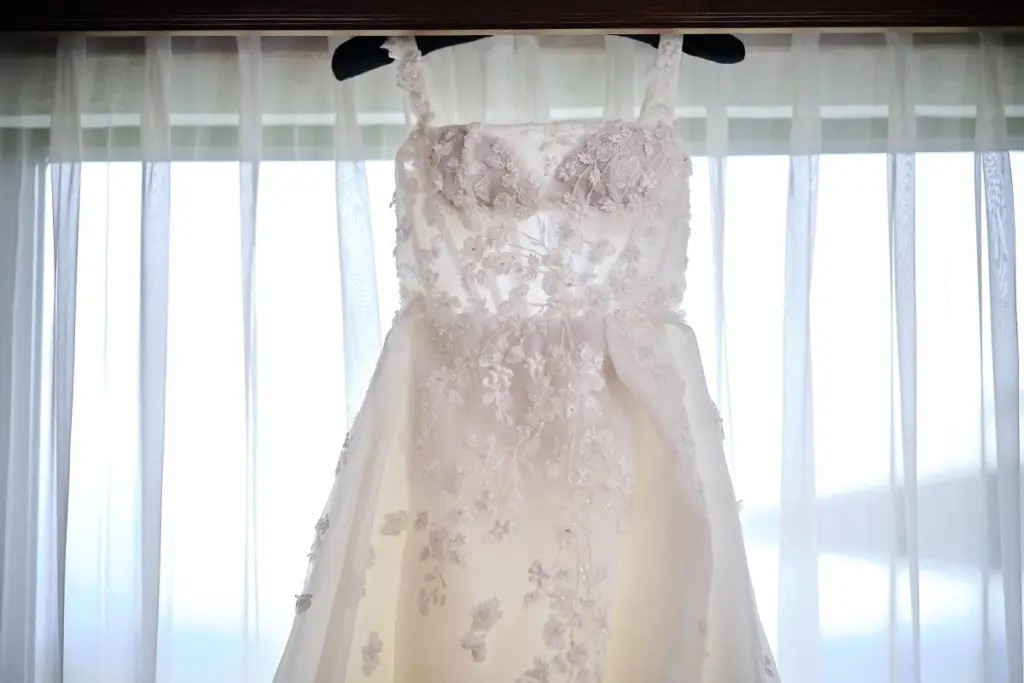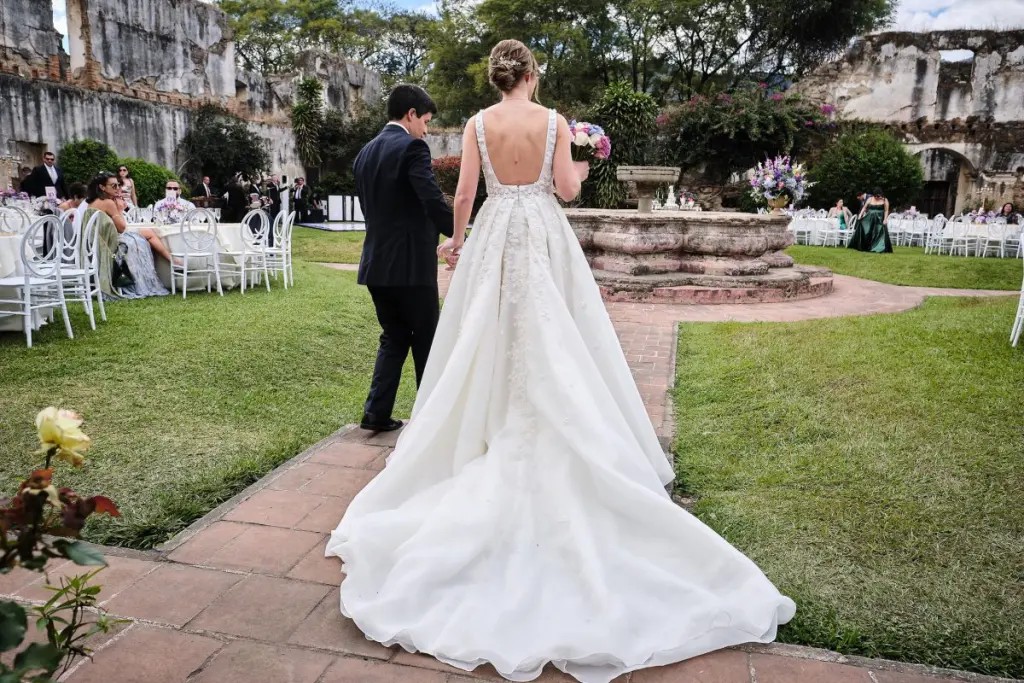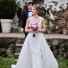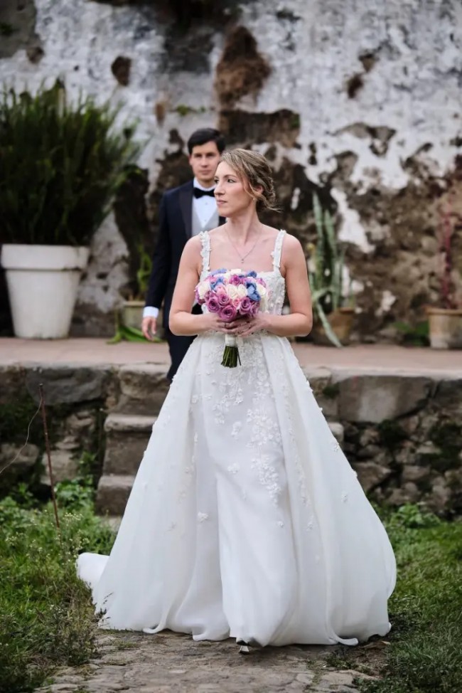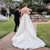 Ivory coloured organza wedding dress, with square neckline and ball gown silhouette, low back, slit and floral embellishments