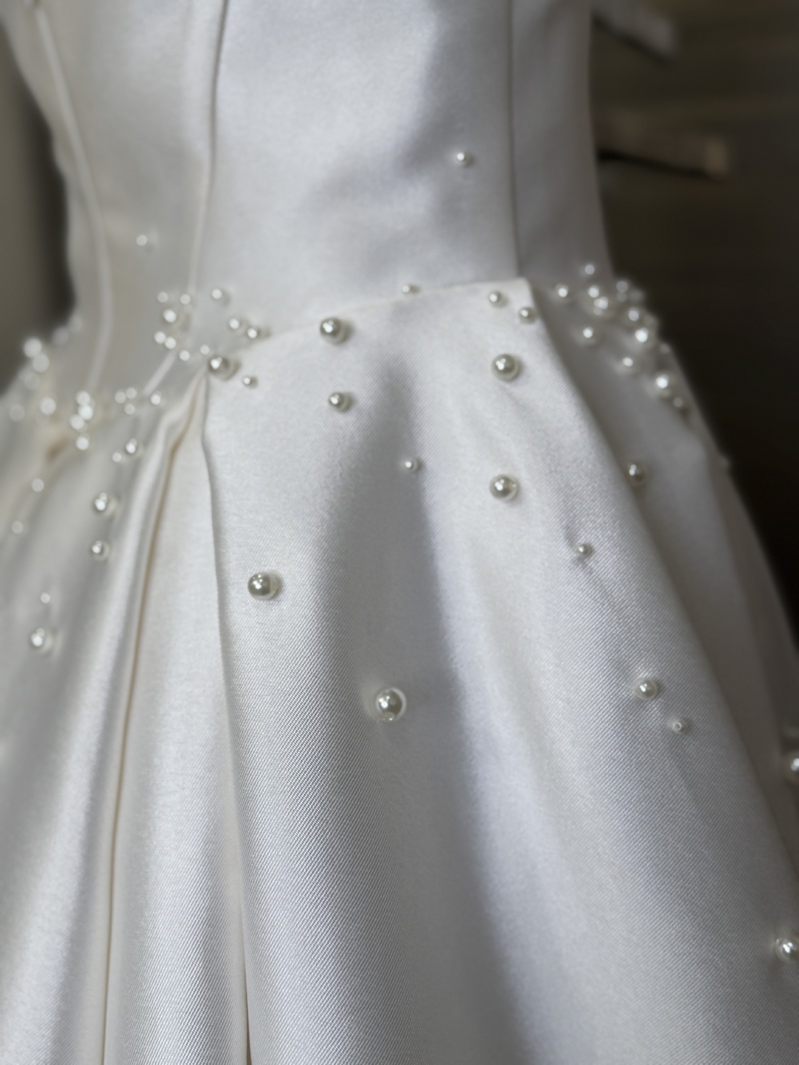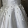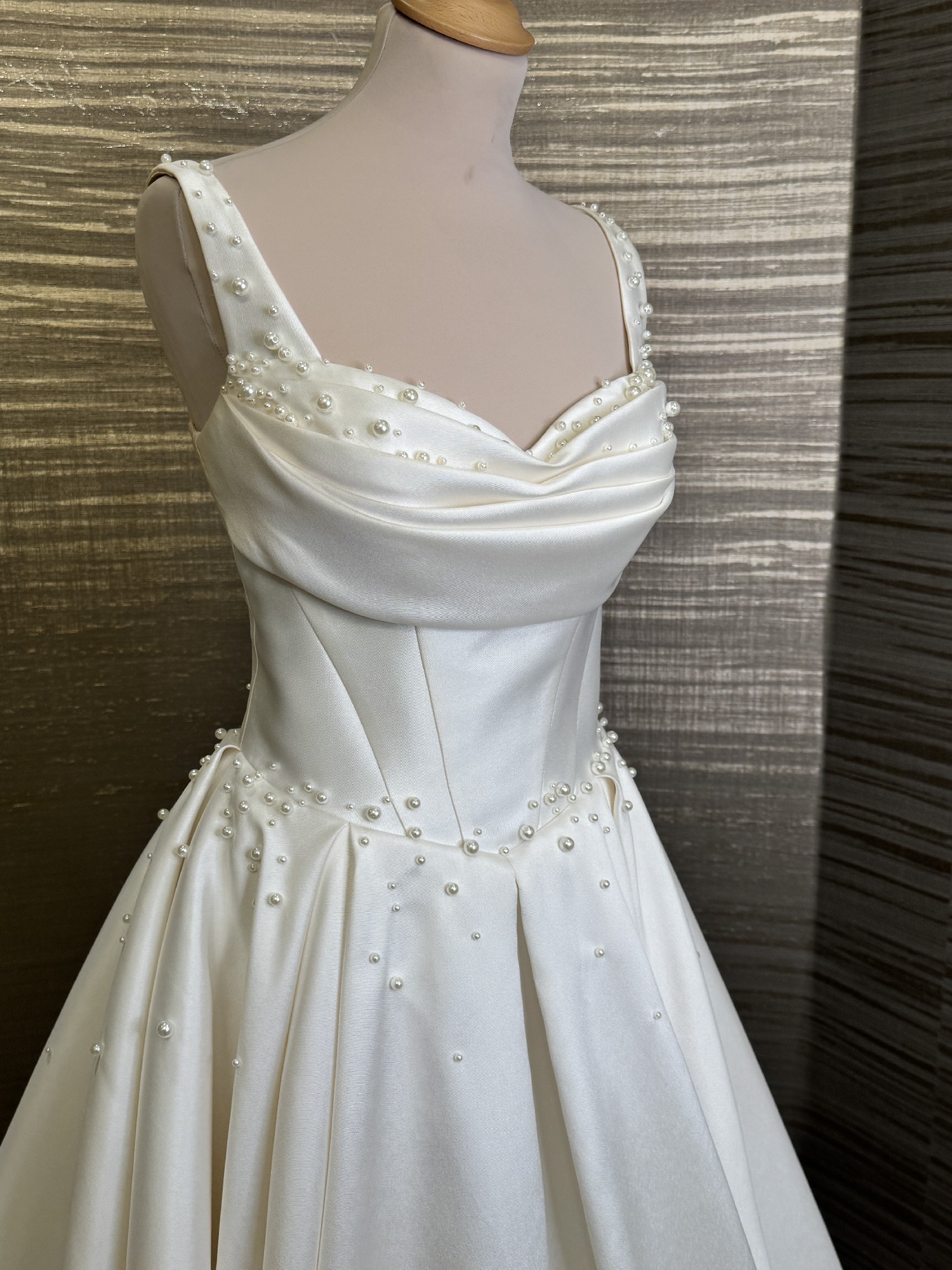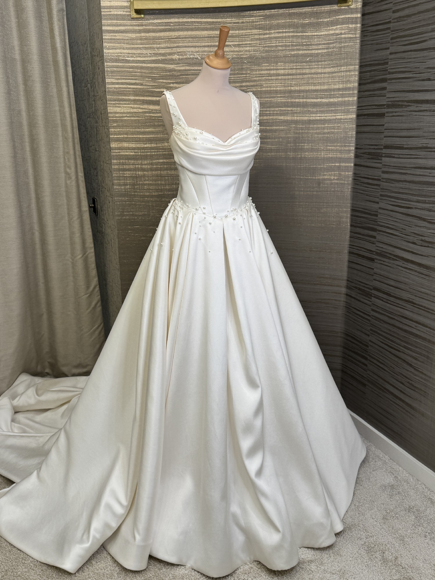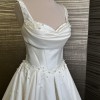 Refined A line wedding gown crafted from mikado. The classic design features a corset with a cinched waist, a draped heart shaped neckline framed by wide straps, a zipper closure on the back, a lush full skirt with a long train. The dress features a delicate scattering of pearls too!!