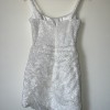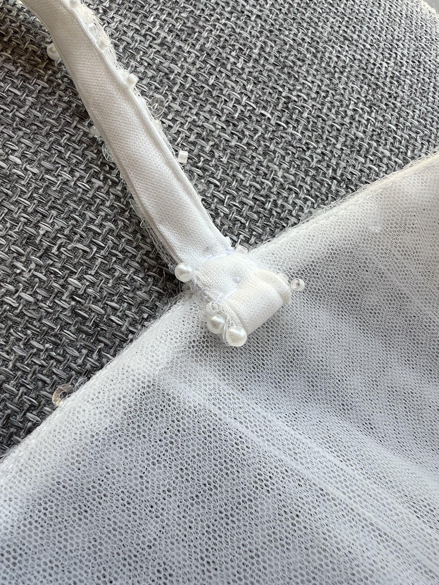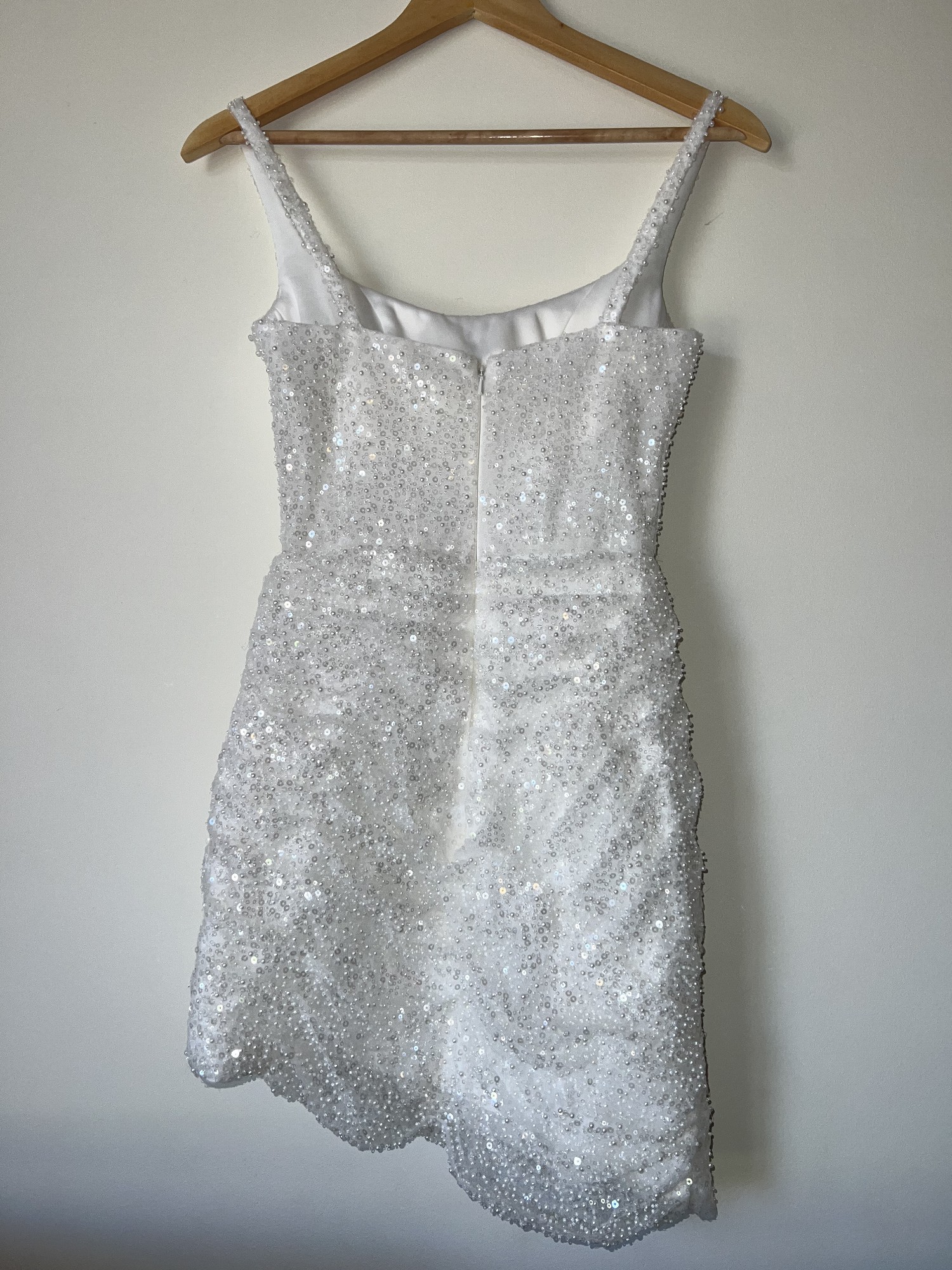 This dress is everything, a scooped neckline with a soft drape over a boned bodice, mini length, and the most stunning pearl beadwork that absolutely sparkles.
