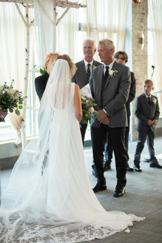The semi-cathedral train includes a subtle French bustle (and can easily be adapted to any style by a bridal seamstress). When bustled, the dress moves beautifully on the dance floor. I received so many compliments on how elegant and graceful it looked throughout the day.