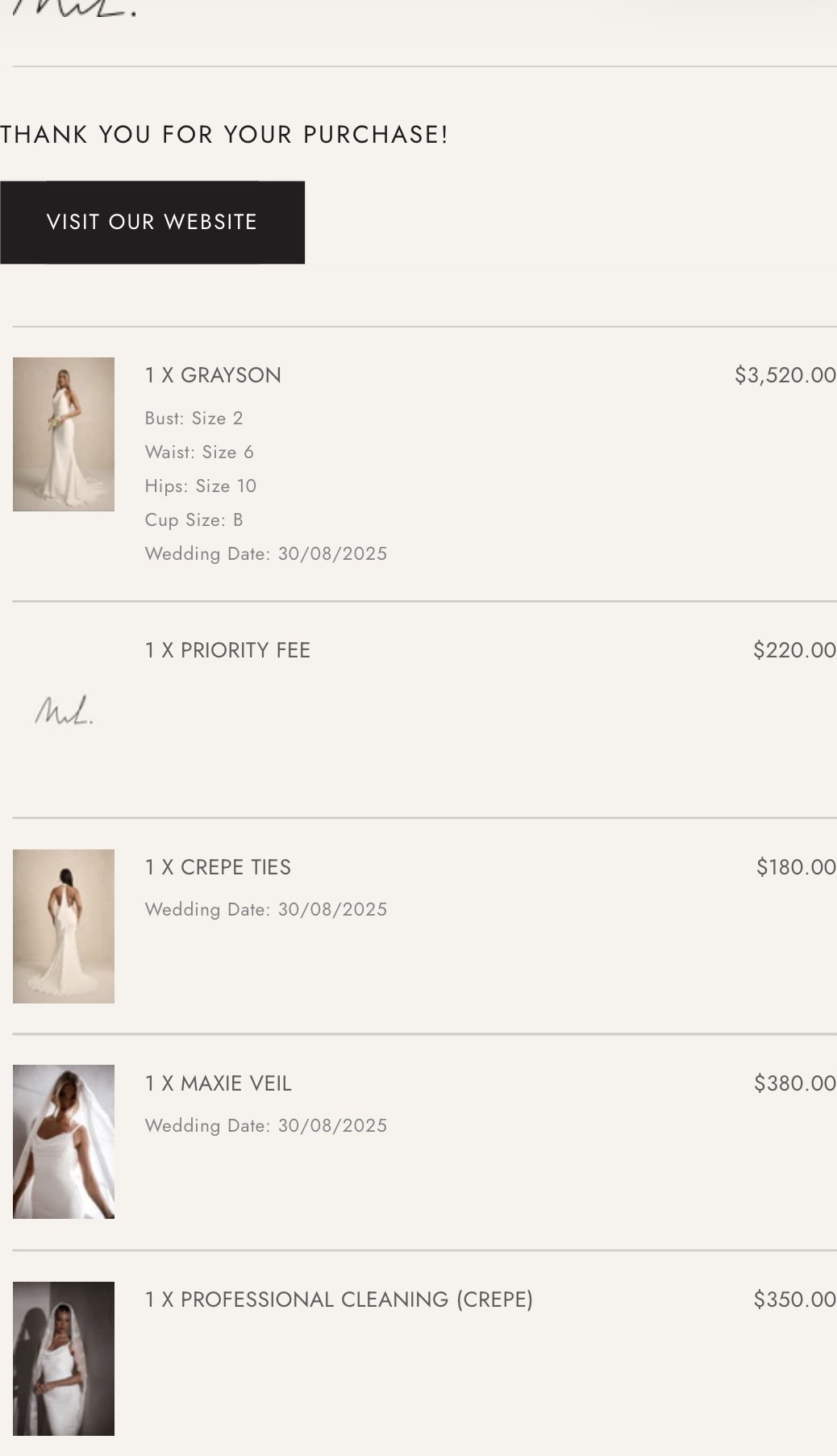 Worn 30 August 2025 & dry cleaned 2 days later. Service completed by dress designer Made with Love Bridal at a cost $350.