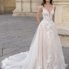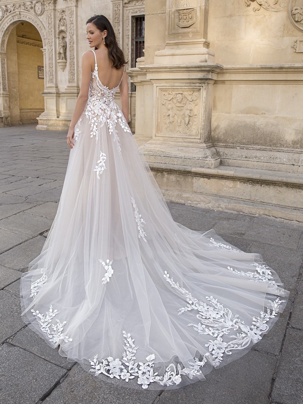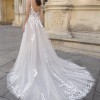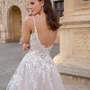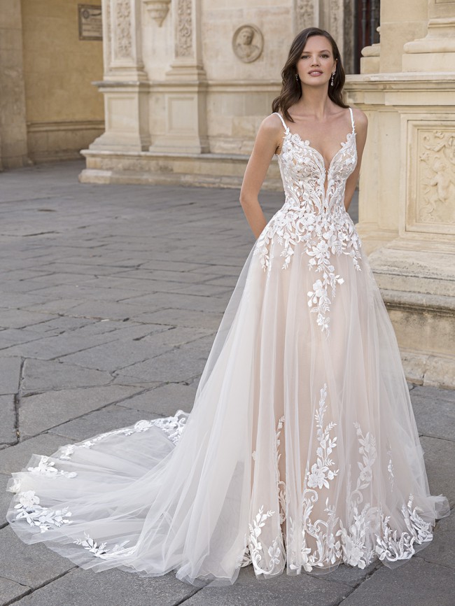 Living in a fairytale dream! This soft and flirty A-line wedding dress showcases a deep V-neckline with twinkling beaded straps and a sexy, plunging back that will ensure heads turn. The sparkling floral, baroque and Chantilly lace from the bodice cascade down to the ethereal tulle skirt for an ultra-romantic look.