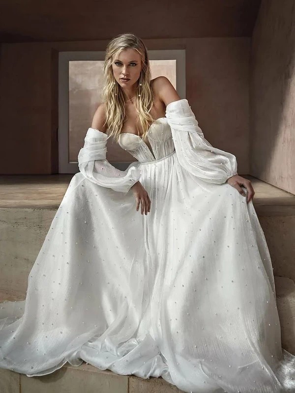 What I loved most are the flowing detachable sleeves – they instantly transform the look into something even more romantic. You can style it in so many ways: with or without the sleeves, with thin or off-shoulder straps, even with smooth or pearl-detailed gloves. It’s a gown that feels light, graceful, and endlessly special – perfect for any bride who wants to leave a lasting impression.