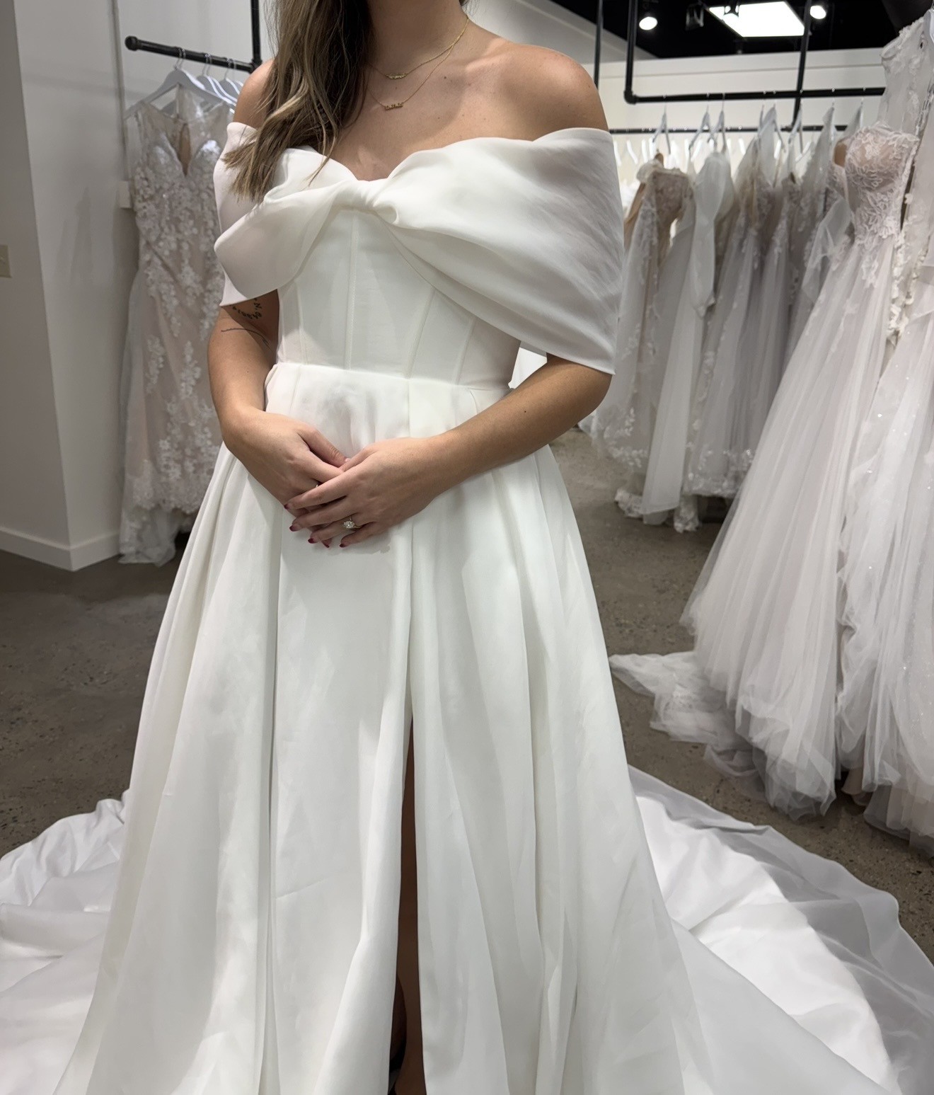 This gown is timeless, romantic, and completely customizable through Madi Lane (fabrication, lining, leg split, bust cups, etc.). The detachable train is included, and it’s ready to make another bride’s day truly special 🤍