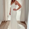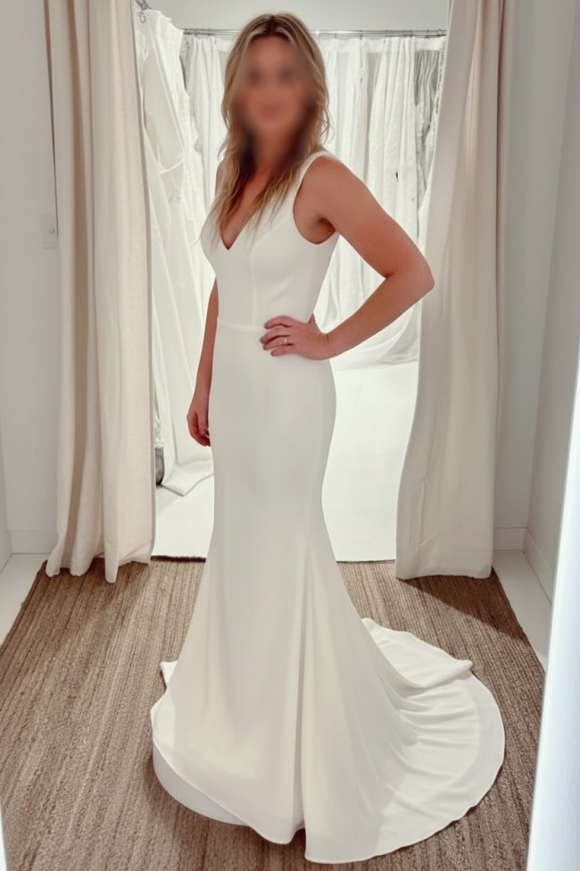 Kalani combines a sleek, minimalist design with a captivating fit-and-flare silhouette. The classic deep V-neckline and open V-back add timeless elegance, while the double layer of premium stretch crepe enhances your figure for a flawless look. Designed to contour and embrace your shape, this gown promises to make you feel confident and radiant on your wedding day. Wear it with one of our wedding veils to complete the look. NOTE: V neckline Open V back Fully lined Non-padded at bust Hidden back zipper Medium train High stretch - can fit 10-14 Wear it with the matching fingertip length wedding veil Materials: double layer stretch scuba crepe (95% Polyester 5% Spandex) Gentle Dry Clean Only BRAND NEW With tags. I have had to order a different size. Price includes Veil & Garment bag