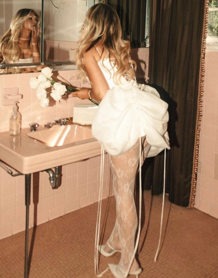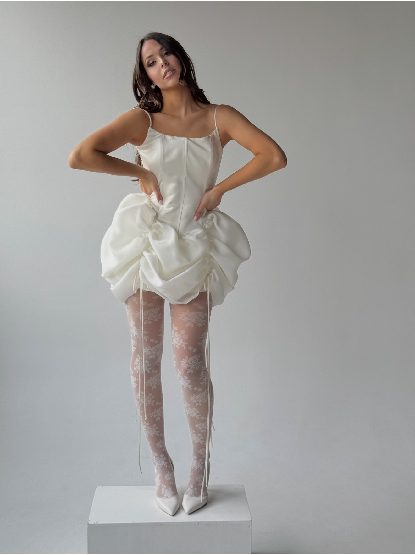 Custom made mini dress with lace up back Bust 31"-35" Waist 24"-27" Hips up to 37". Can provide more photos/videos. Satin base (satin mini skirt liner-pic #8) with adjustable organza outer skirt (the pull strings can adjust the outer poofy layer up/down some!)