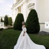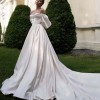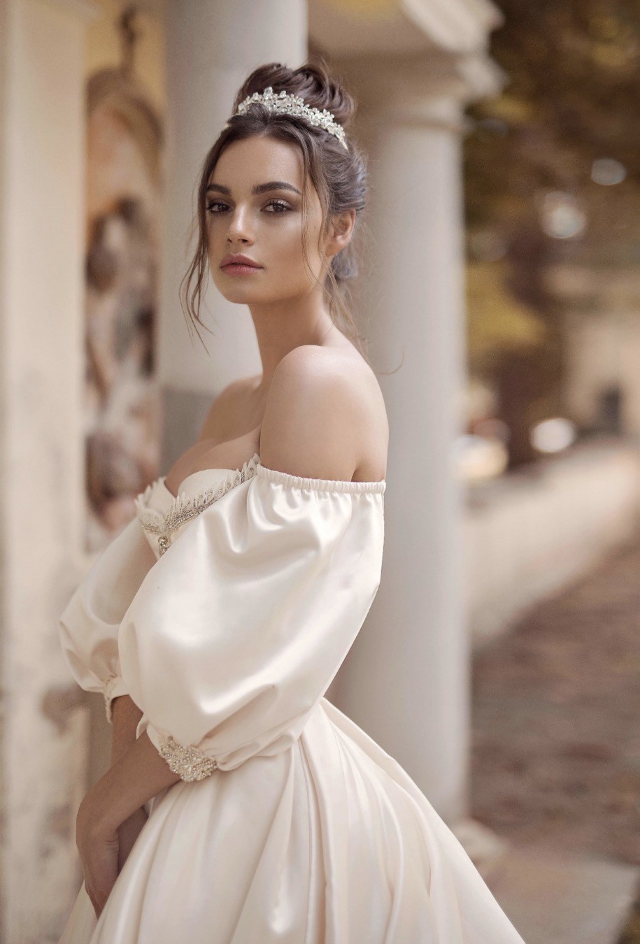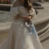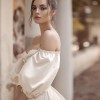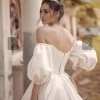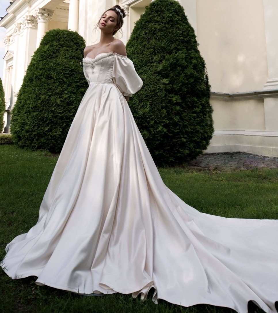 The off-the-shoulder neckline frames the face beautifully while adding an element of romance. The corset back provides a perfect fit, enhancing the waist and allowing for a comfortable yet flattering shape throughout the celebration. Adorned with delicate beading this dress is a true work of art that sparkles with every movement. Pearls add a touch of classic charm, making it an unforgettable piece.