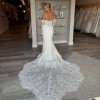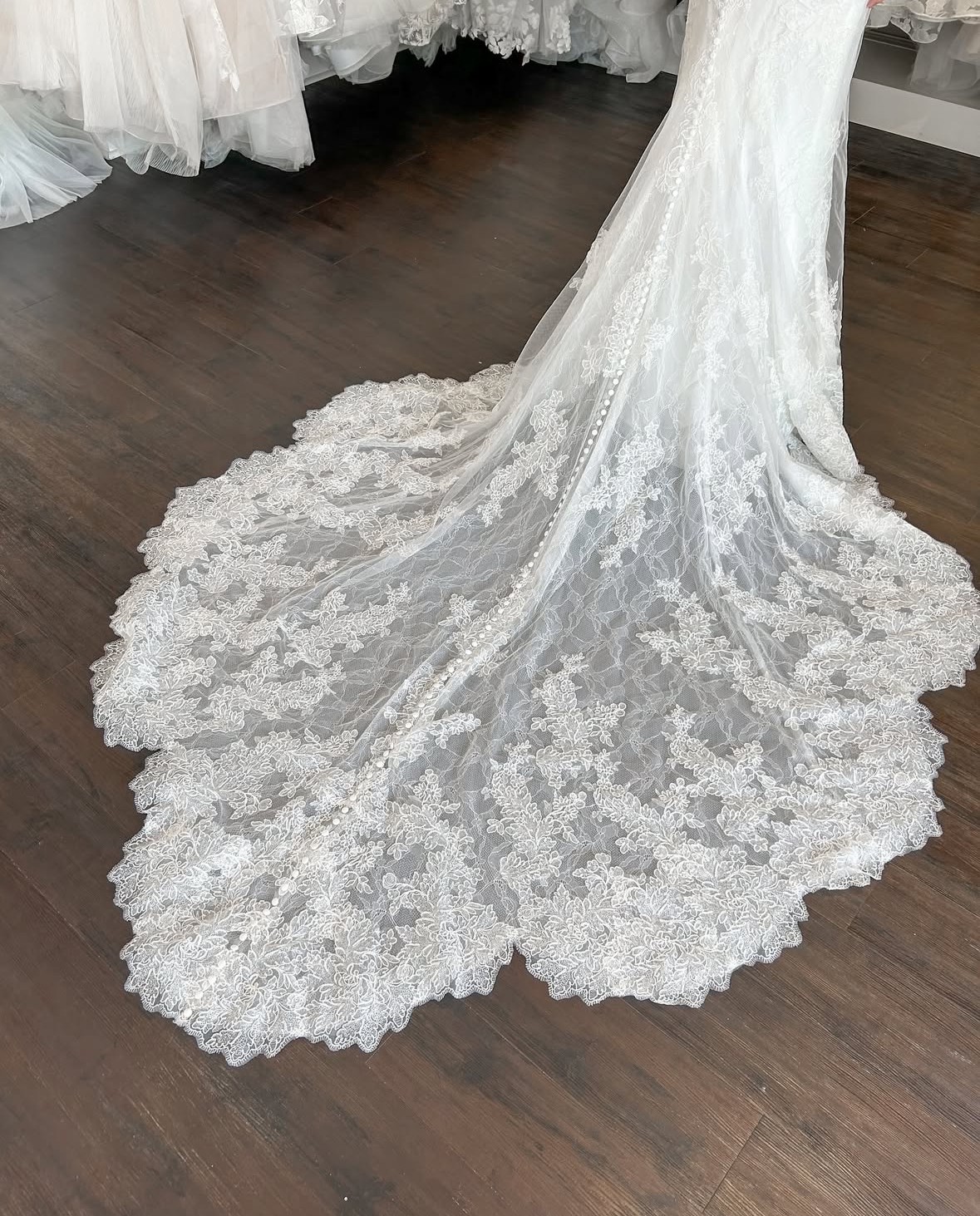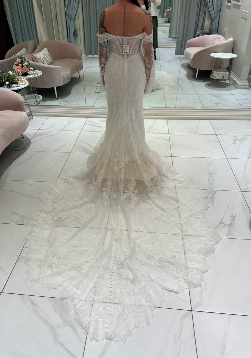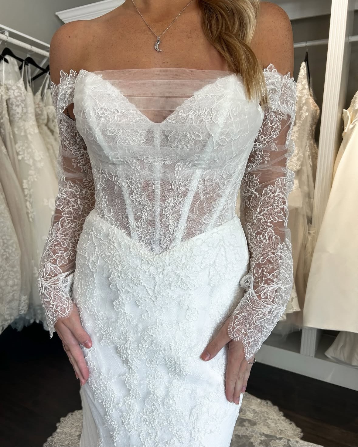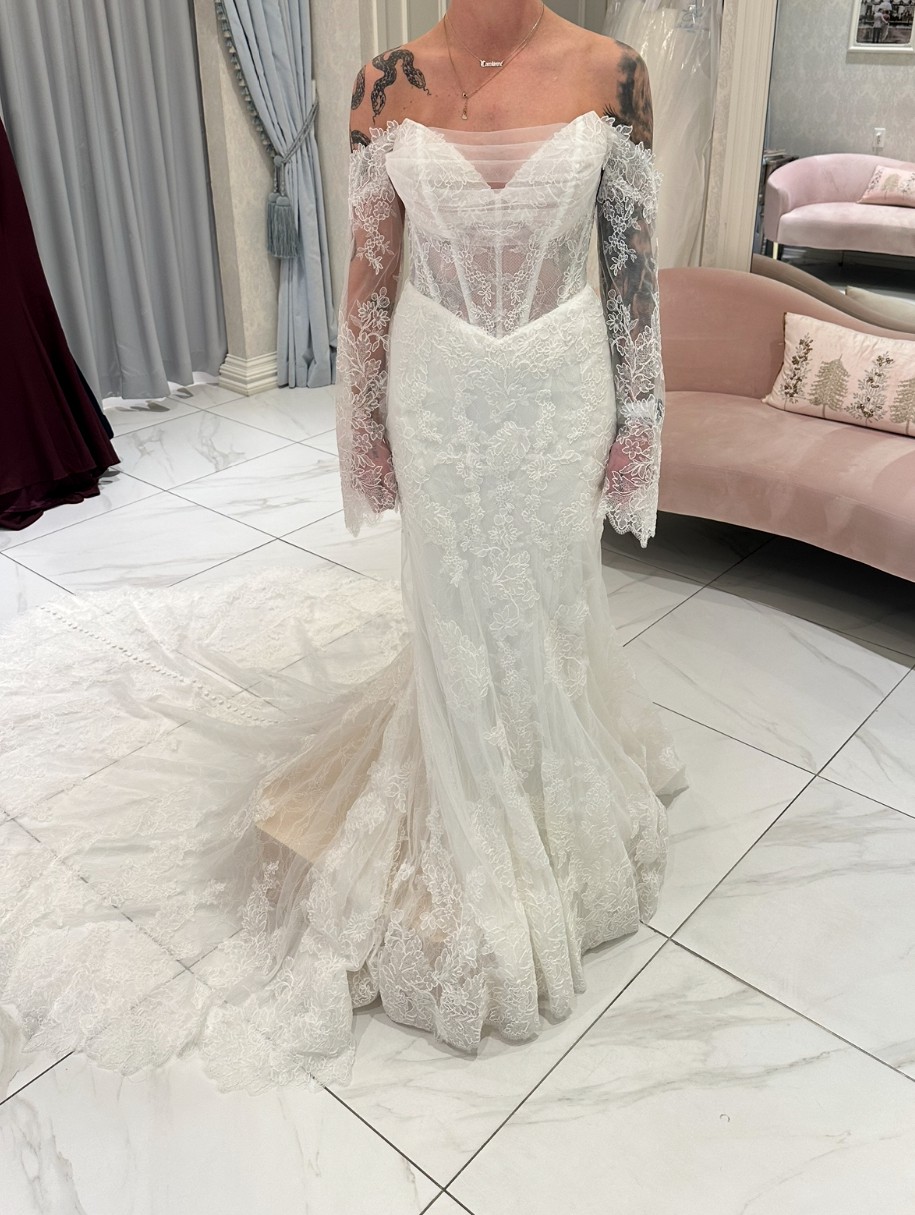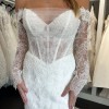 Detachable off the shoulder lace sleeves. Sheer strapless bodice with a sweetheart neckline wrapped in tulle. Corset boning and intricate floral lace. Fit and flare skirt with lace trimmed train. Lace covered buttons.