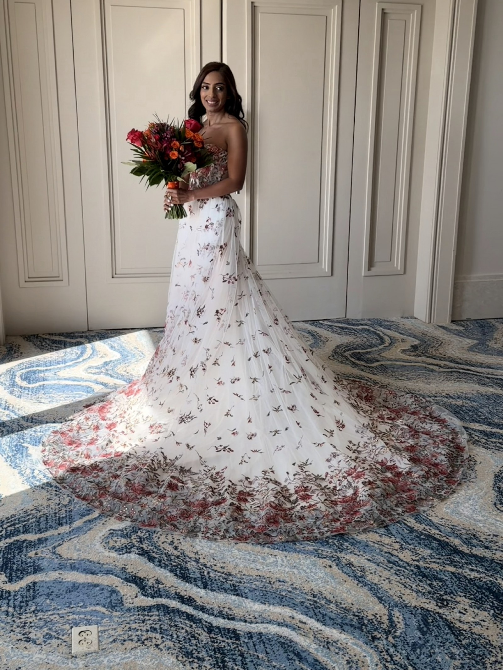 Season by Madi Lane is a white wedding dress with a splash of color. I wore this for about three hours on my wedding day.