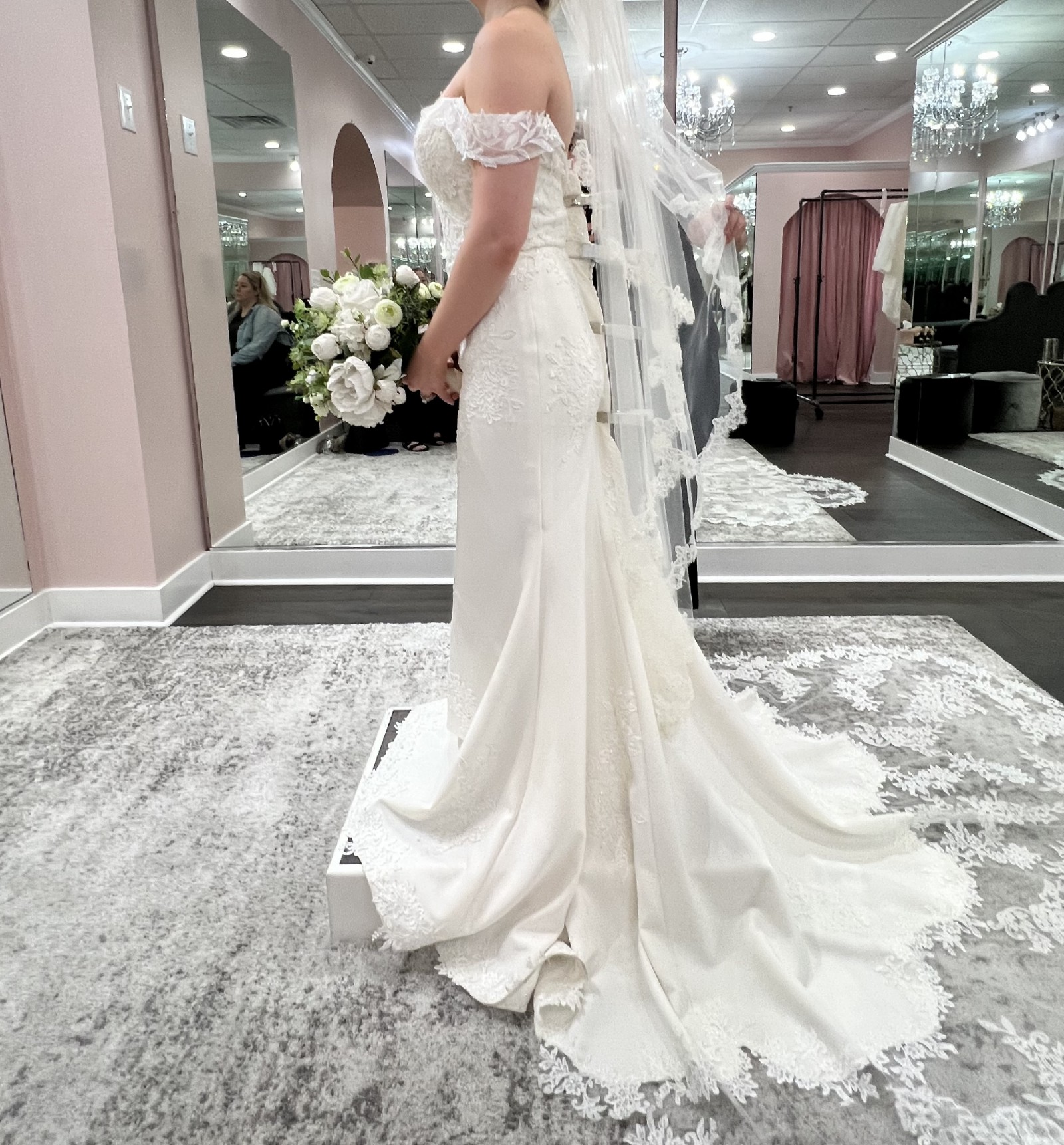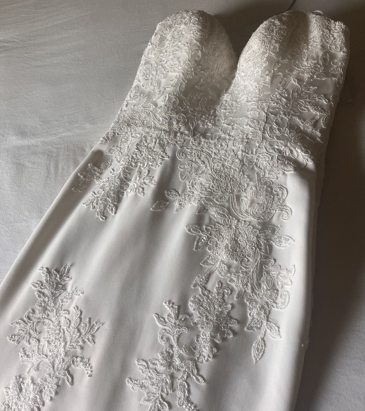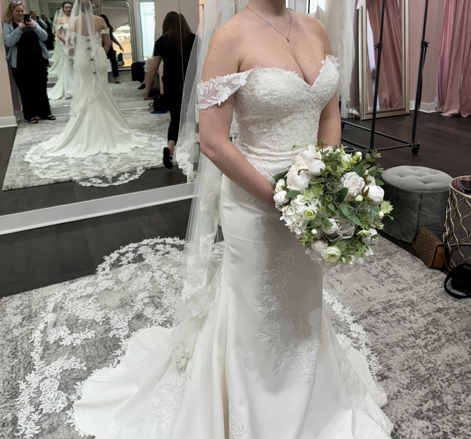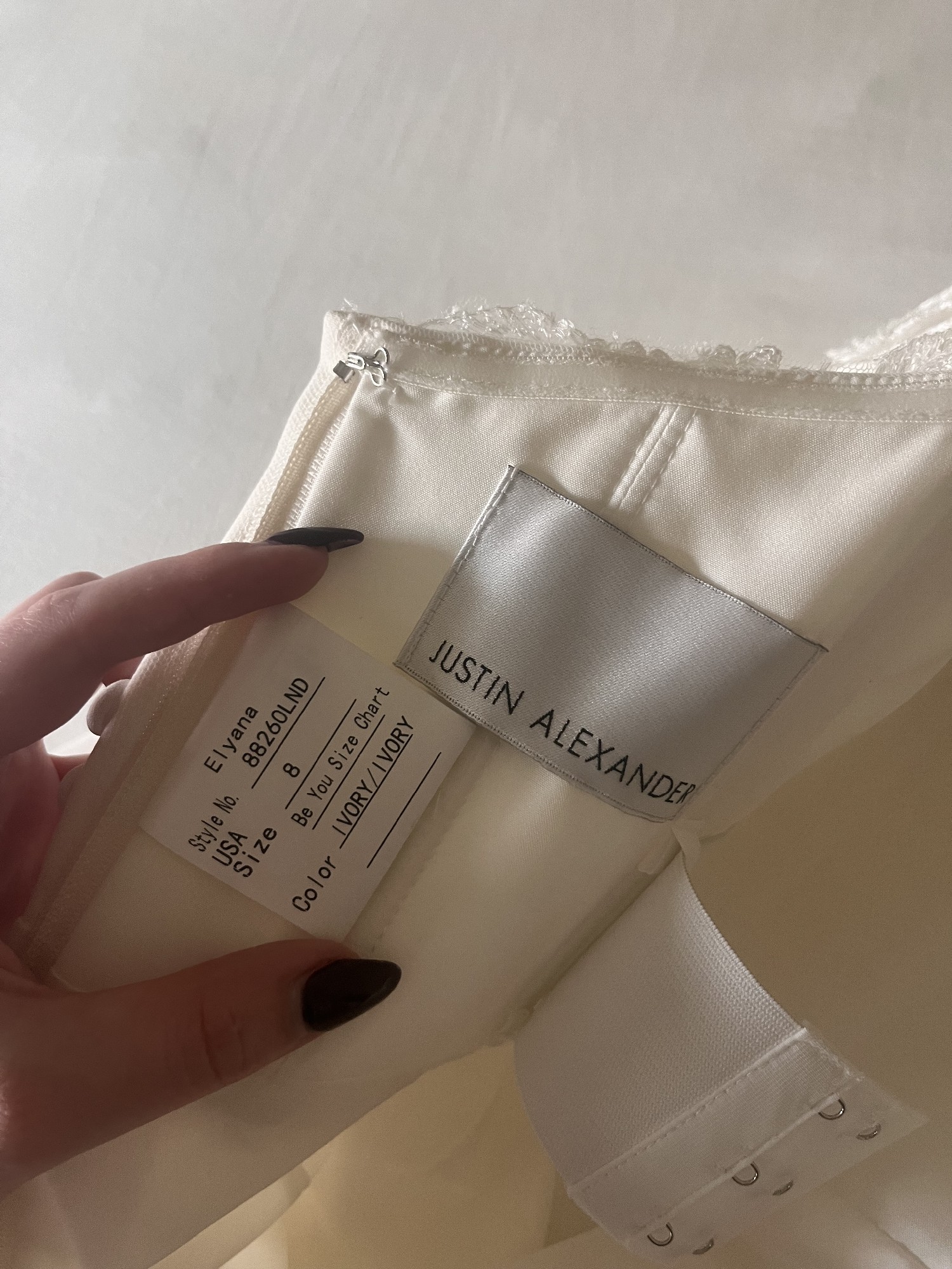 This Never-Worn Elyana dress from Justin Alexander and veil was the perfect choice for me, but unfortunately the wedding was cancelled. The fit and flare silhouette highlighted my figure beautifully, and the sweetheart neckline brought an enchanting touch that made me feel radiant. The mid-back design adds an air of elegance, while the strapless feature gave freedom of movement.