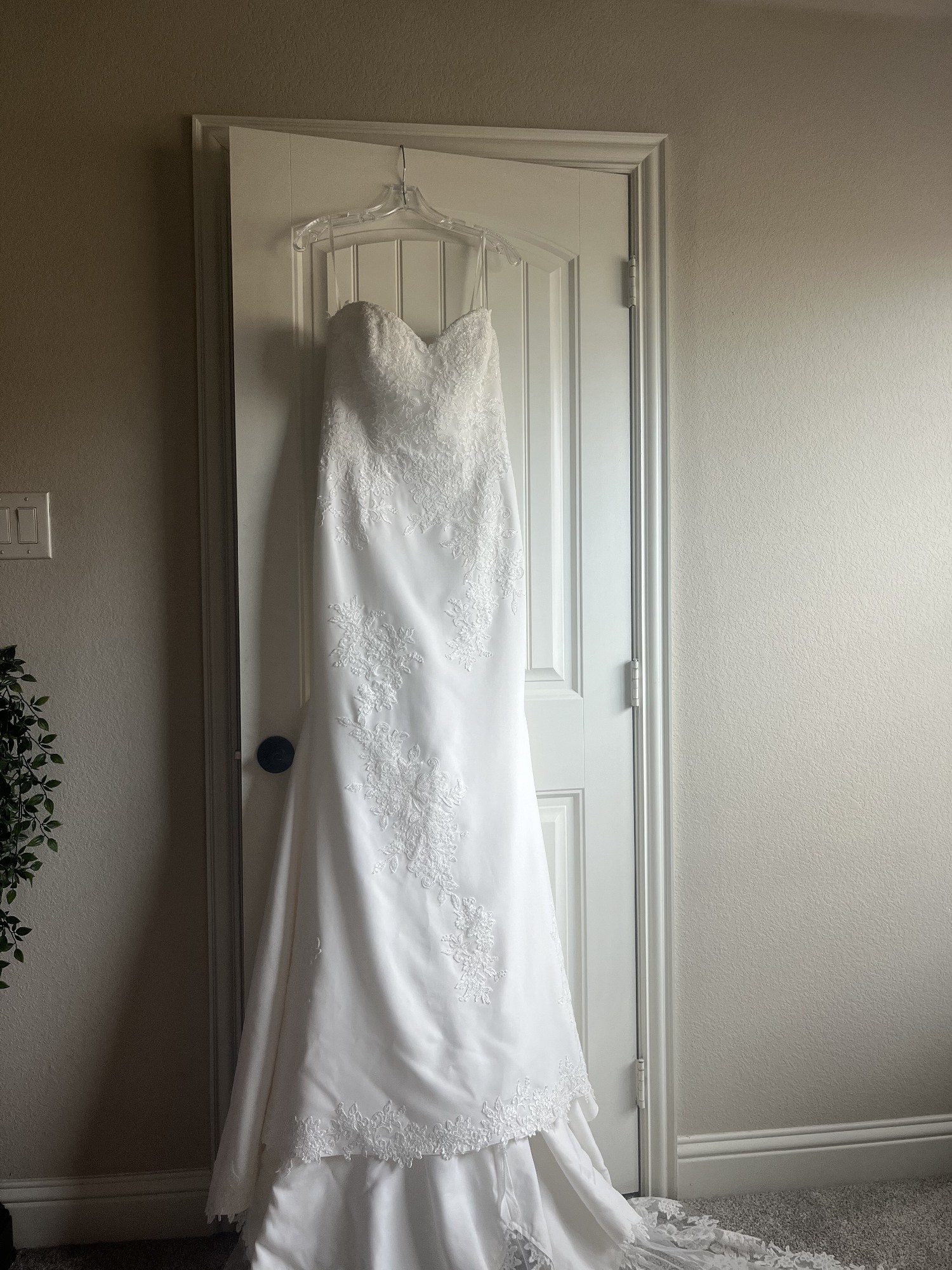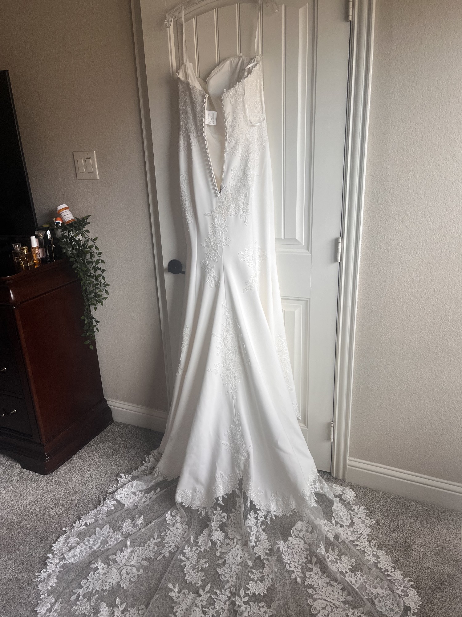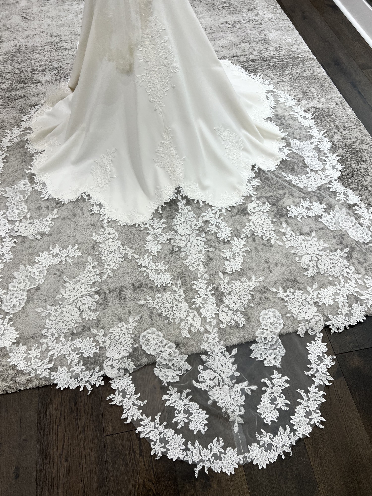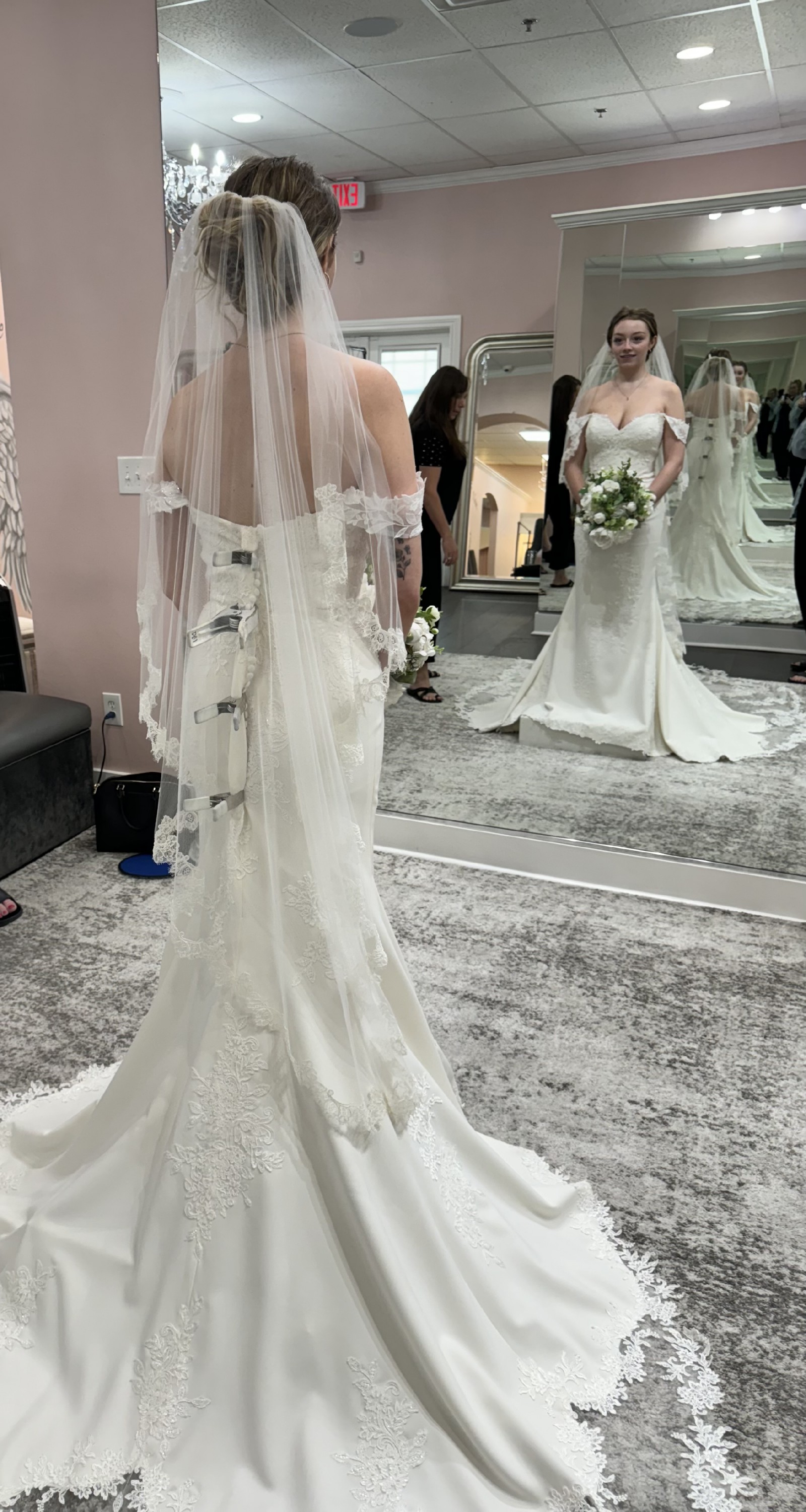 This Never-Worn Elyana dress from Justin Alexander and veil was the perfect choice for me, but unfortunately the wedding was cancelled. The fit and flare silhouette highlighted my figure beautifully, and the sweetheart neckline brought an enchanting touch that made me feel radiant. The mid-back design adds an air of elegance, while the strapless feature gave freedom of movement.