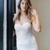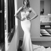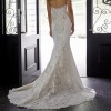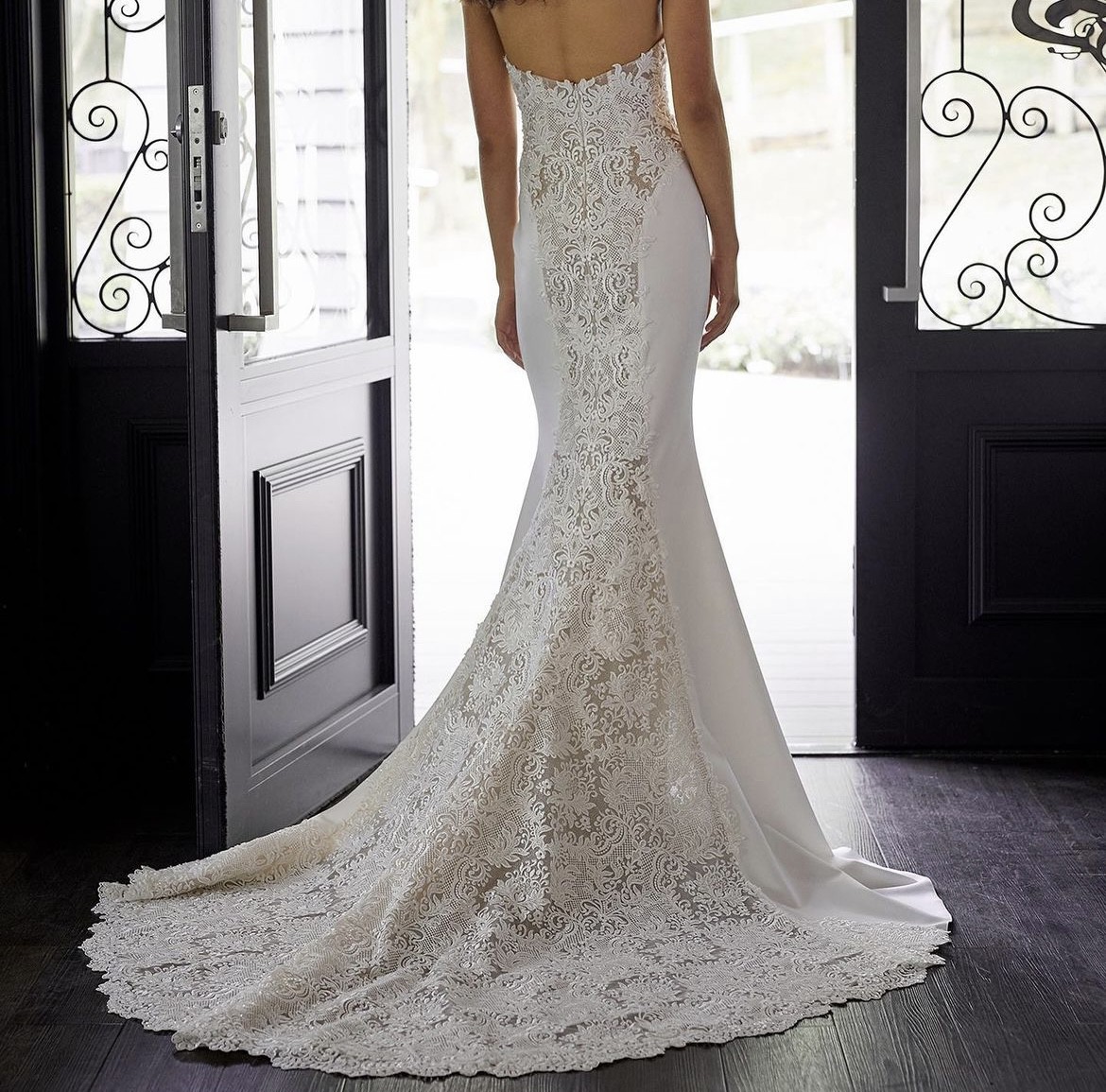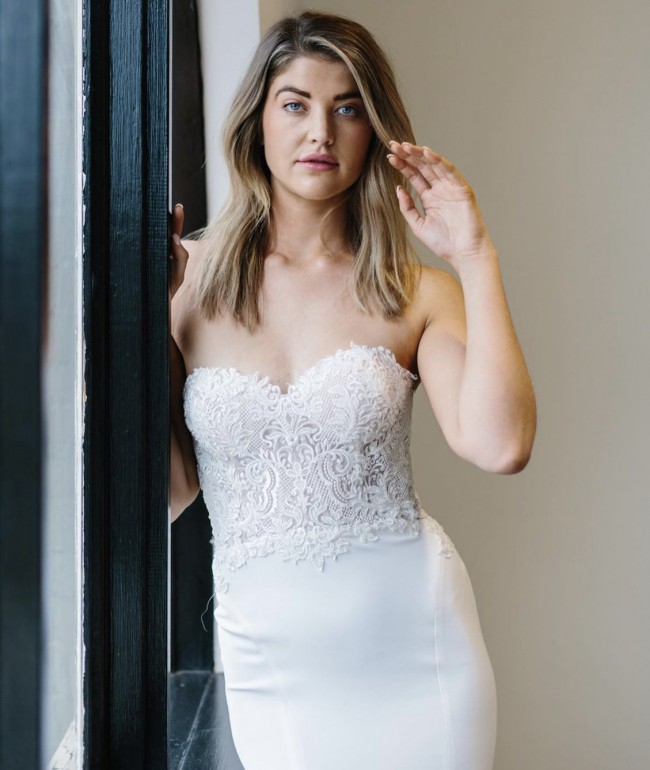 The LOREENA is a floral lace featured on a strapless bodice, following a long train.