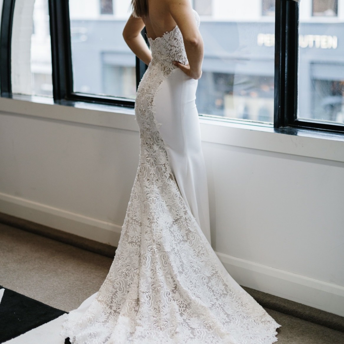 The dress was only worn for a couple of hours - it was during Covid & we were unable to have any guests or have an event. In excellent condition, minimal use - needs to be dry cleaned.