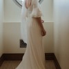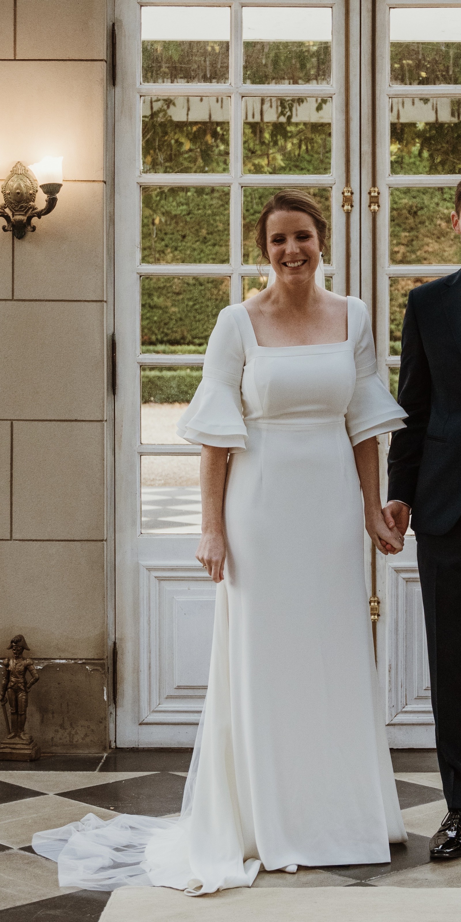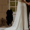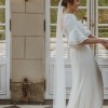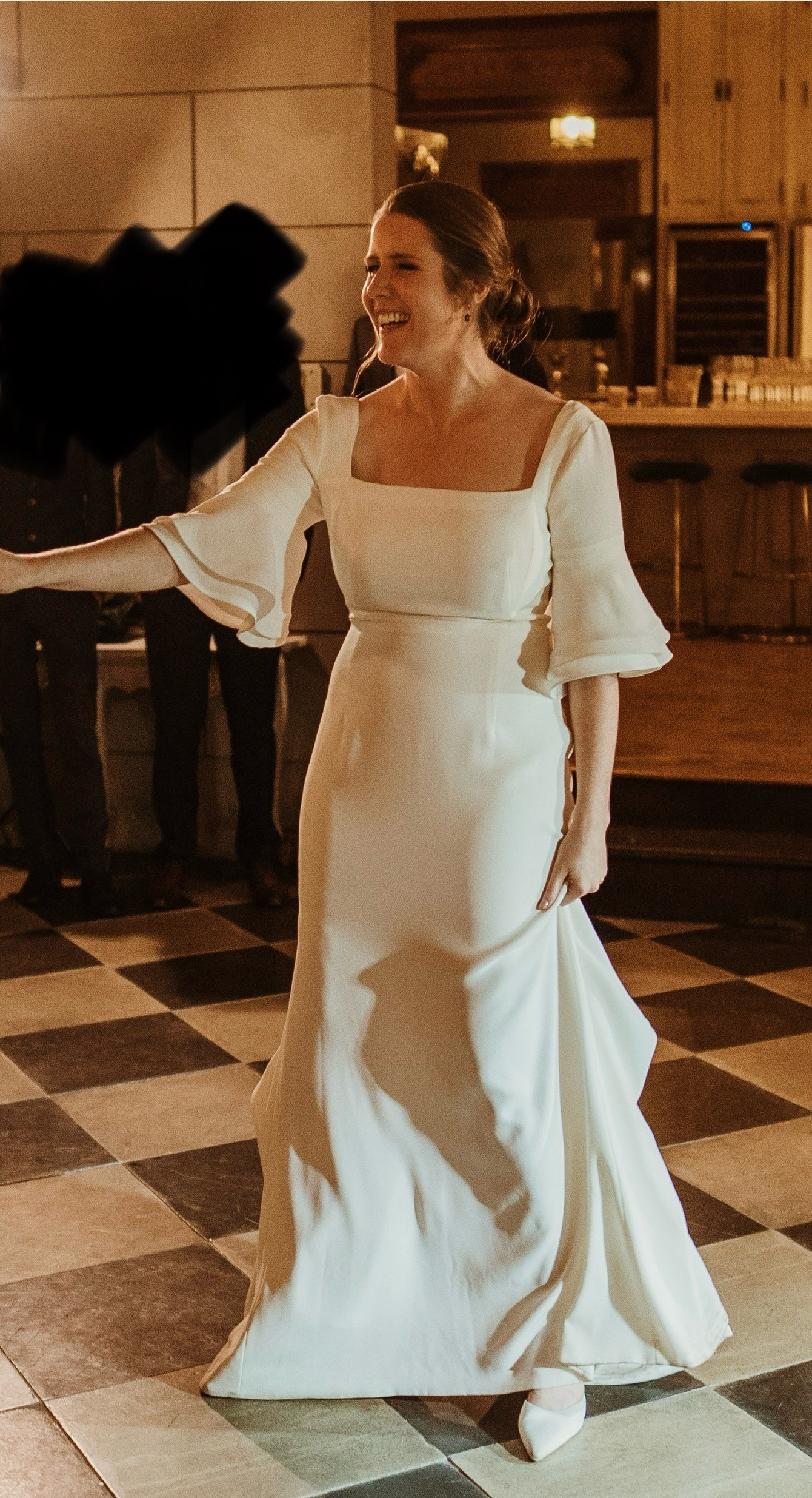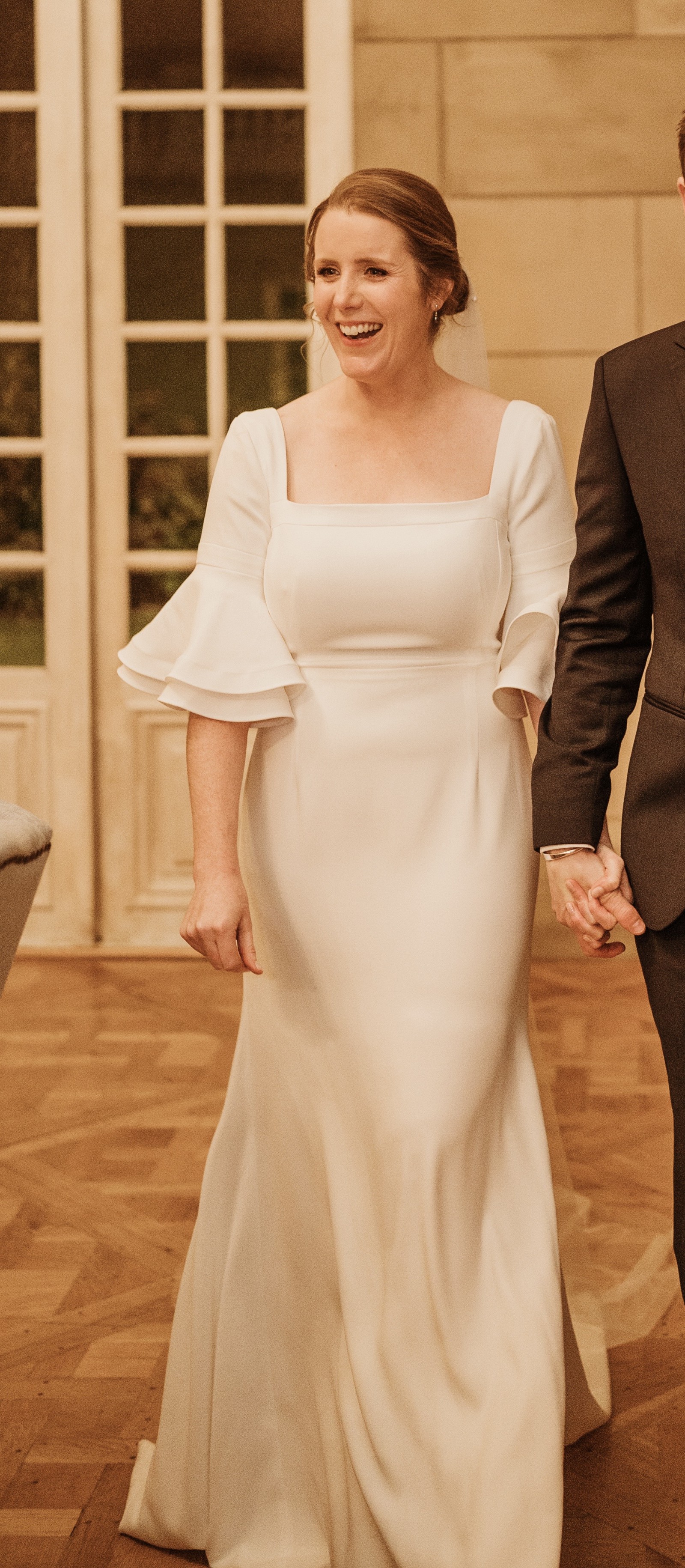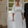 Beautiful elegant wedding dress with a small train, square neckline, midback, flared sleeves from the elbow, floor length, zips up middle of back, has a wrist ribbon to enable the train to be looped over wrist when required. Great condition with some minor marks on the floor hemline. Has been dry-cleaned. Crepe with some satin underneath.