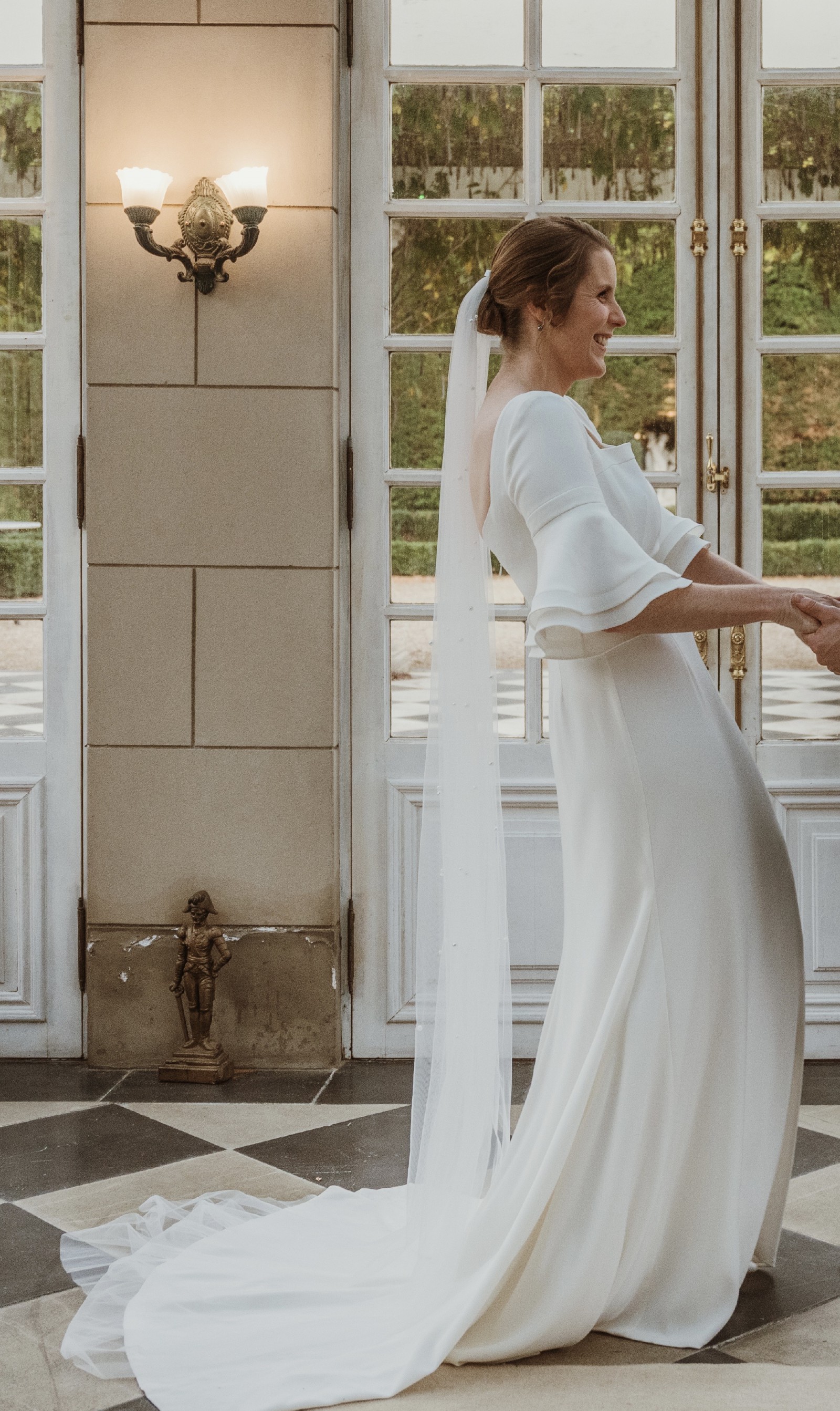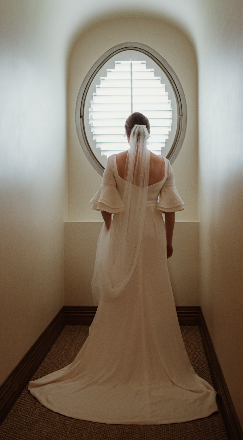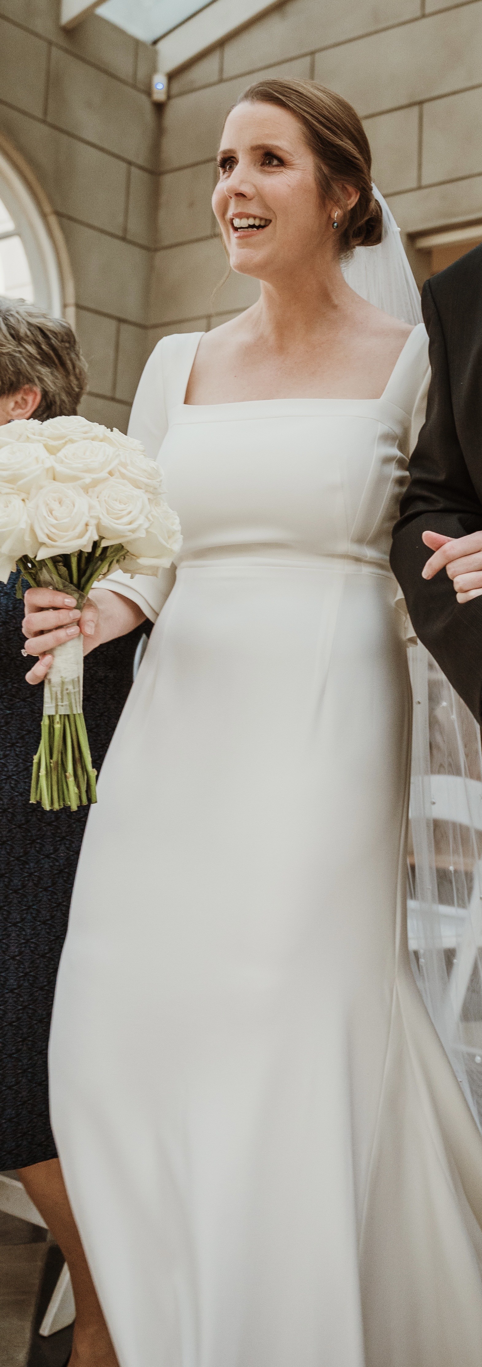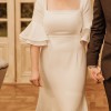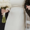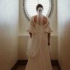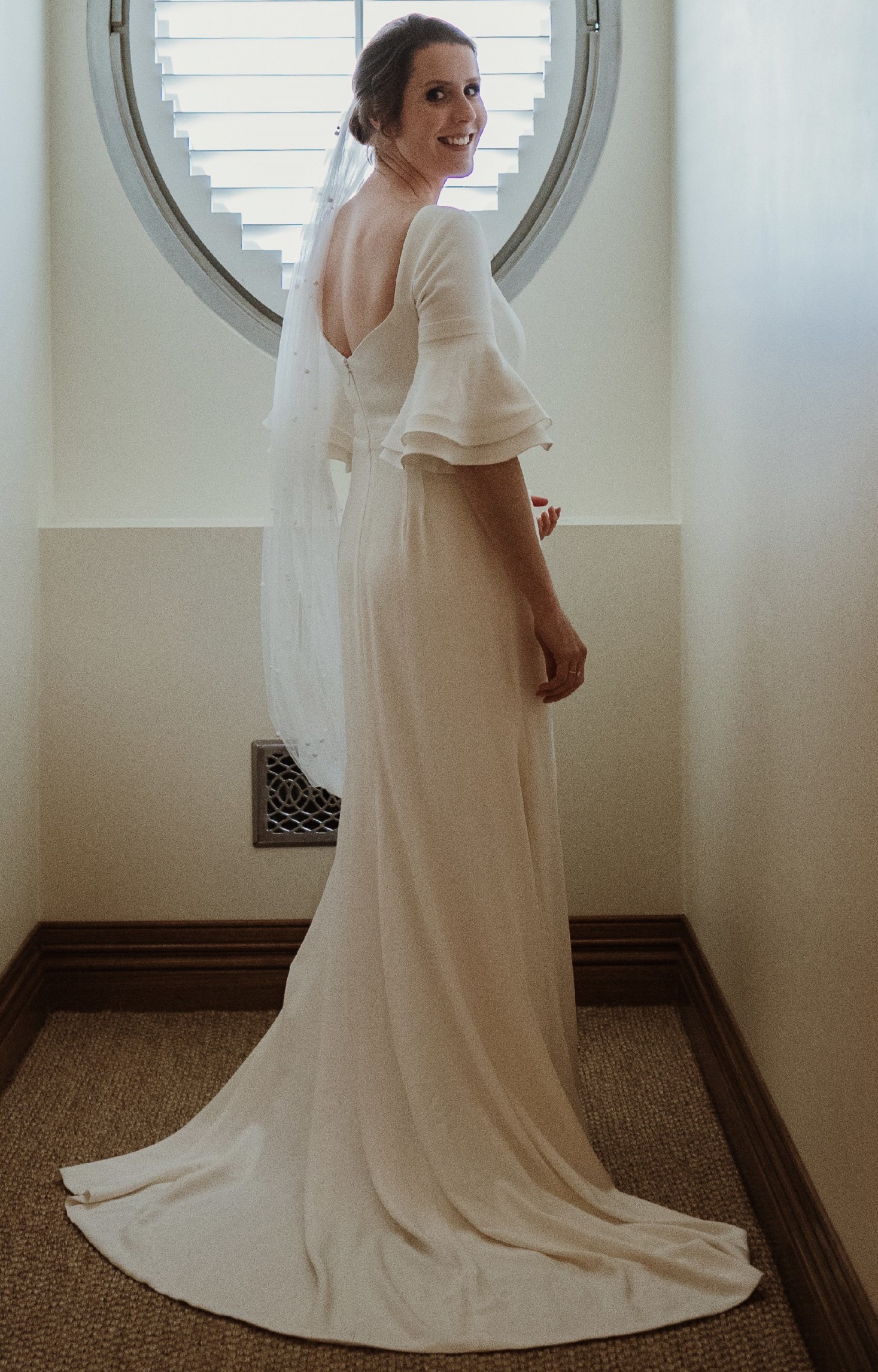 Beautiful elegant wedding dress with a small train, square neckline, midback, flared sleeves from the elbow, floor length, zips up middle of back, has a wrist ribbon to enable the train to be looped over wrist when required. Great condition with some minor marks on the floor hemline. Has been dry-cleaned. Crepe with some satin underneath.