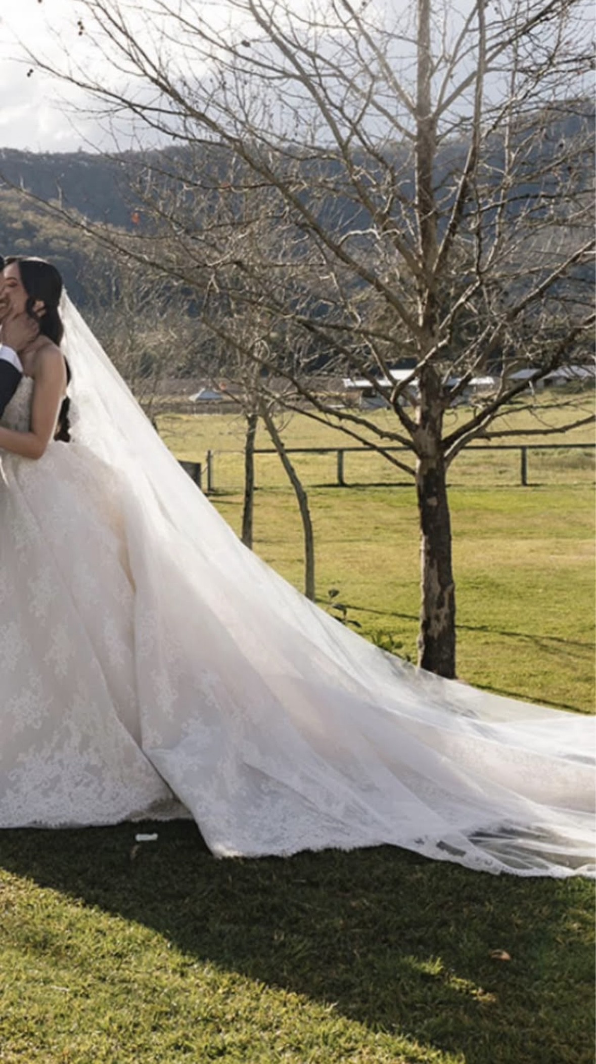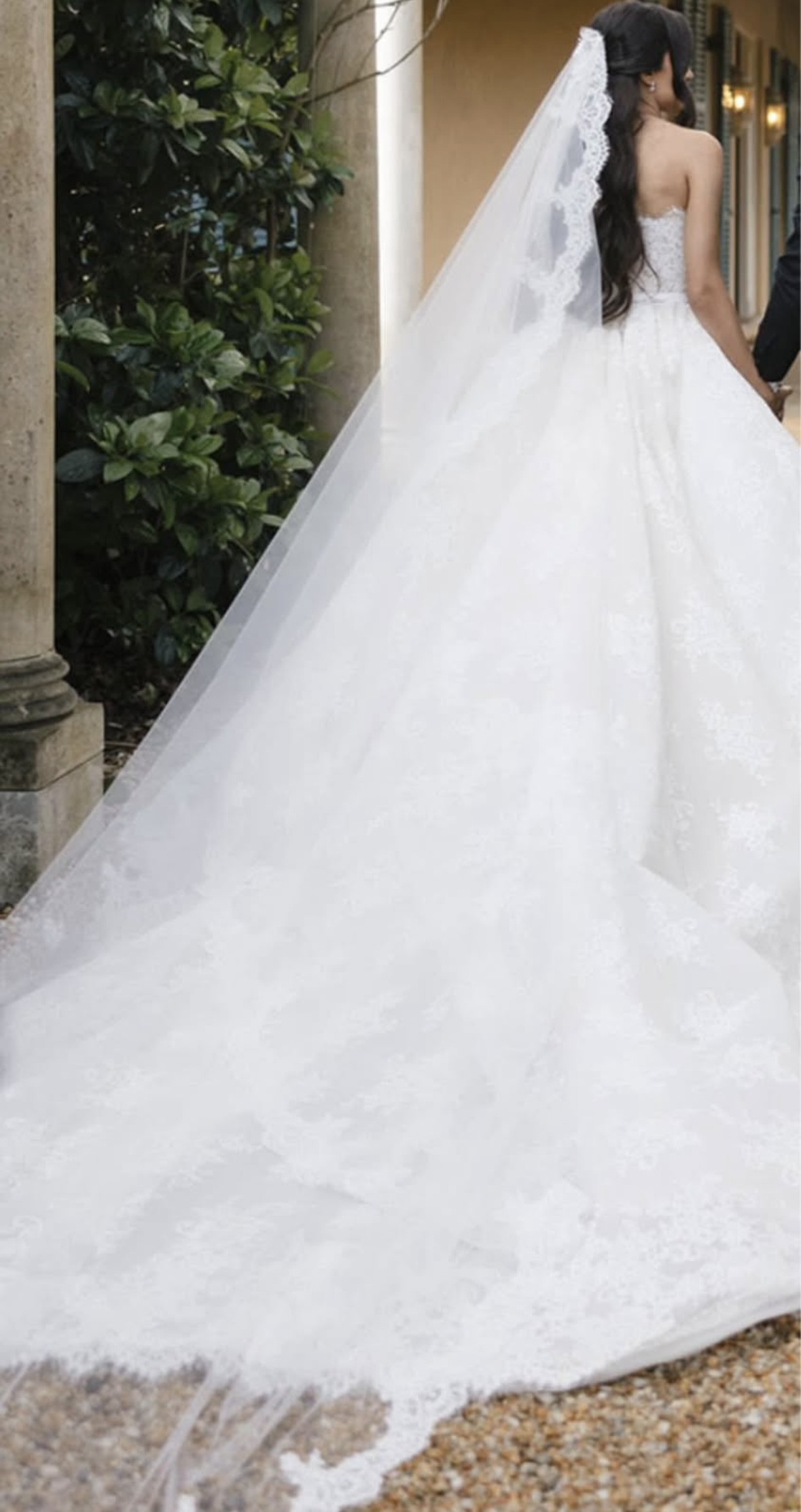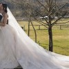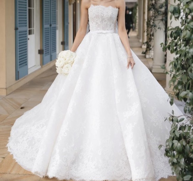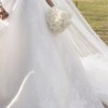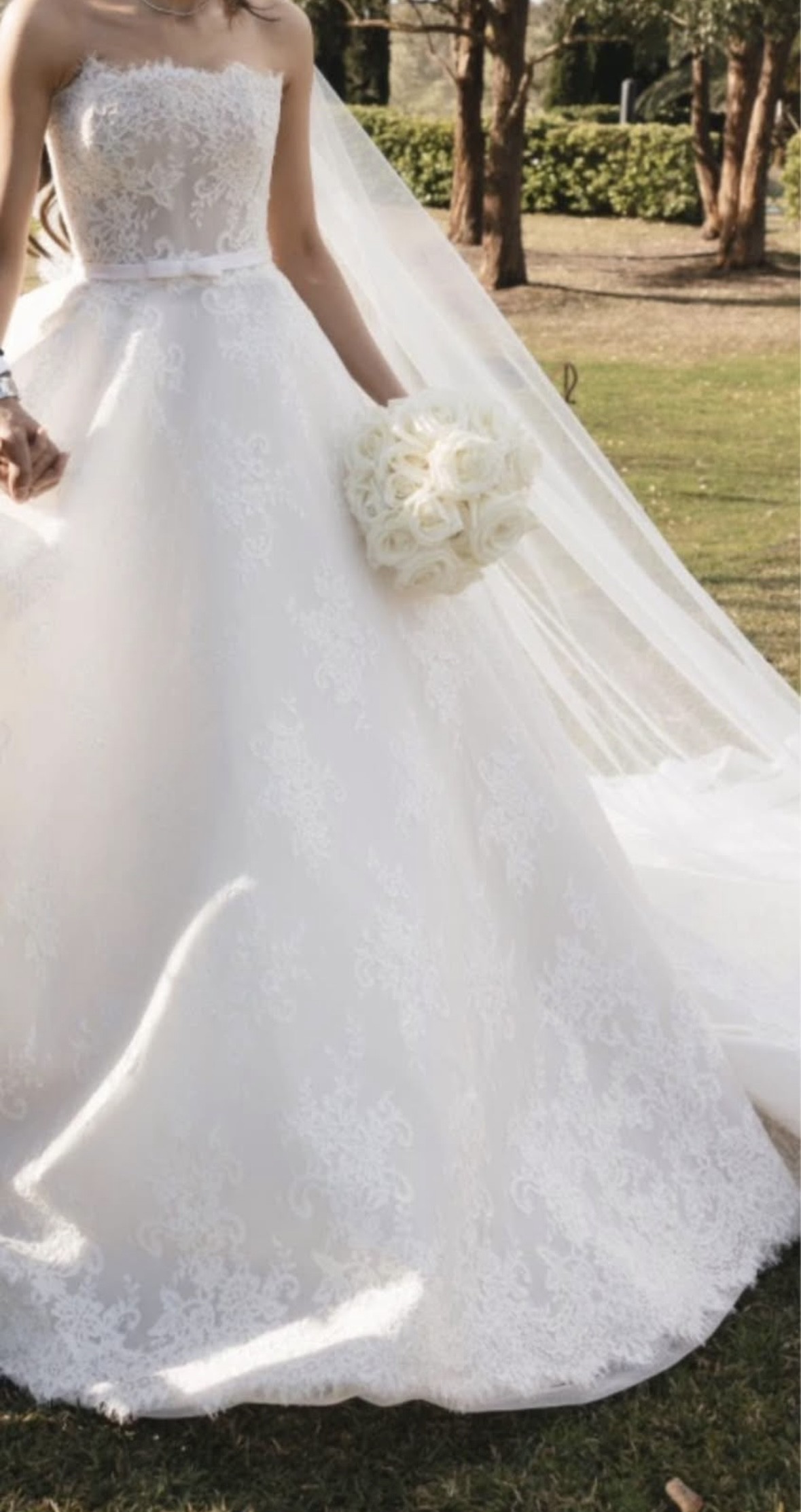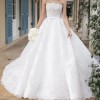 A strapless neckline and fitted bustier with inbuilt corsetry and fine waistband and bow detail. A full voluminous skirt with extended length 3 metre train in a French Cord Lace in light ivory and pale latte underlay.