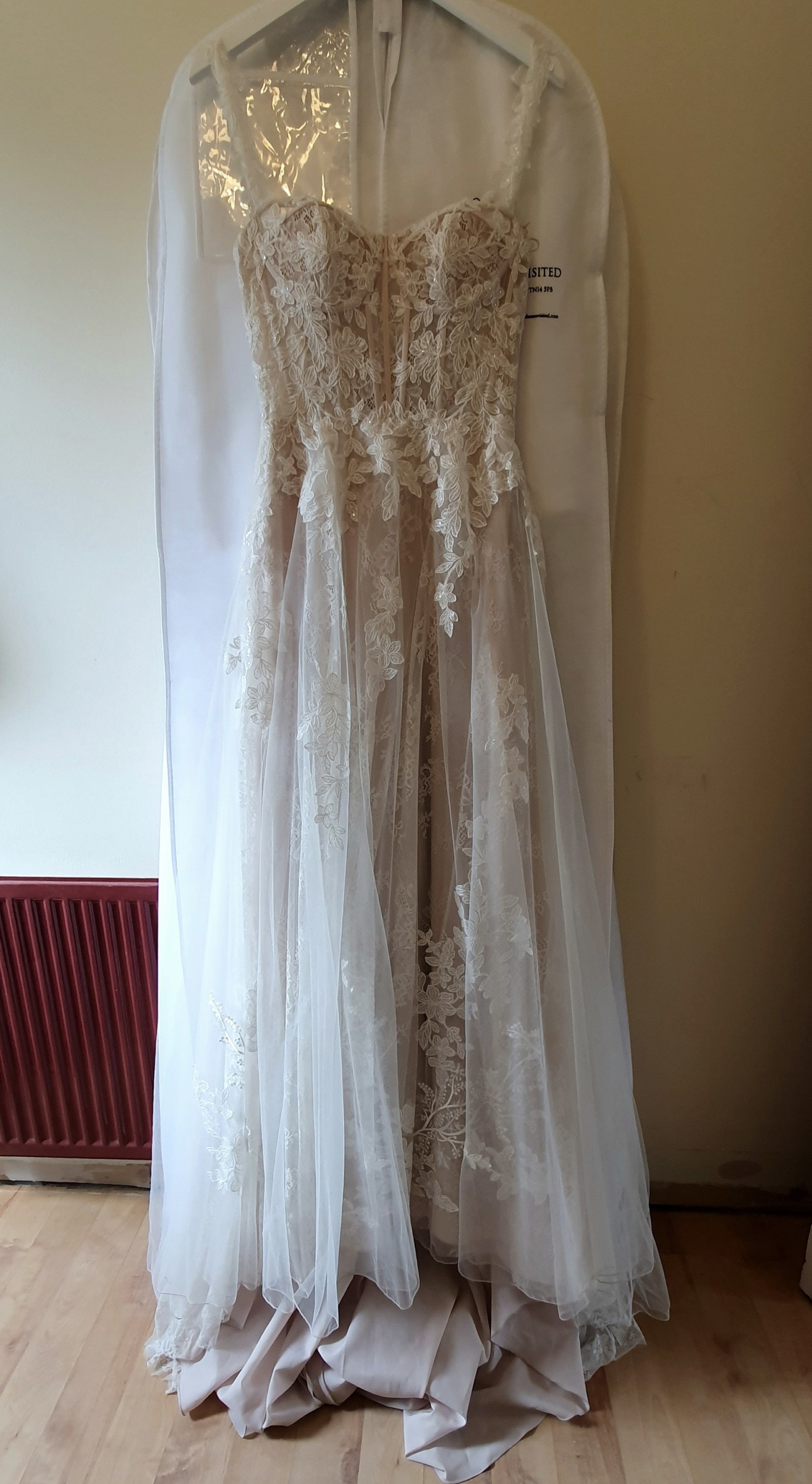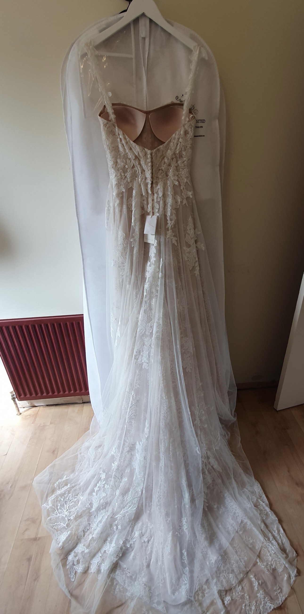 The dress is in almost perfect condition - it needs a dry clean. It has a bustle added and they are marked with safety pins so you can find them on the wedding day .