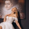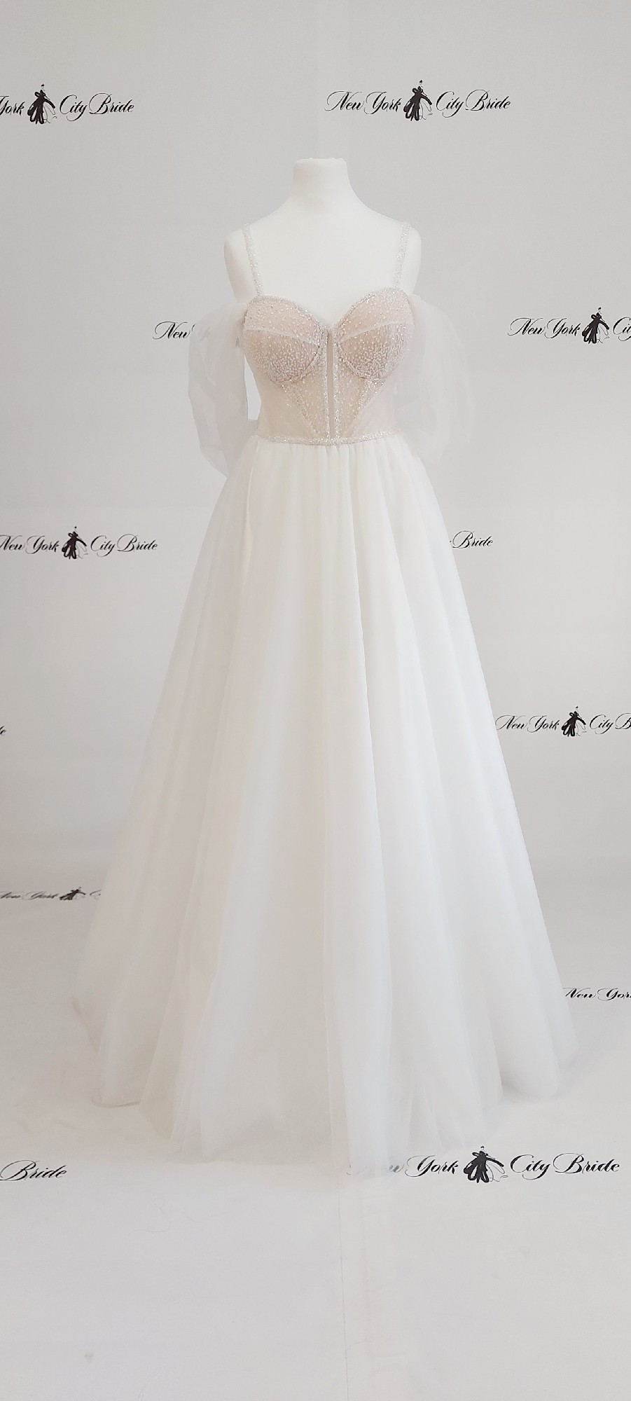 This romantic A-line wedding gown features a dreamy off-shoulder design with soft, airy tulle sleeves that drape beautifully over the arms. The structured bodice is delicately embellished with subtle beading and a semi-sheer corset detail that adds both support and a touch of modern sophistication.