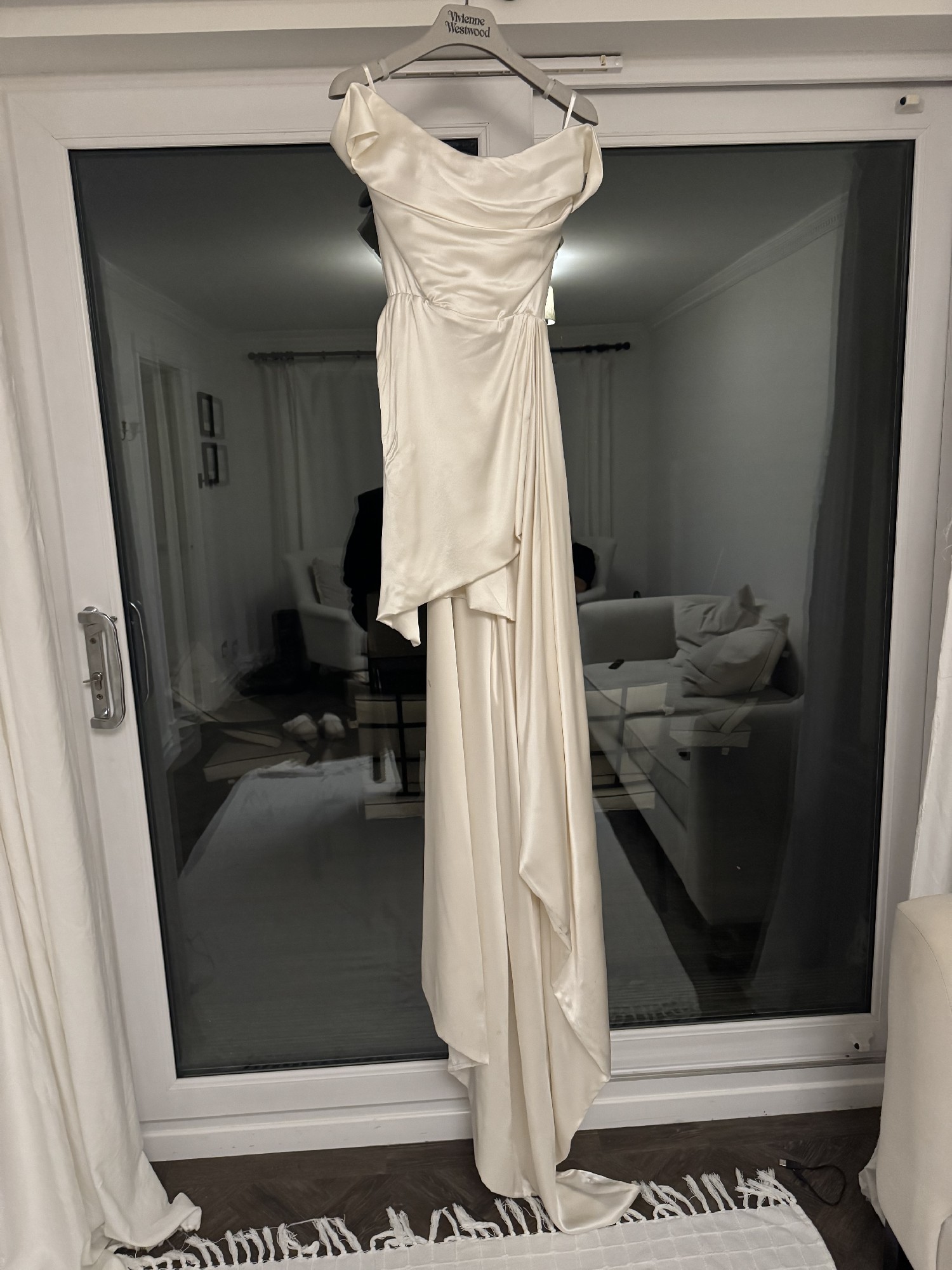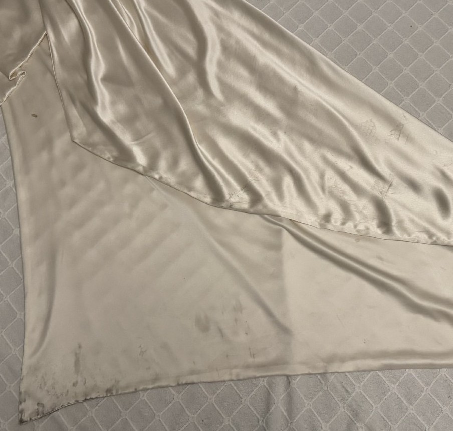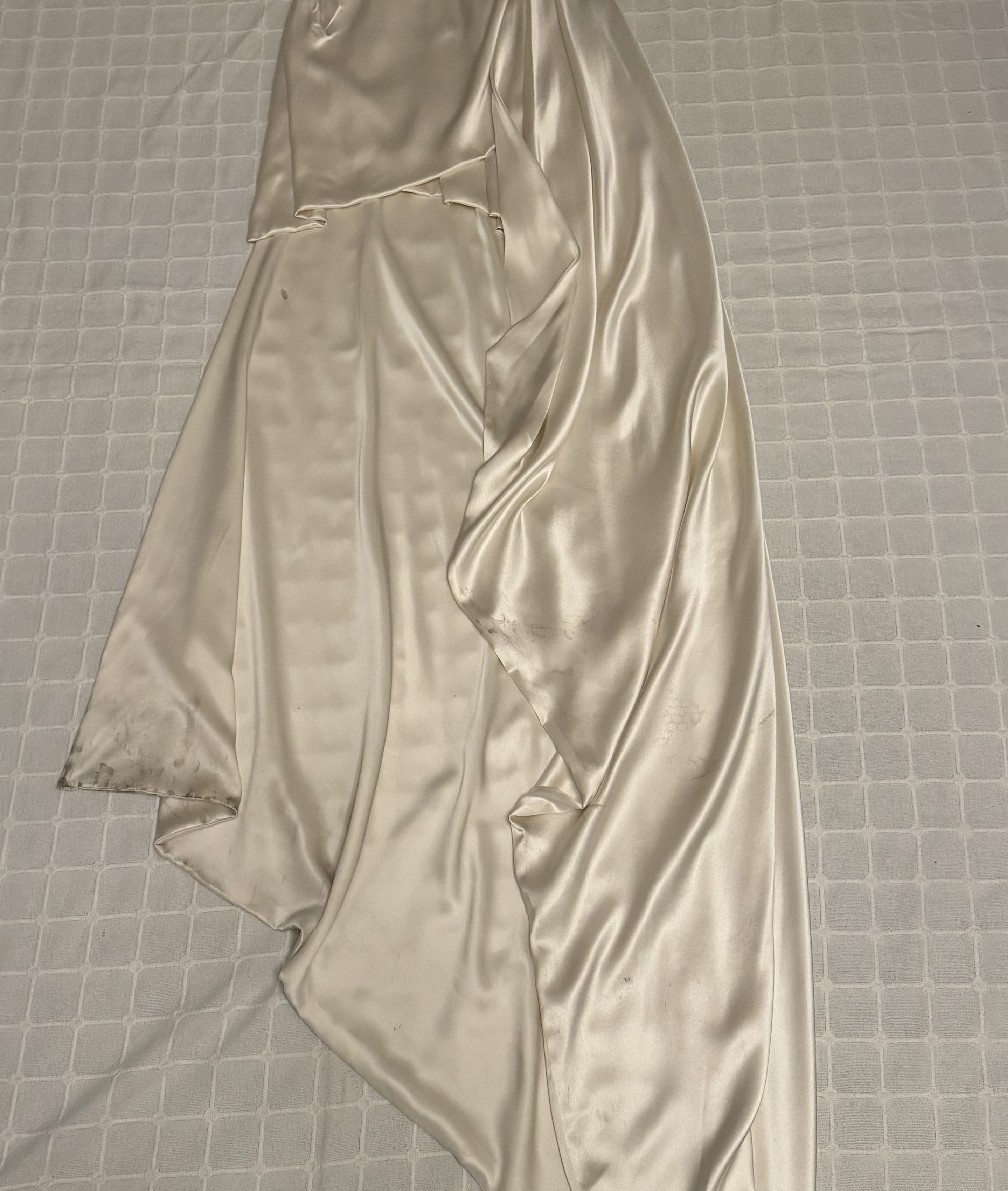 Beautiful silk Vivienne Westwood dress worn once. No alterations to the dress but a wrist loop has been added. Train has some markings - mainly on the inside on the train and at the bottom (please zoom into photos . can send more if needed)
