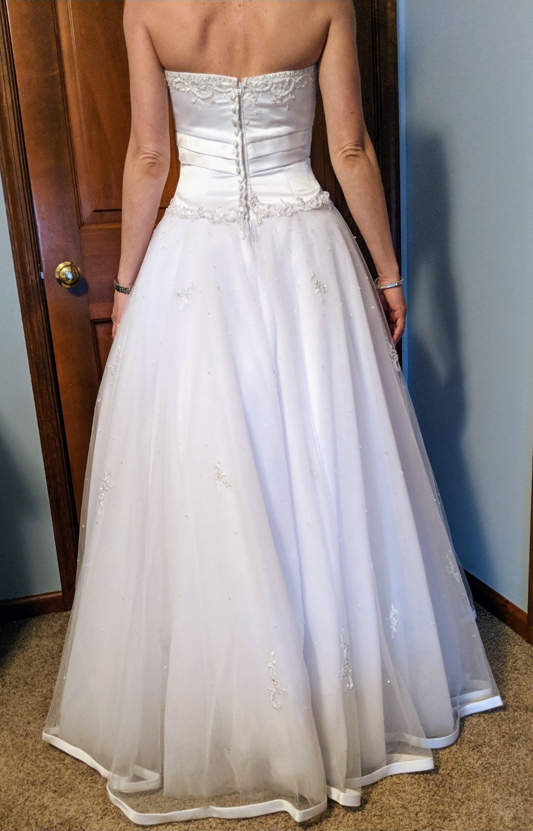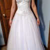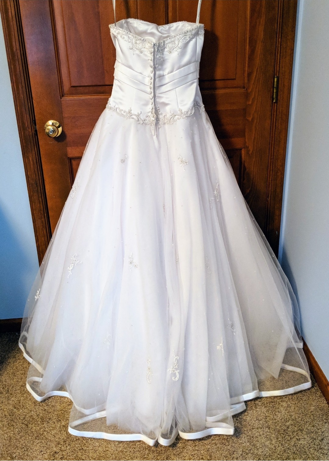 This gown has a classic princess silhouette with a flattering, structured fit. The beadwork is stunning and photographs beautifully. Alfred Angelo gowns are no longer manufactured, making this a rare, in-demand style.