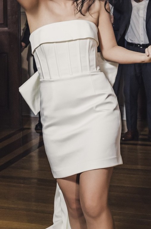 The perfect reception and party dress with boned bodice and back draped bow accent. The dress is made of heavyweight crepe fabric.