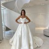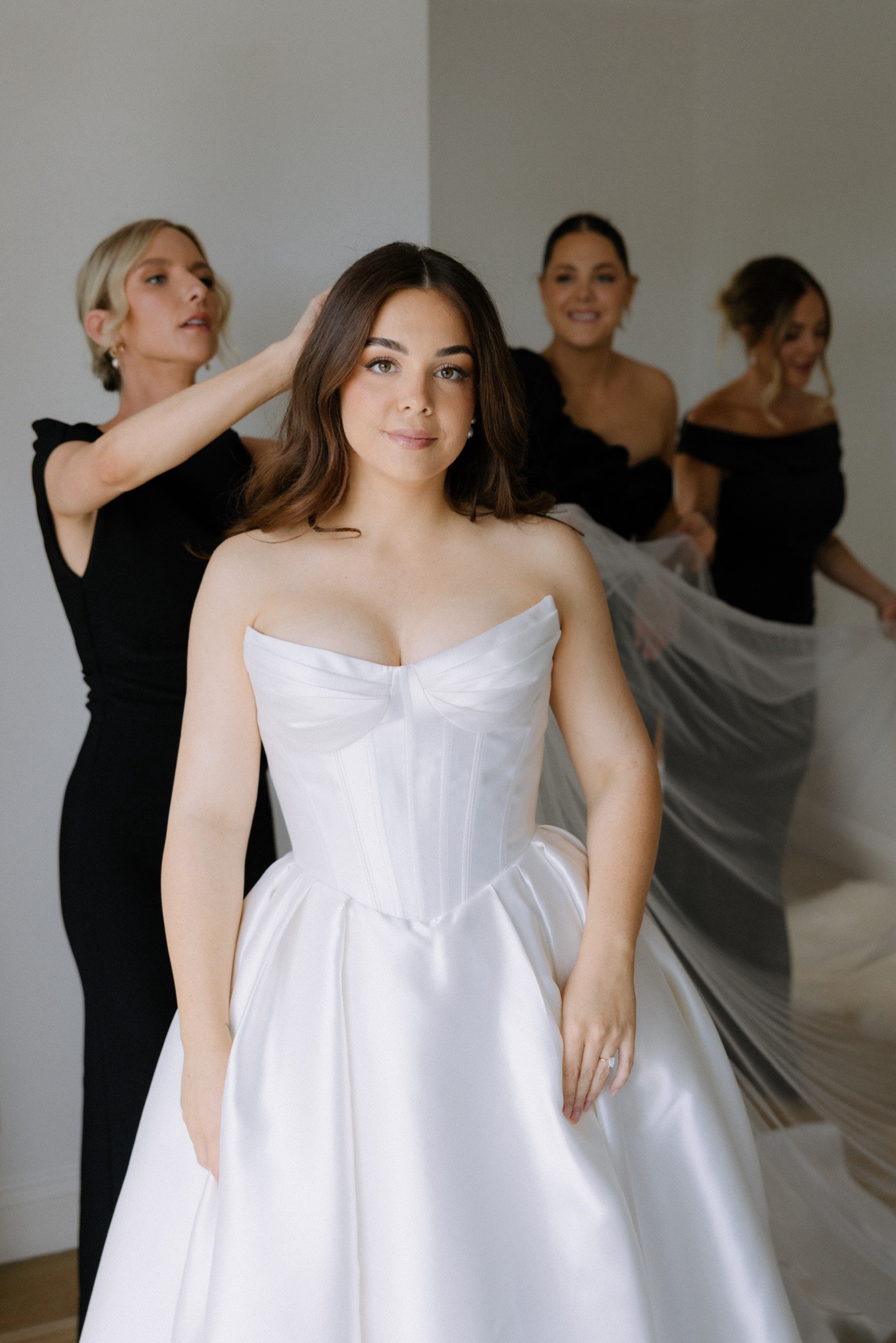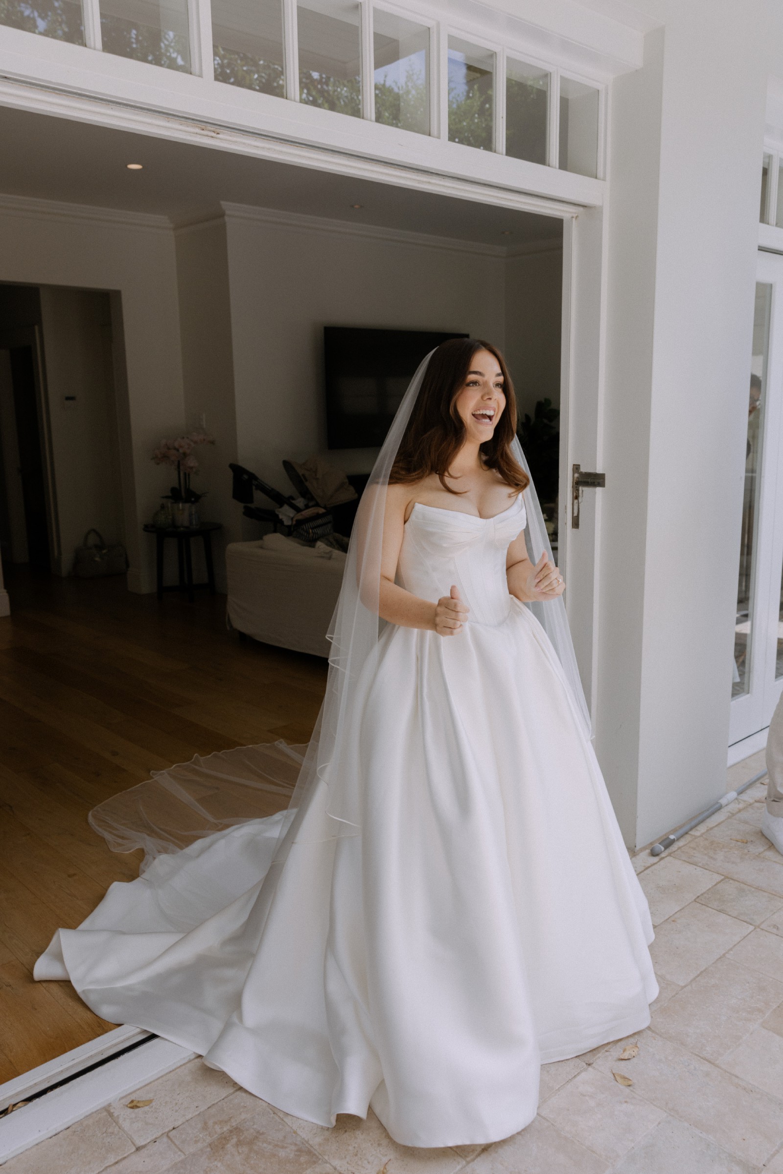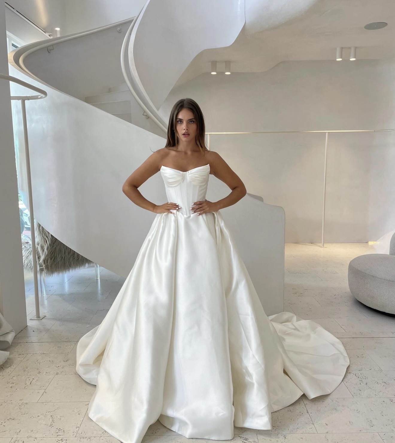 The low back detail adds a hint of allure, striking the perfect balance between modesty and sophistication. I loved how the strapless design allowed me to move freely and showcased my arms gracefully. The floor-length draping creates a breathtaking look as it flows seamlessly with every step, making it a timeless choice for any bride.