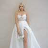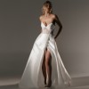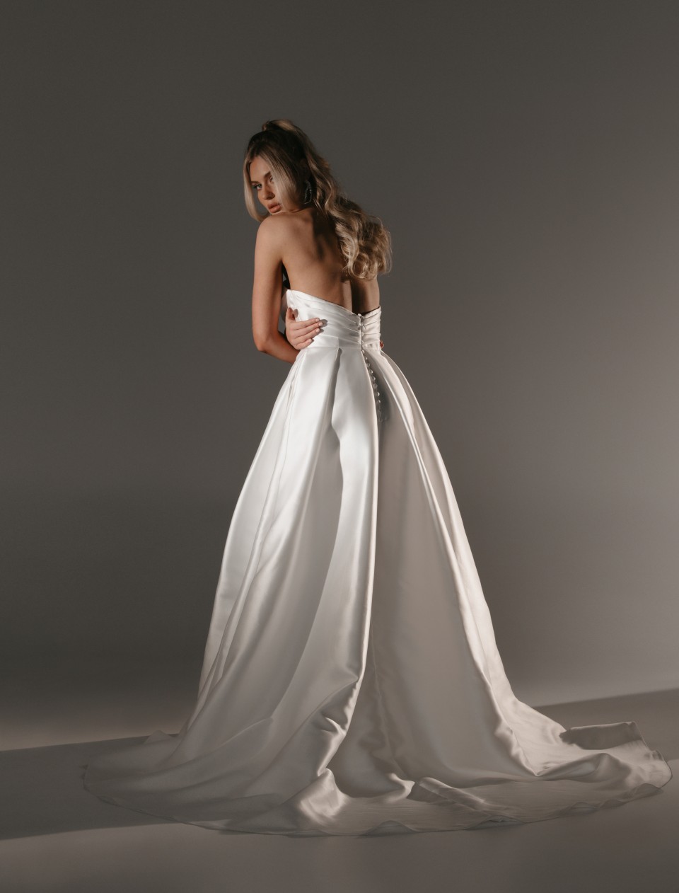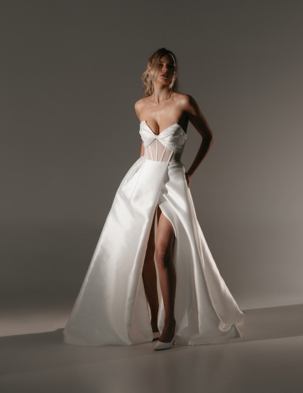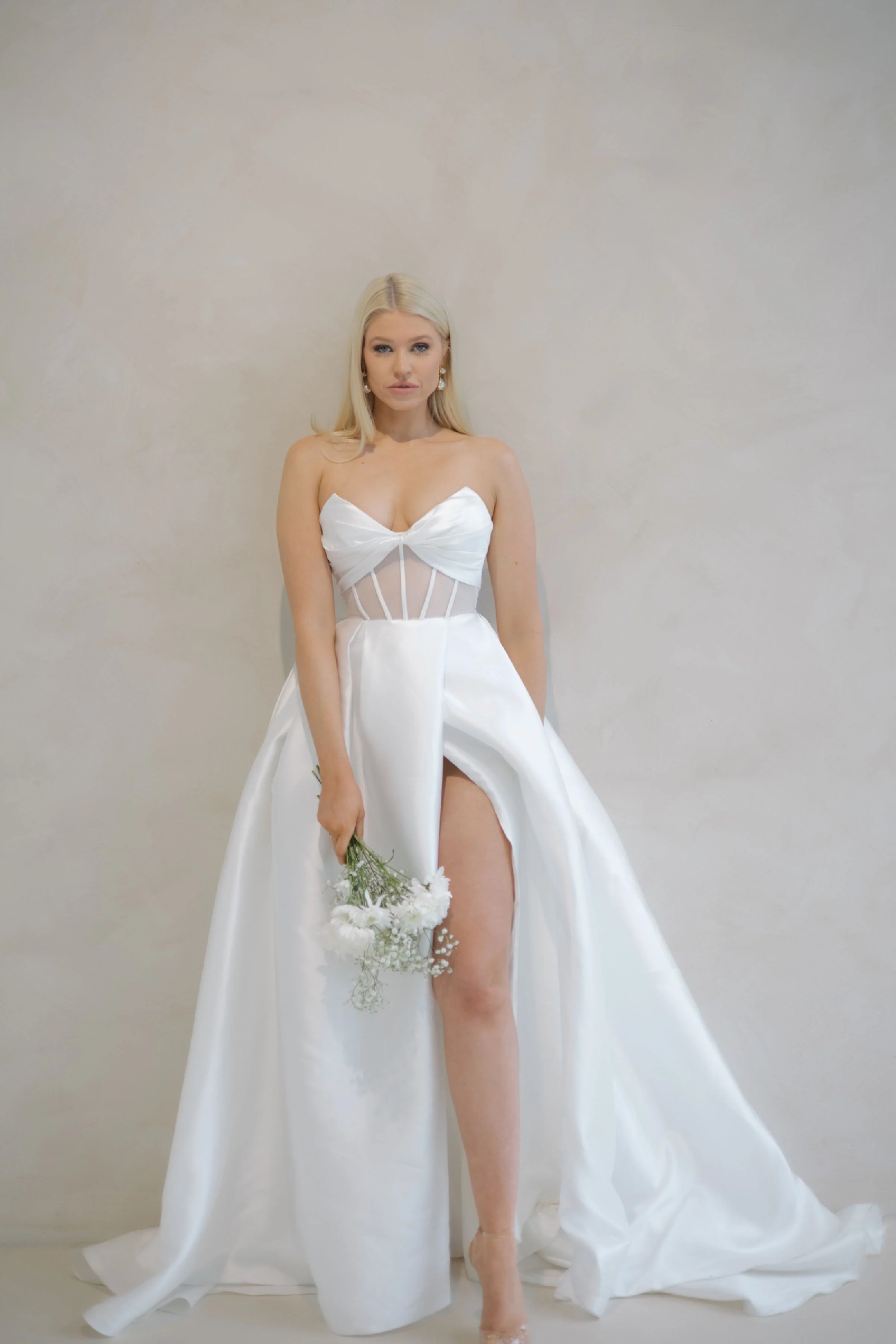 Channel classic charm with a dash of modern mischief. Features a structured sheer corseted bodice with a draped twist knot detail and a dramatic full skirt revealing a split. Also features hidden side pockets for a dose of functional elegance.