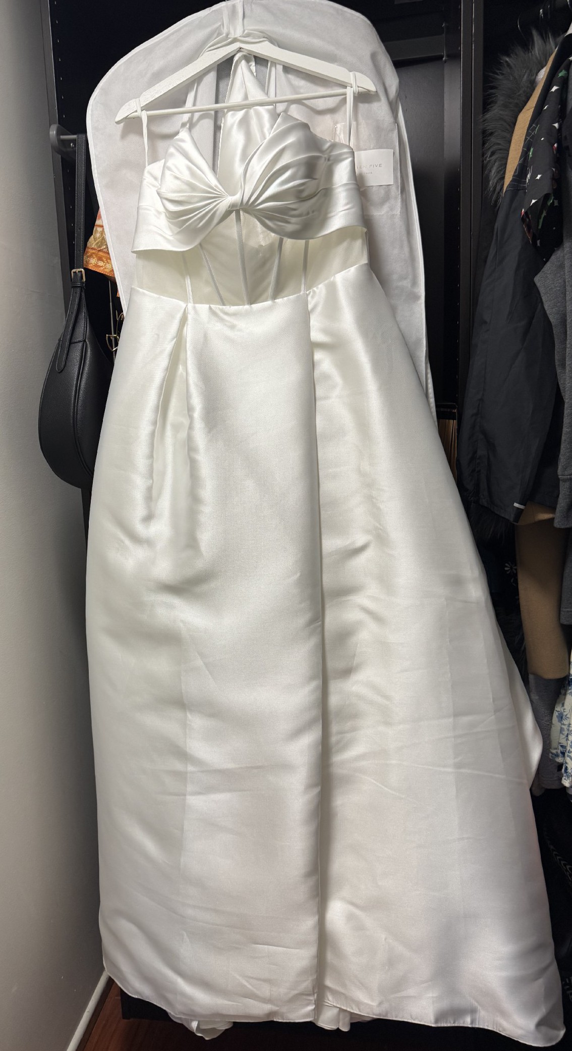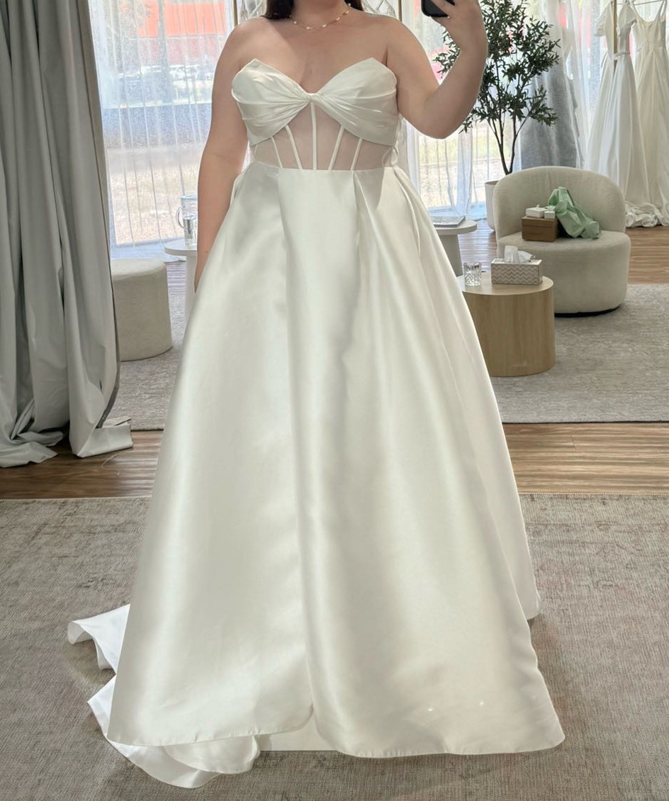 Purchased this dress in September of 2024, and officially took her home in Feb/Mar of 2025. Due to falling pregnant and having a baby our wedding plans have changed, so I no longer have a need for this beautiful dress. It is a size 18 in both the bust and waist, and has not been altered or worn.