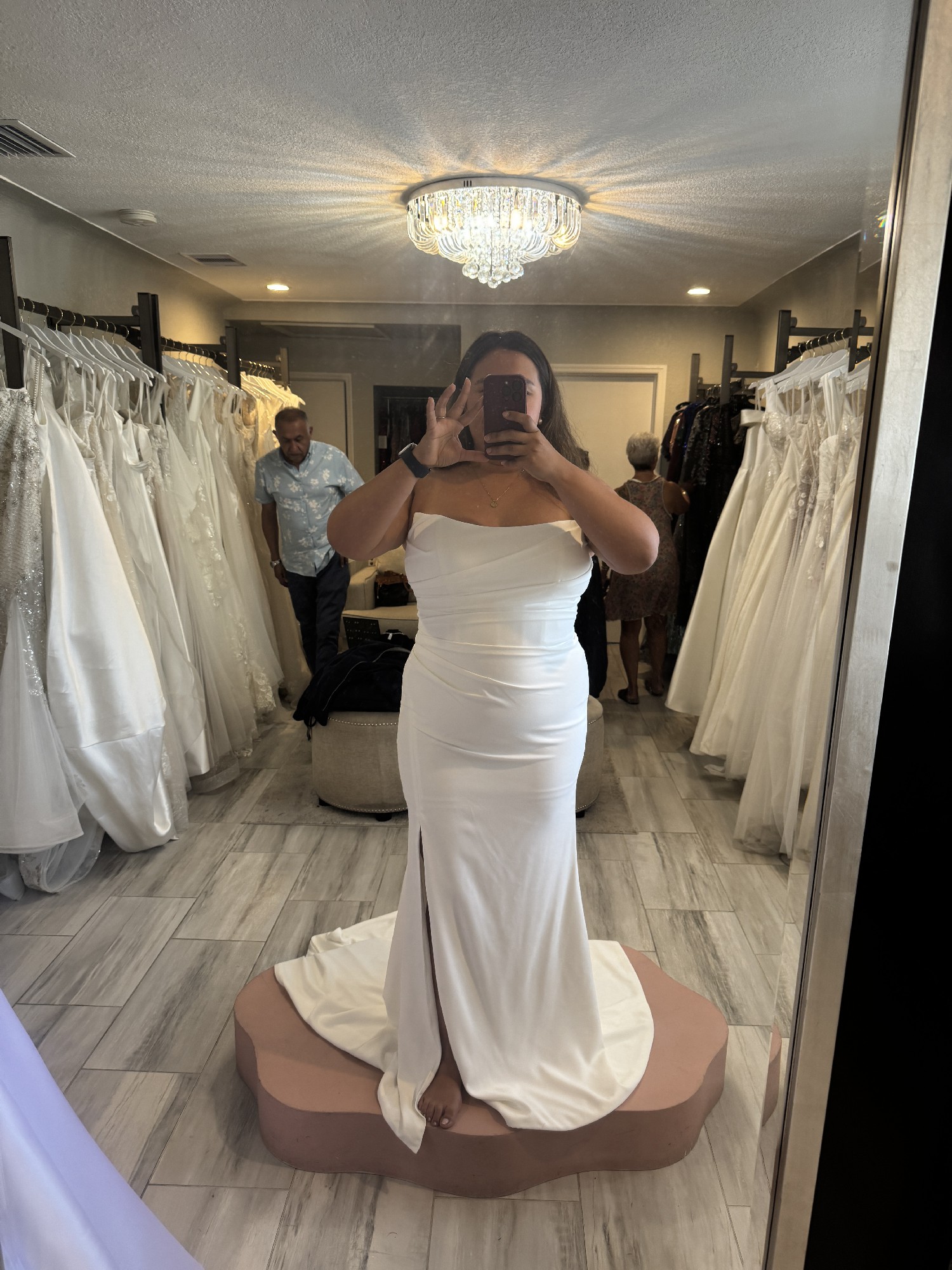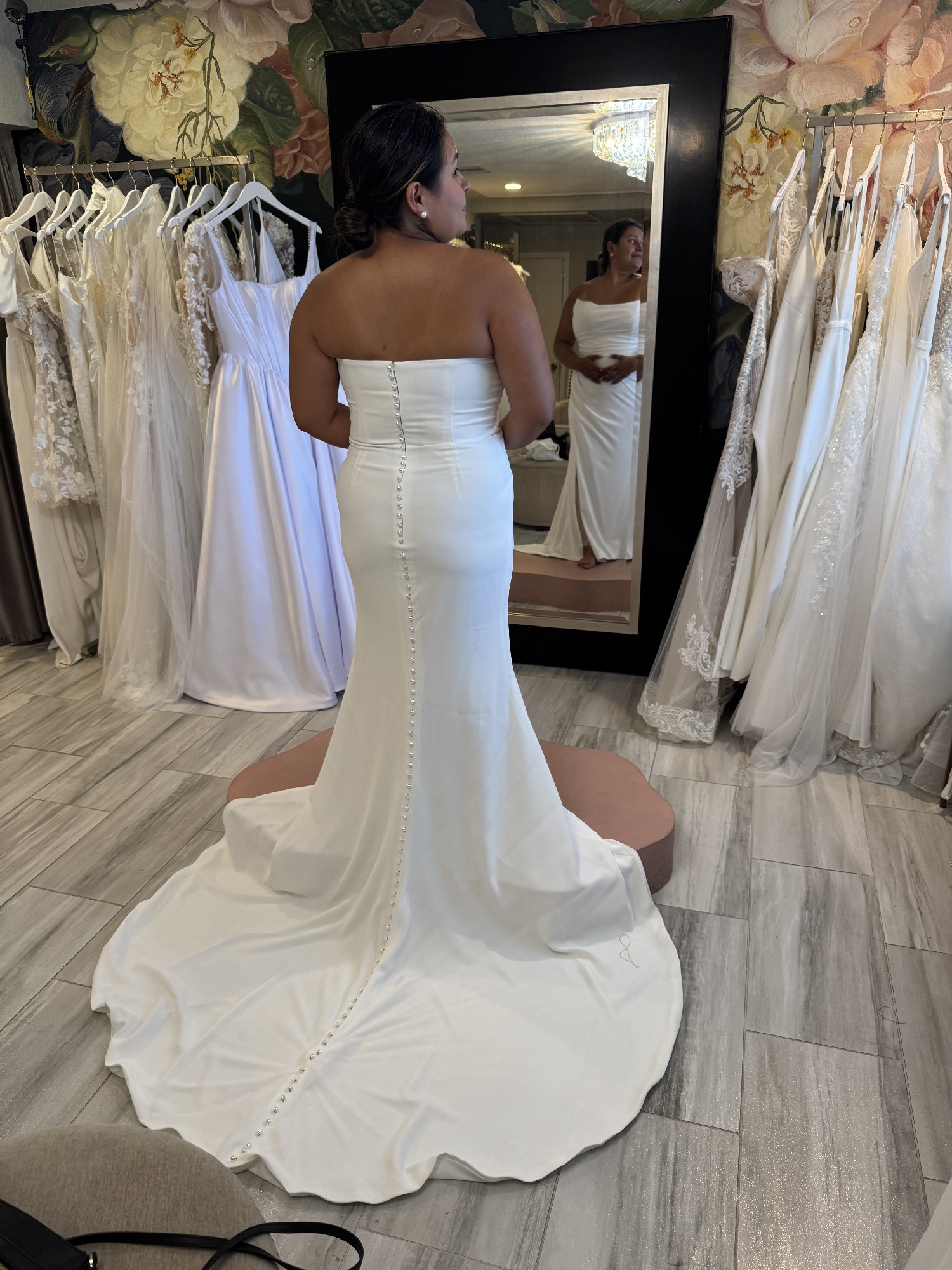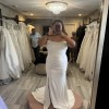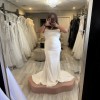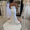 Draped Crepe Gown with Cat-ear Neckline and Slit, beautiful white pearls flowing down the back of the dress.
