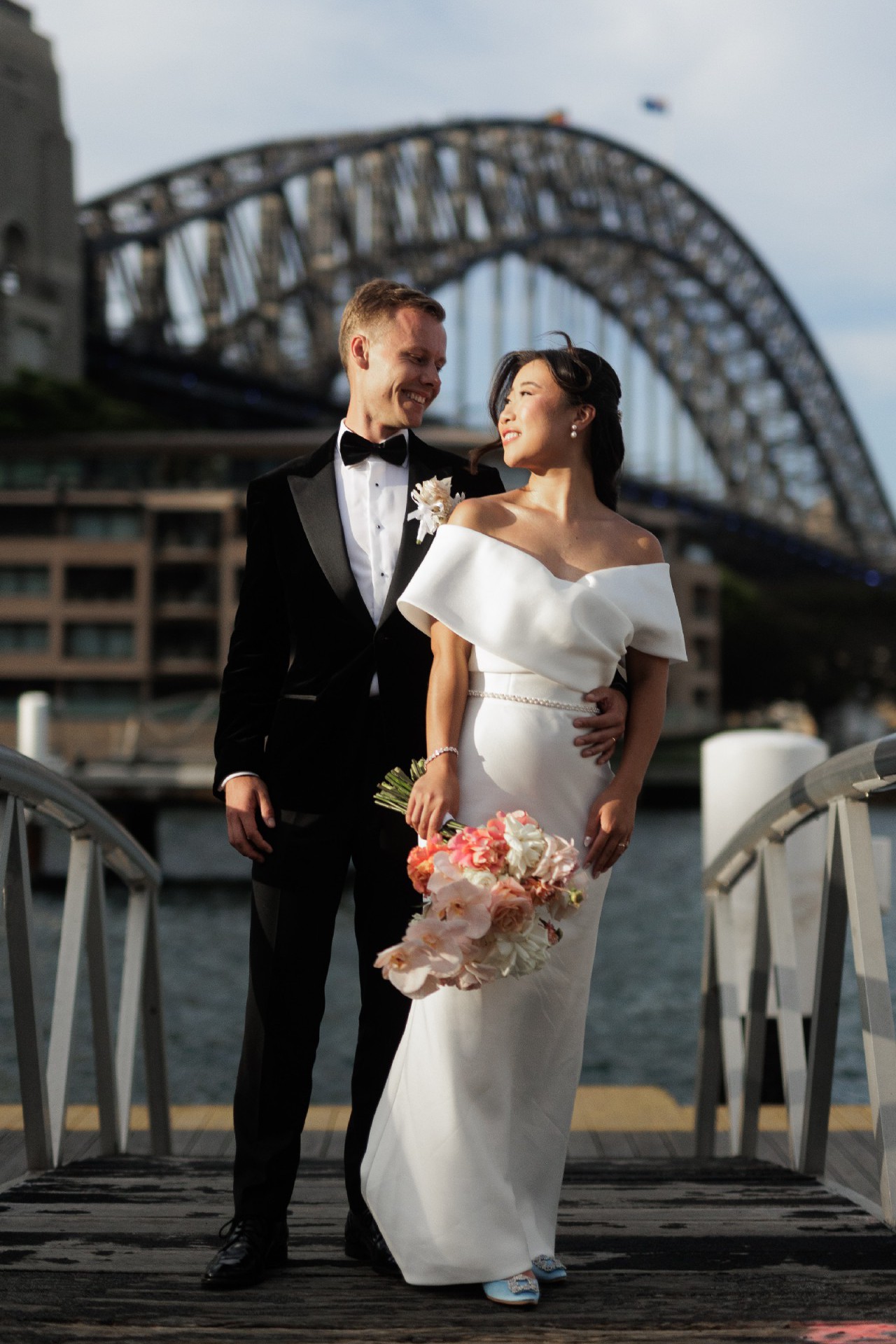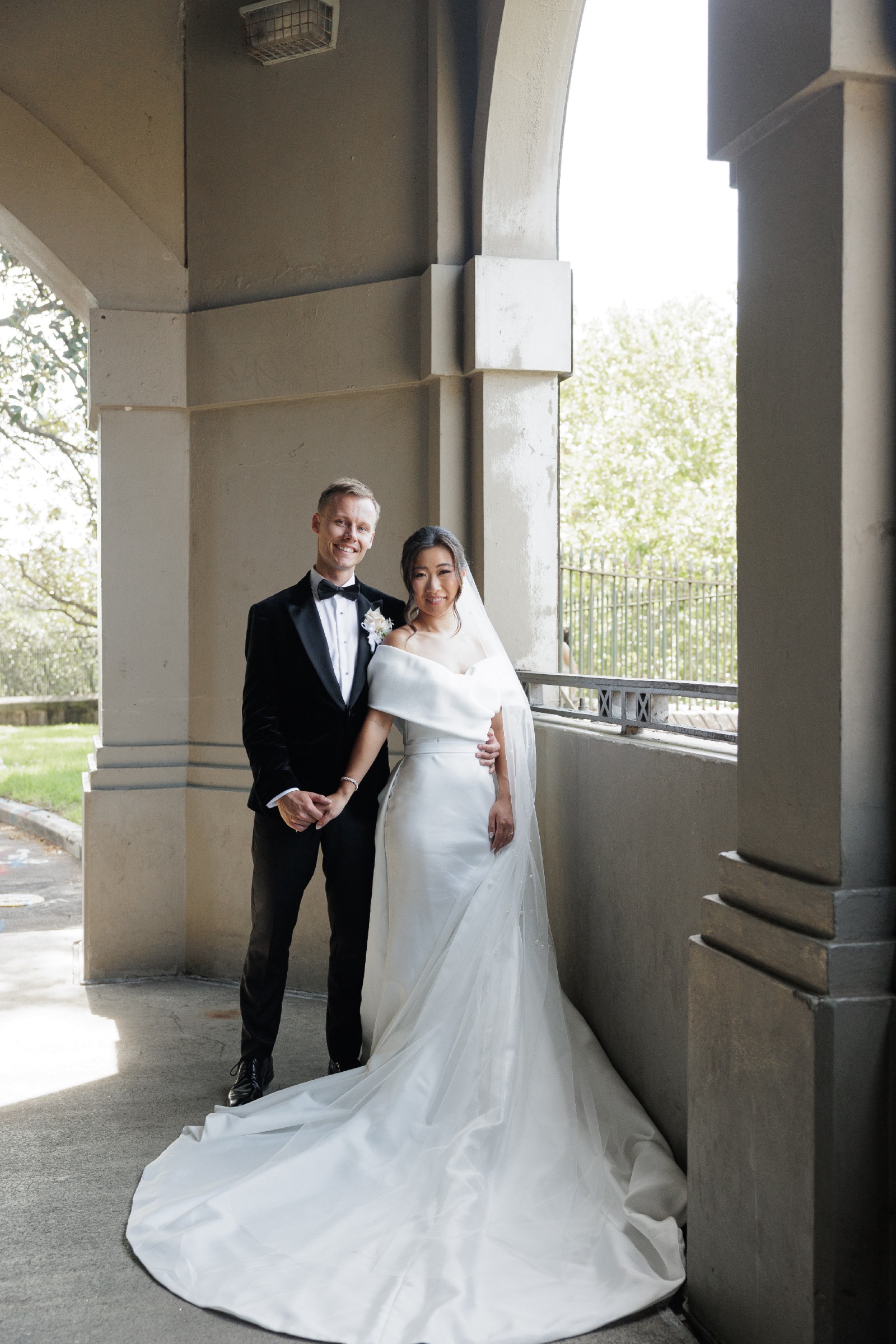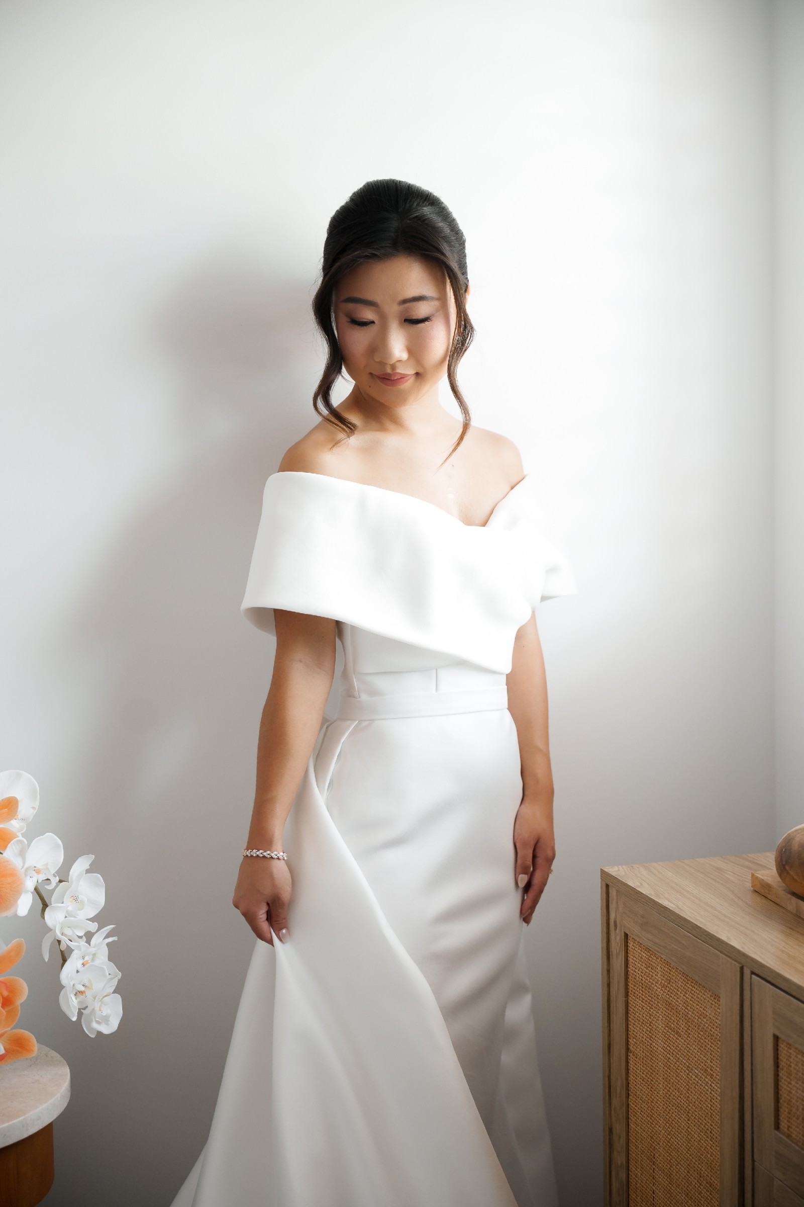 The Jess gown by Eva Lendel is an elegant, figure-flattering wedding dress featuring a stunning detachable overskirt. This sleek dress is crafted from glossy fabric and designed to beautifully highlight your natural shape. The lowered shoulder line and wrap-style décolletage continue around the back, creating a timeless, feminine look.