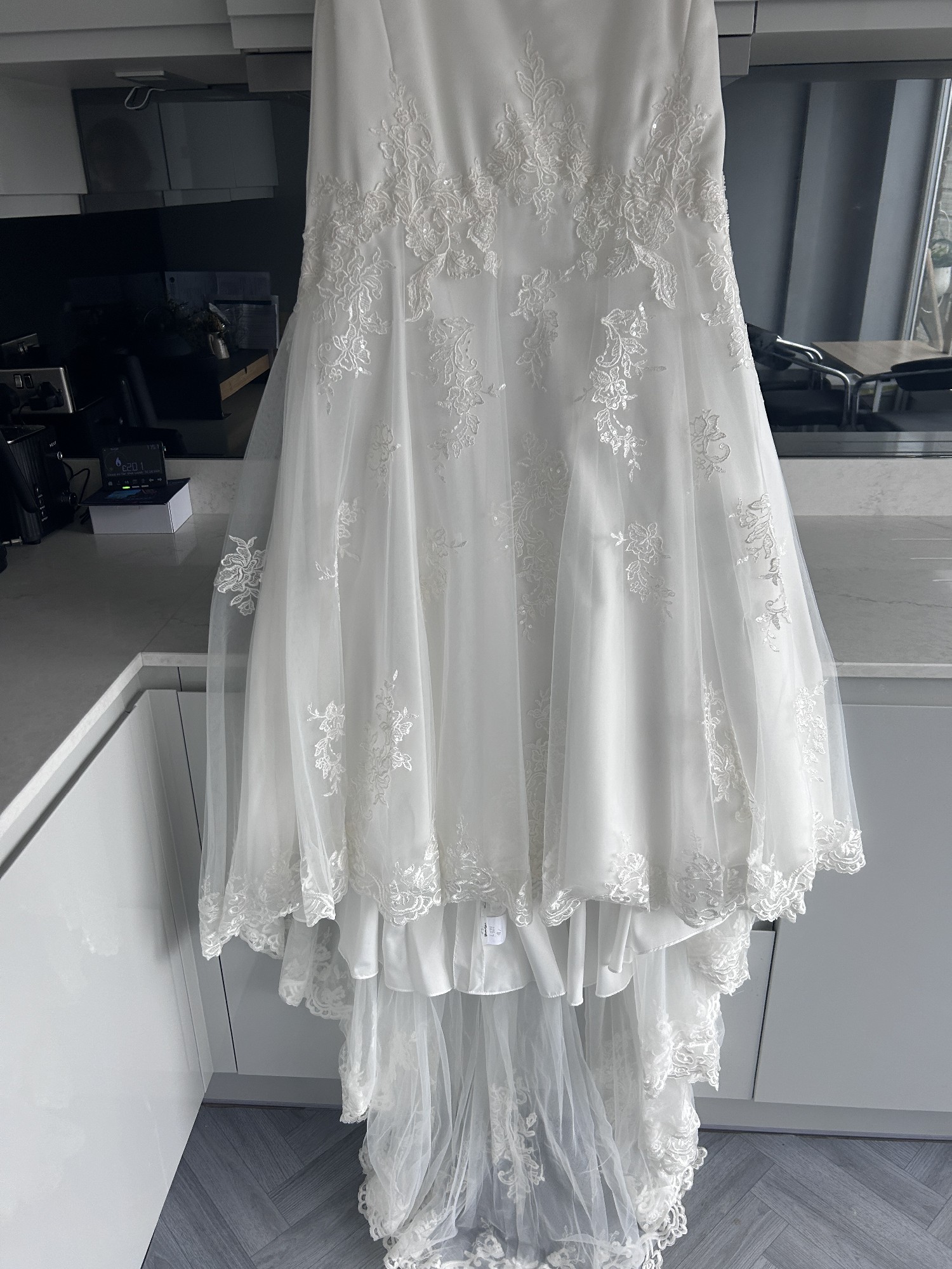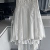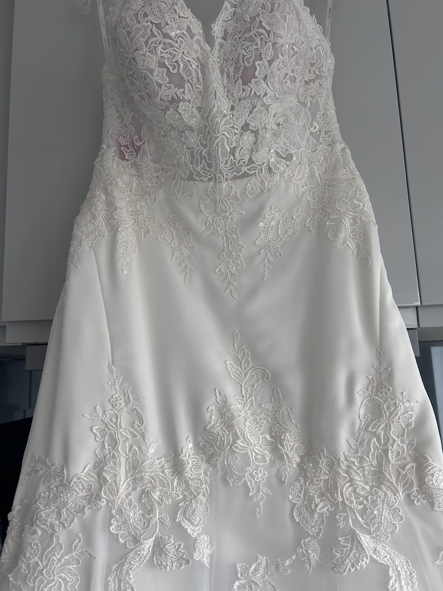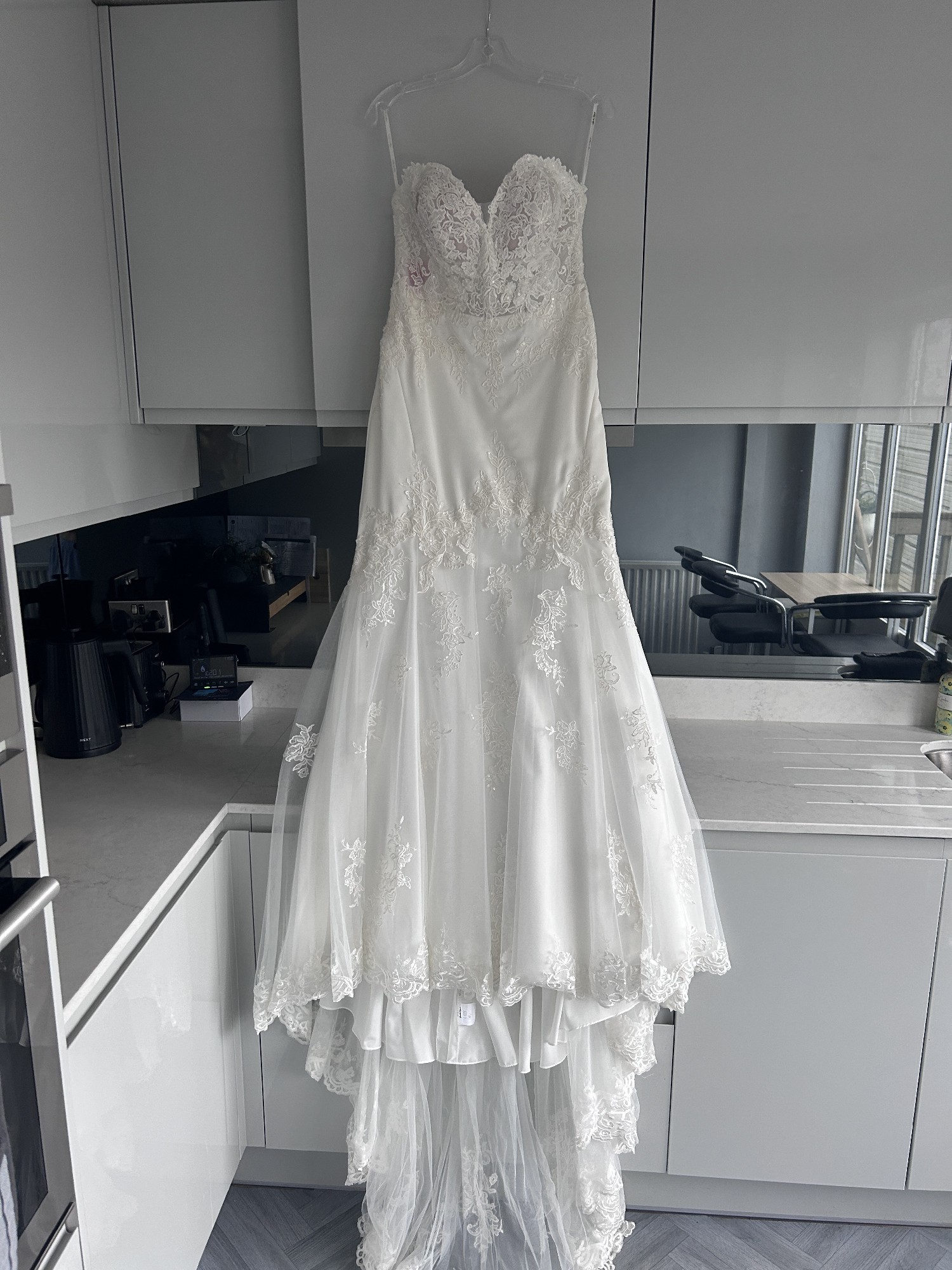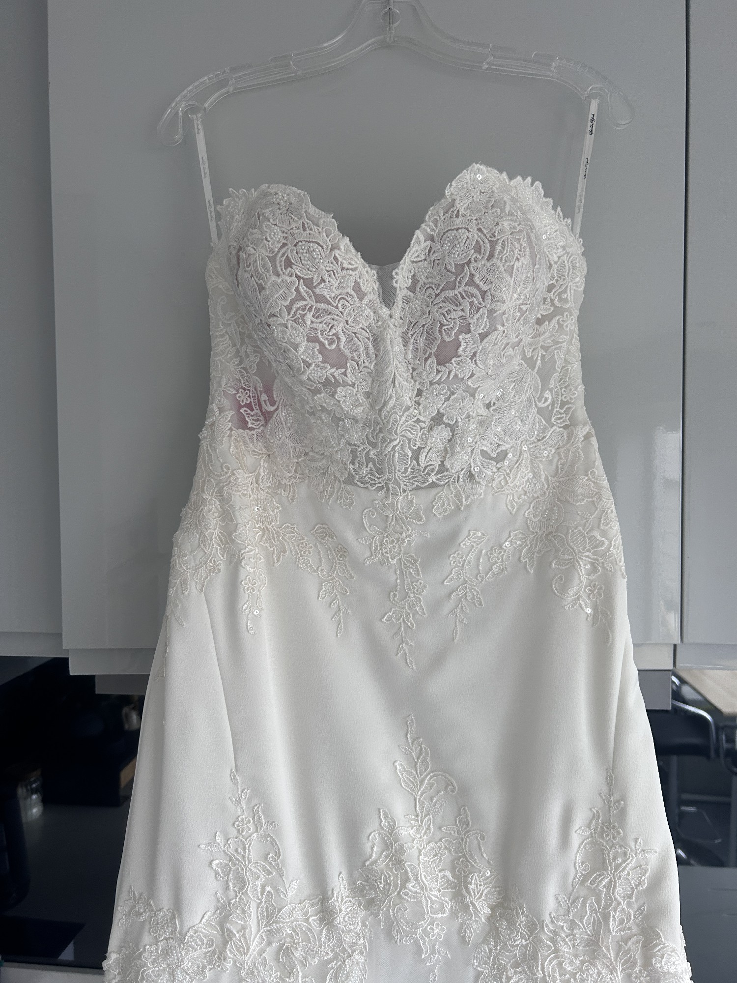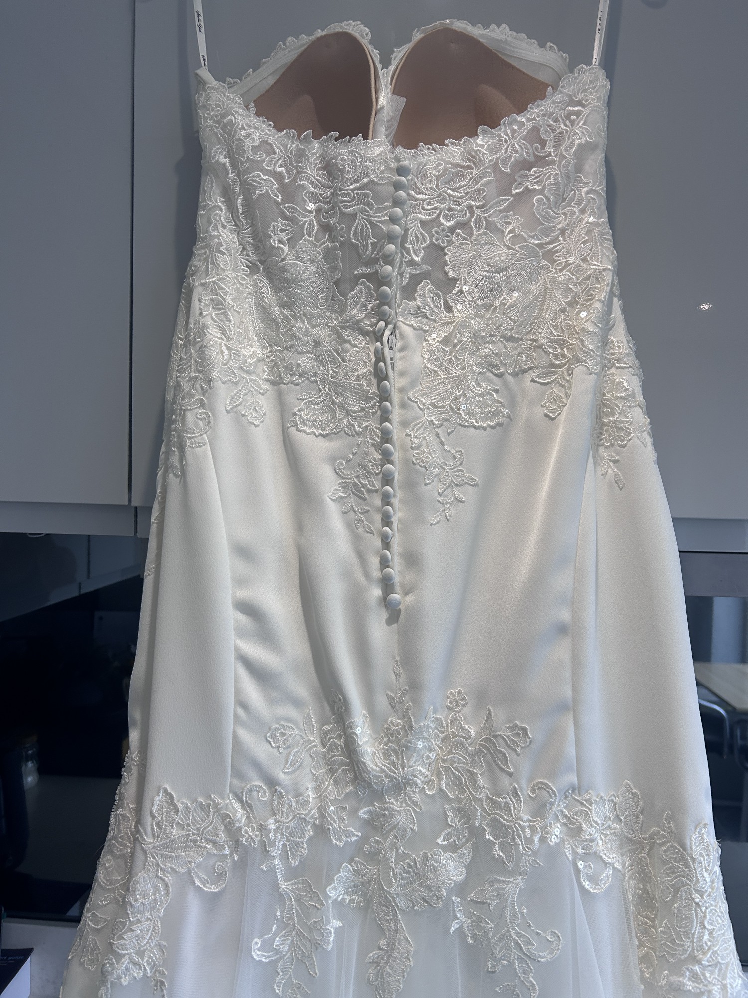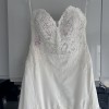 This floor-length gown features exquisite embroidery and delicate sequins that catch the light with every movement, ensuring you sparkle throughout your special day. The low back adds a hint of allure, while the strapless design offers a classic appeal that never goes out of style. Size 14, this dress is designed to make you feel both comfortable and confident.