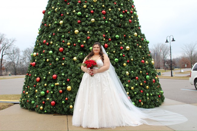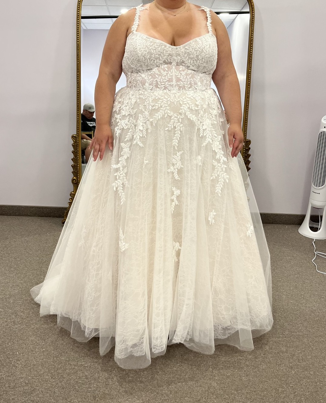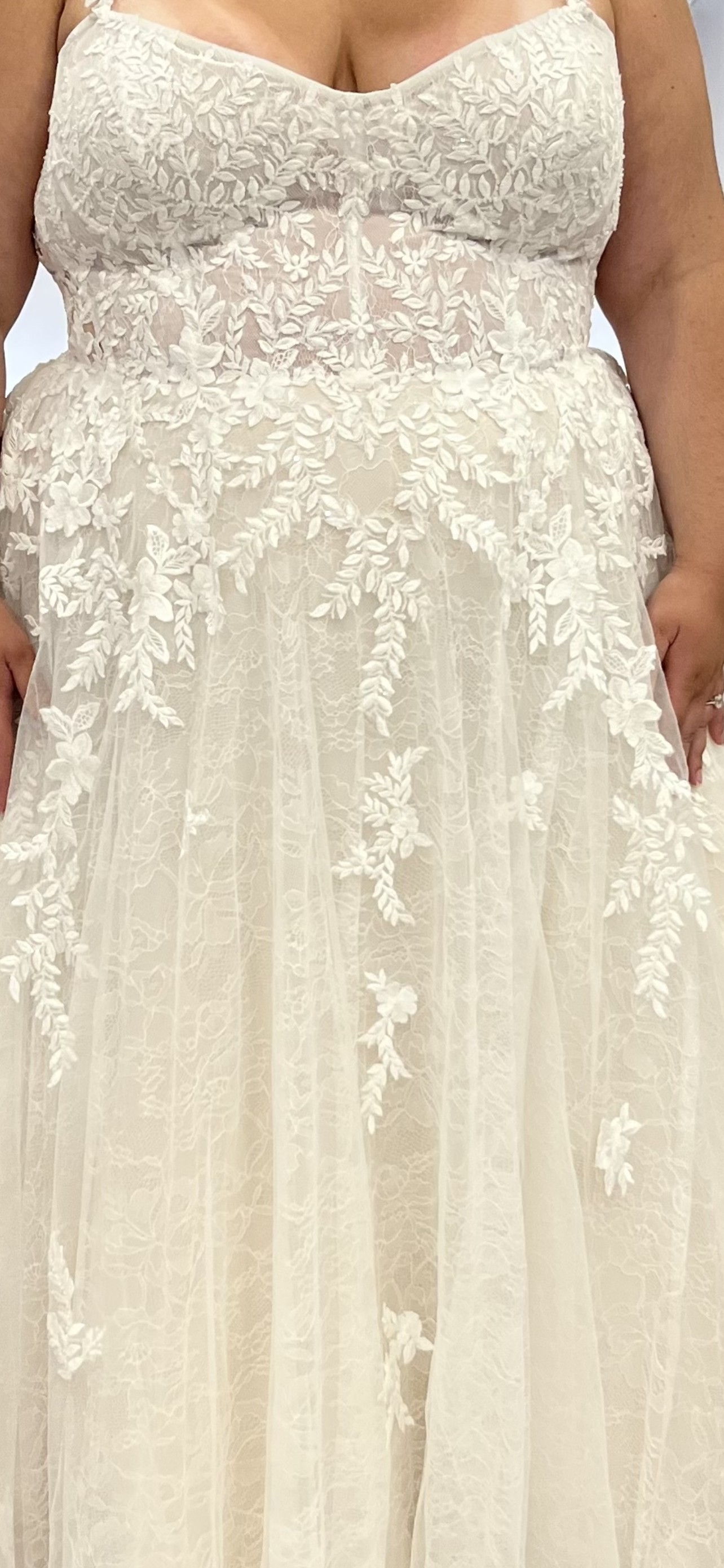 Gorgeous lace and leaf pattern ball gown. Only worn for two hours for my small ceremony, no damage or alterations whatsoever. Perfect for all seasons!