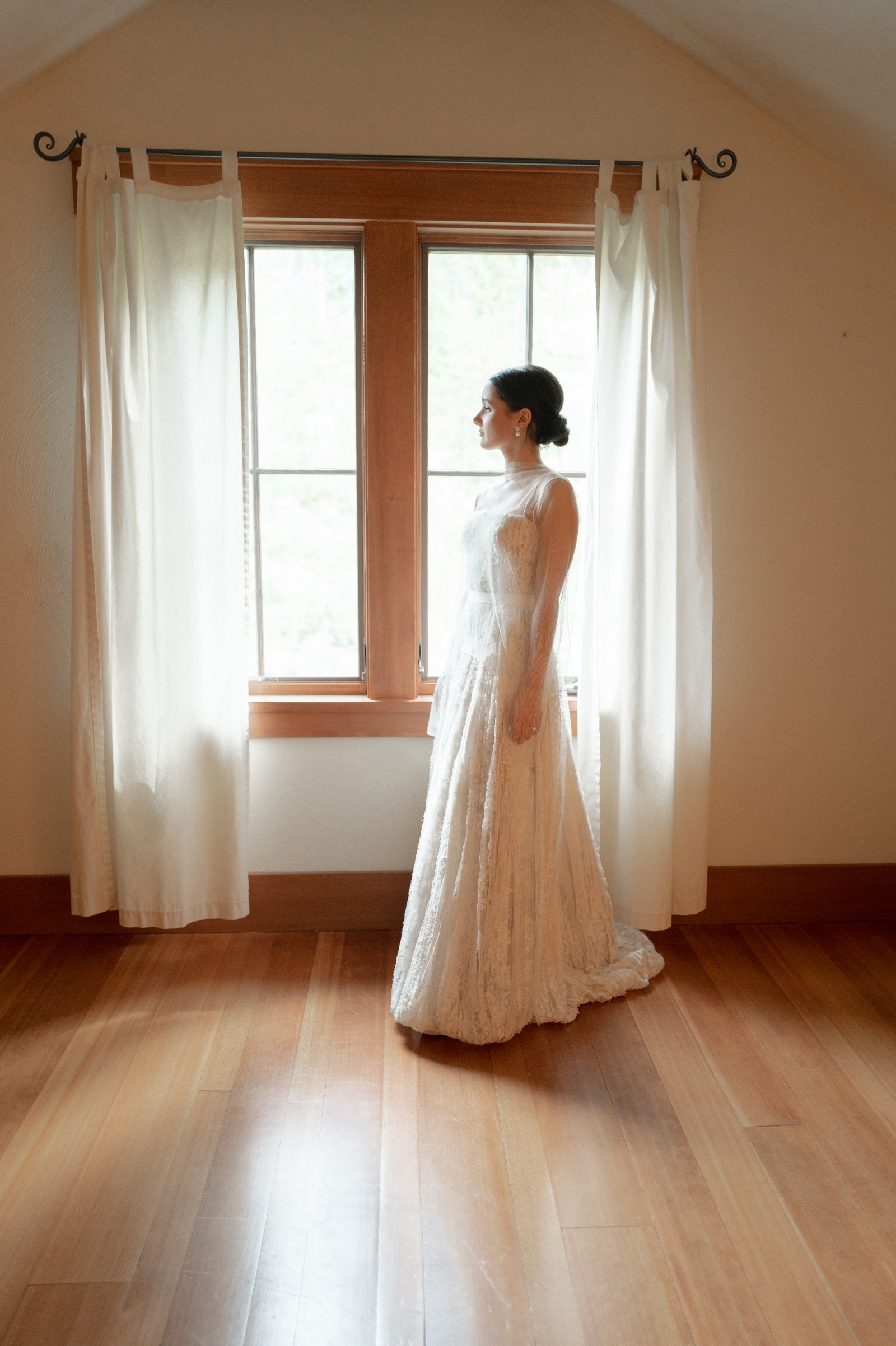 The Marlow gown by Danielle Frankel instantly stole my heart the moment I put it on. This stunning ballgown features a soft scoop neckline and hand-cut Lyon lace strip detailing throughout the bodice and skirt. Layers of delicate Lyon lace cascade into an airy, organic silhouette, finishing in a released bubble-hem train that moves beautifully. The gown includes an internal structured bustier for support and an invisible back zip for a clean, seamless look.