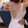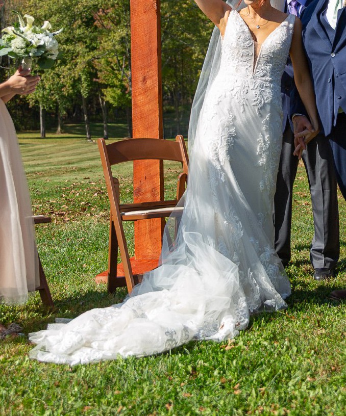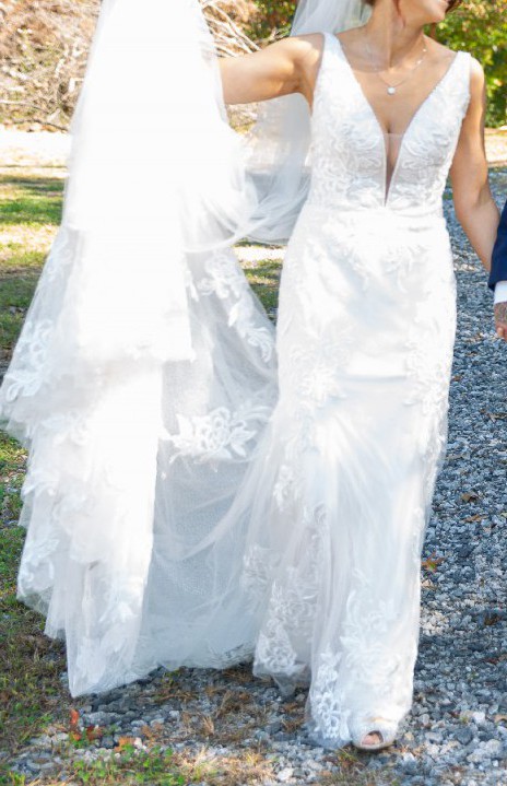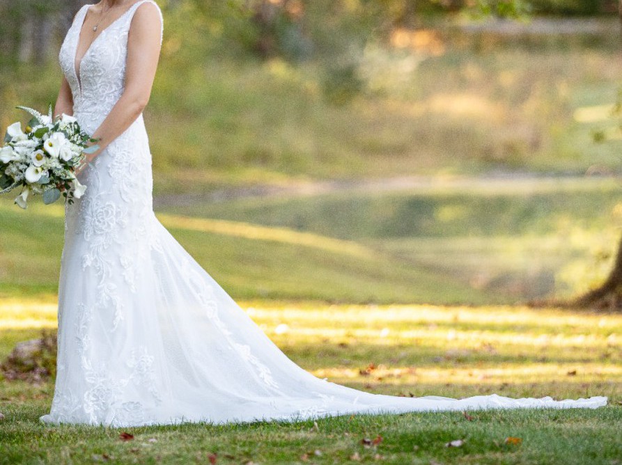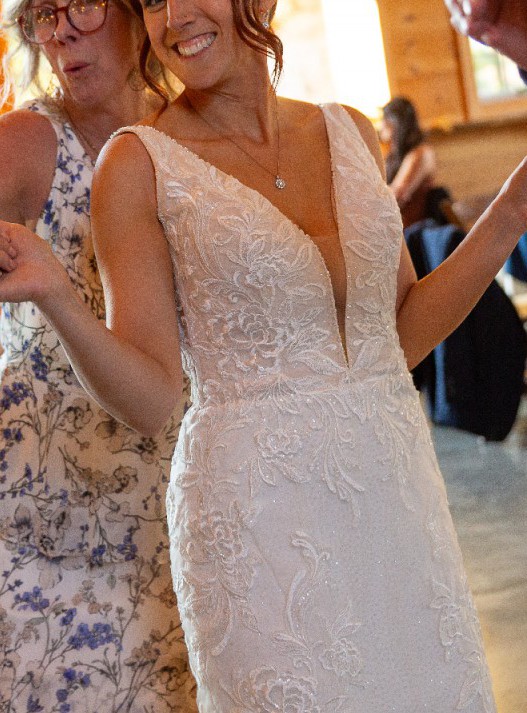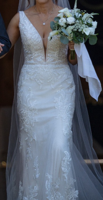This dress was honestly made to fit me like it was made for me. This was originally purchased 10 sizes to big ( it was a final sale ) and it was brought to a brilliant seamstress who make this custom for me. If you measurements are the same size or less than mine, it will be perfect for you. The lining on the long train was removed on order to make it lighter to carry with the custom made wrist bustle option which I used for about an hour before switching to the 7 point bustle for the remaining 3 hours. Only worn for a total of 4 hours. Super duper light and comfortable which was key for me! I can add my cathedral veil and my wedding shoes if you want for an extra $50. I can send those pics during our conversation.